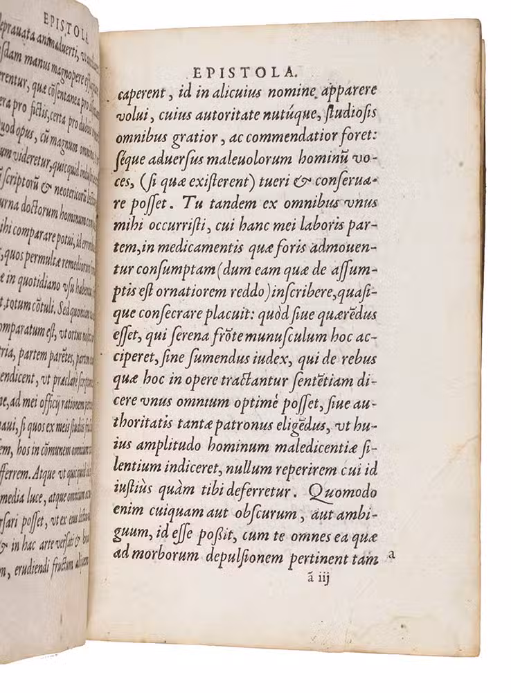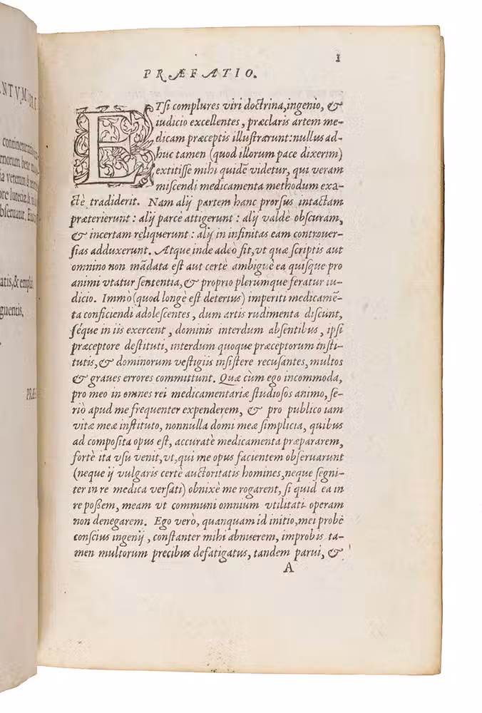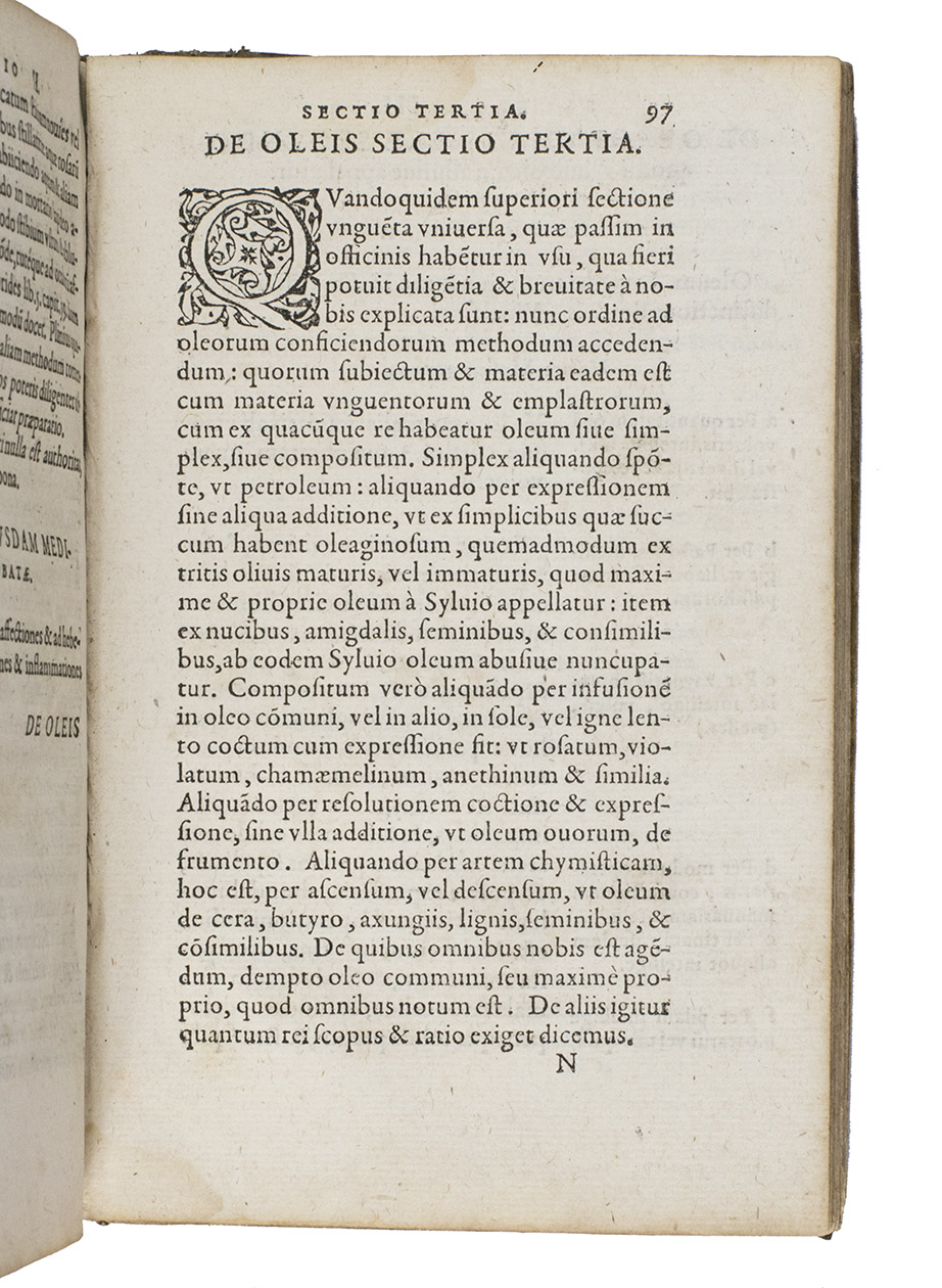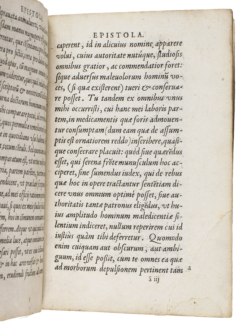 Rare first edition of a pharmaceutical work by Jean Du Boys (ca. 1500-1576), describing everyday medicine as found in the works of the ancient Greeks and Arabs. It gives recipes for different medicines and the attributes ascribed to the medicines and herbs. Jean Du Boys was born at Lille, studied at Louvain and practiced at Valenciennes. In 1562 he became professor at the recently founded University of Douai. He is the author a few other works. As he is occasionally also called Sylvius, he is not to be confused with Jacques Dubois Sylvius (1478?-1555), teacher of Vesalius.