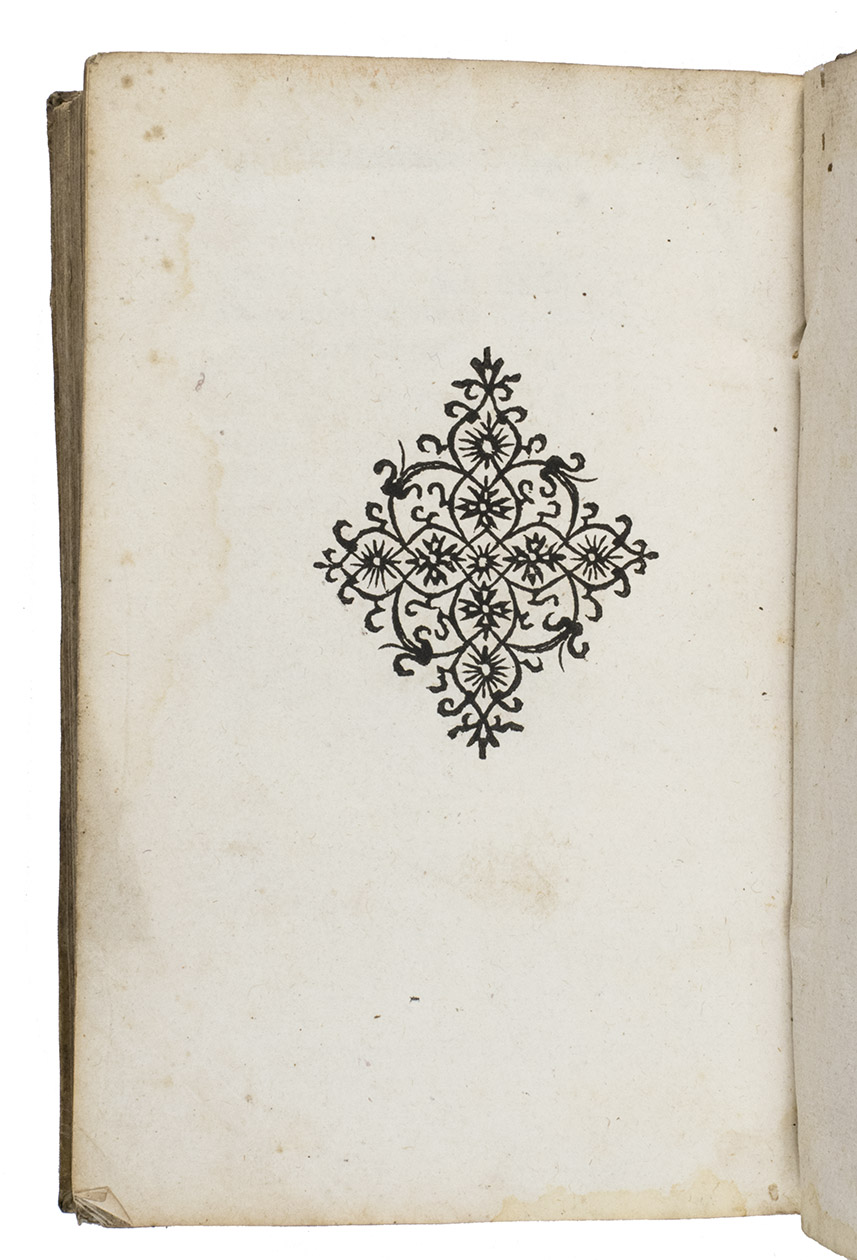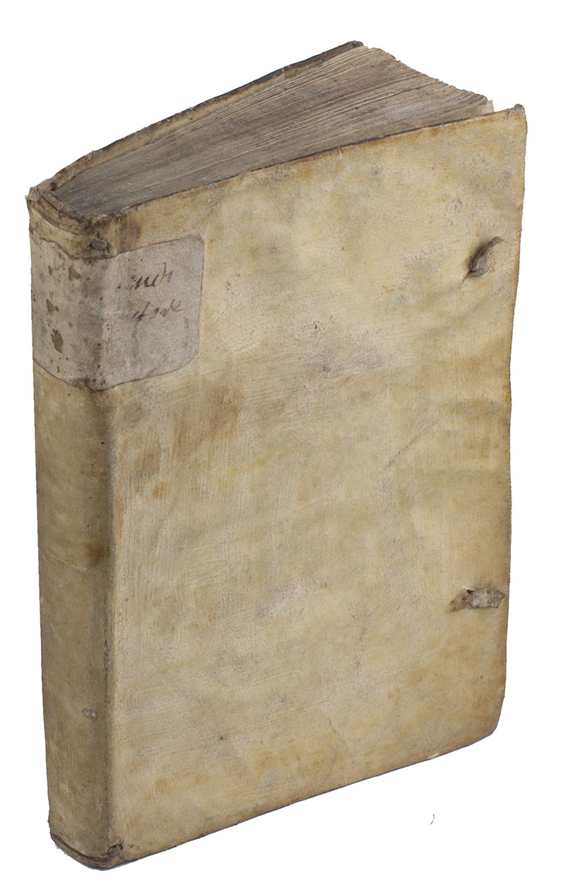 Paris, Jaques Kerver, 1572. 8vo. With Kerver's woodcut device on title-page, depicting a unicorn with the family's arms, and a large cast ornament on the otherwise blank last page. Contemporary limp vellum, traces of ties. [8], 134, [10] ll.