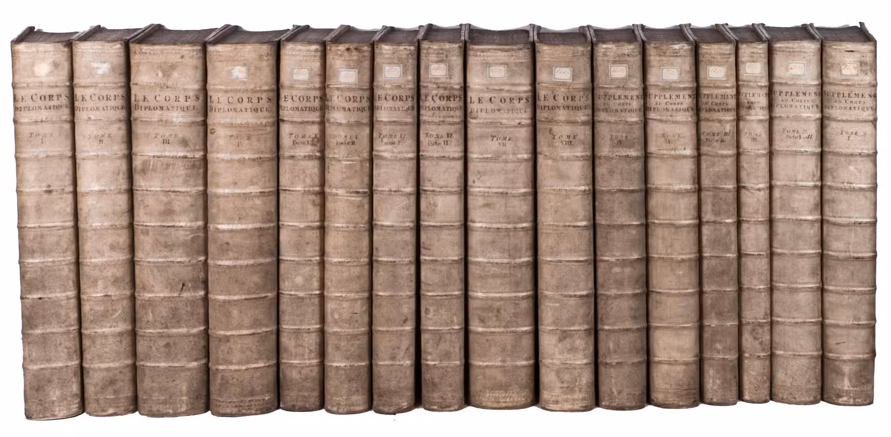 With small labels on the spines and small red and blue library stamps in some volumes of ads 2-4. The bindings are somewhat soiled and show some signs of wear, some foxing and browning throughout the volumes, volume 10 contains the extra gathering 2E2. Overall a very fine set with ample margins. Complete work: De Bure Suppl. I-783; Graesse II, 446; Haag I, 236; Ladvocat I-190; Querard I-176; Ad 1: STCN 166271535 (16 copies, incl. 4 incomplete); Ad 2: STCN 167434462; Ad 3: STCN 167750615; Ad 4: STCN 167279149 (entire supplement STCN 167750615 (13 copies, including 3 incomplete)).
