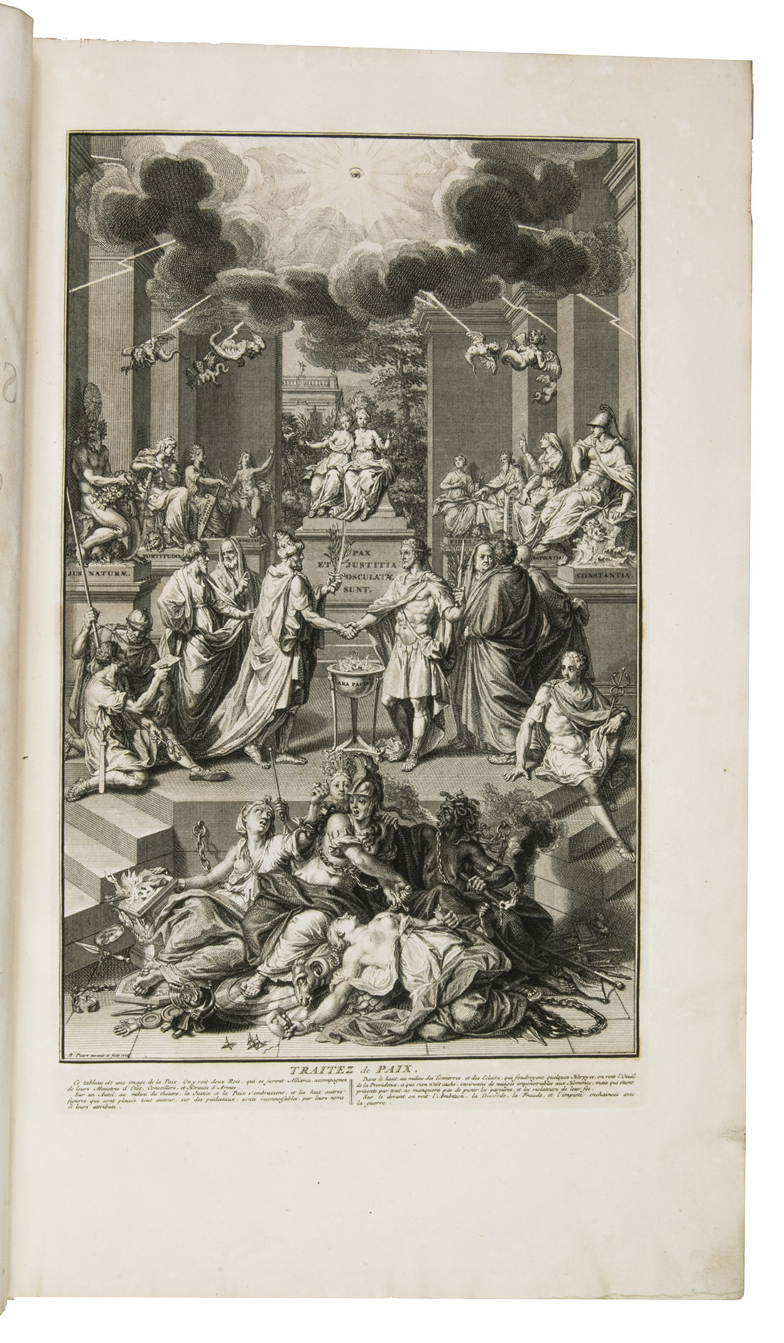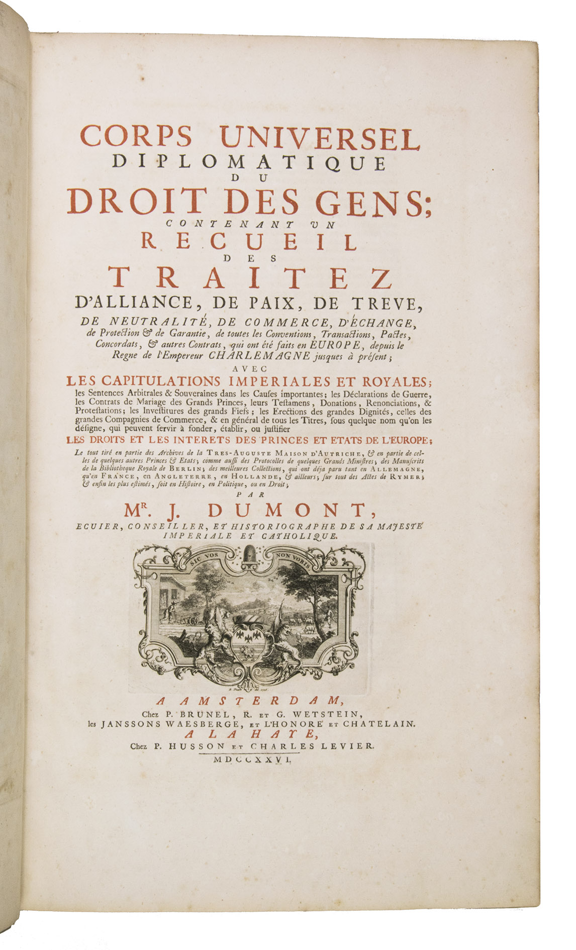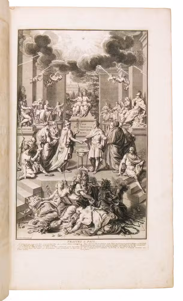 Remarkably comprehensive work on approximately fifteen centuries of international law in Europe. Jean Dumont Baron de Carlscroon, a French publicist and jurist of Charles VI, undertook important and extensive work on the diplomatic corps of human rights. This work was continued by J. Rousset de Missy and J. Barbeyrac in 1739. The collection includes treaties in French, Latin, German, Dutch, from 315 to 1730 CE, all in their original language. Jean Barbeyrac's supplement, found in the first volume, contains treaties from antiquity. Dumont's compilation of European treaties is a valuable source for the history of Europe. The text is printed in a beautiful two-column format with different types and wide margins. In addition to treaties and deeds, the volumes contain in-text depictions of seals or royal cyphers. The first volume also features an engraved frontispiece and an engraved device showing a rural scene, both by B. Picart, as well as an engraved plate featuring the temple of Janus. The volumes stop respectively in 1358, 1436, 1500, 1555, 1630, 1666, 1700, and 1730. Each volume is divided into two to three parts, with each part having its own chronological table. Rousset de Missy's contribution to the collection focuses on treaty obligations contracted by sovereign entities and links them to an analysis of their long-term geopolitical interests. His synthesis at the end of each section reflects the diplomatic practice of his time.