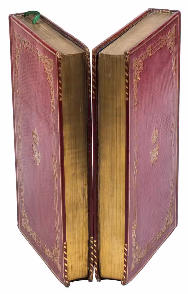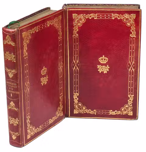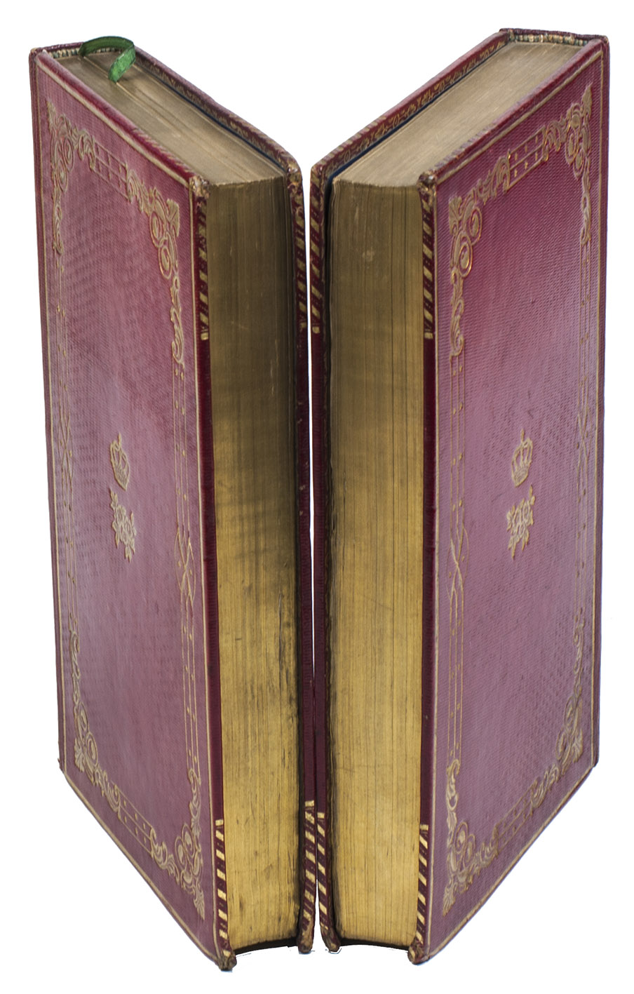 [Bordeaux], Edmond Ramadié, [1839-1840, with the authors 1843 printed dedication to the Dutch Queen Anna Pavlovna of Russia]. 2 volumes. 8vo. With 2 copies of the 4-page 1843 dedication to Queen Anna Pavlovna printed on heavy wove paper, signed by the author in brown ink on the first and last page and tipped onto the title-page in each volume. Contemporary finely diced (in horizontal lozenges) and gold-tooled red morocco for presentation to the Queen, (each board with a crown above flowers as centrepiece, and a decorative frame built up from separate tools; the spine with the title and volume number in the middle with decorations above and below), gold-tooled board edges, gilt edges.