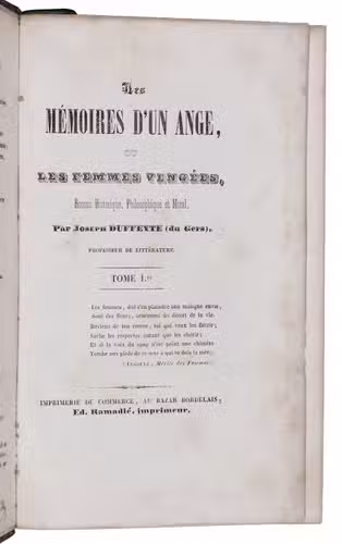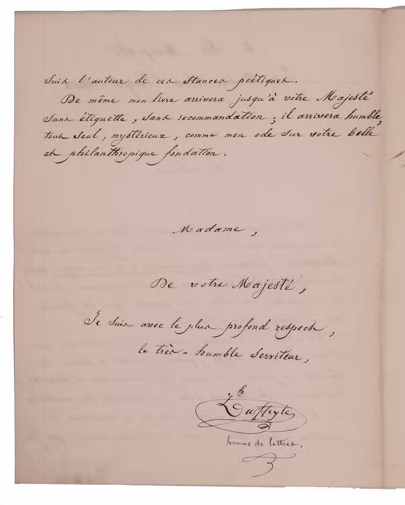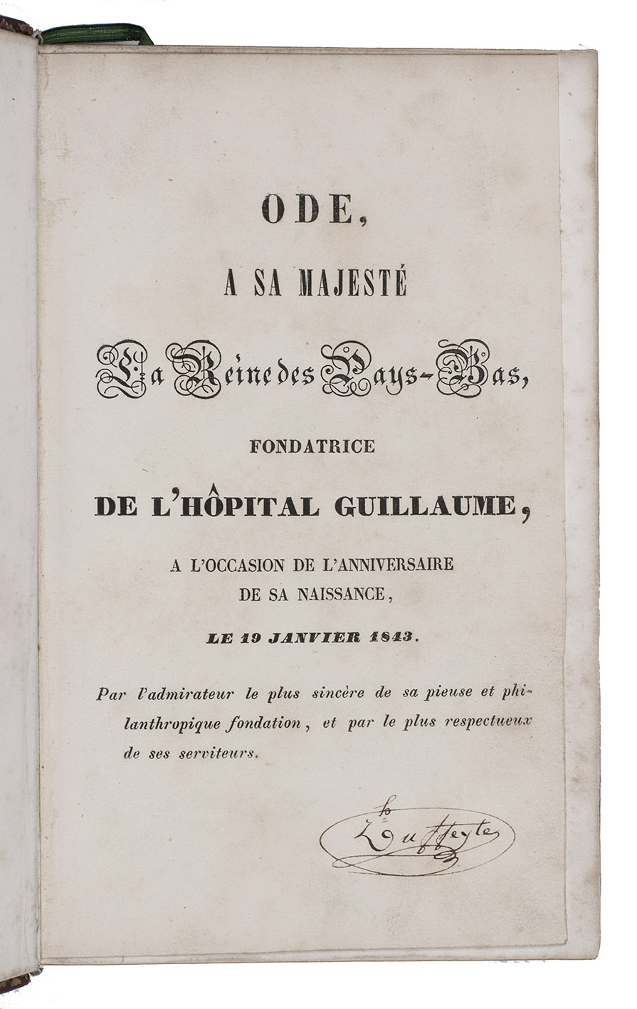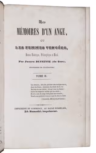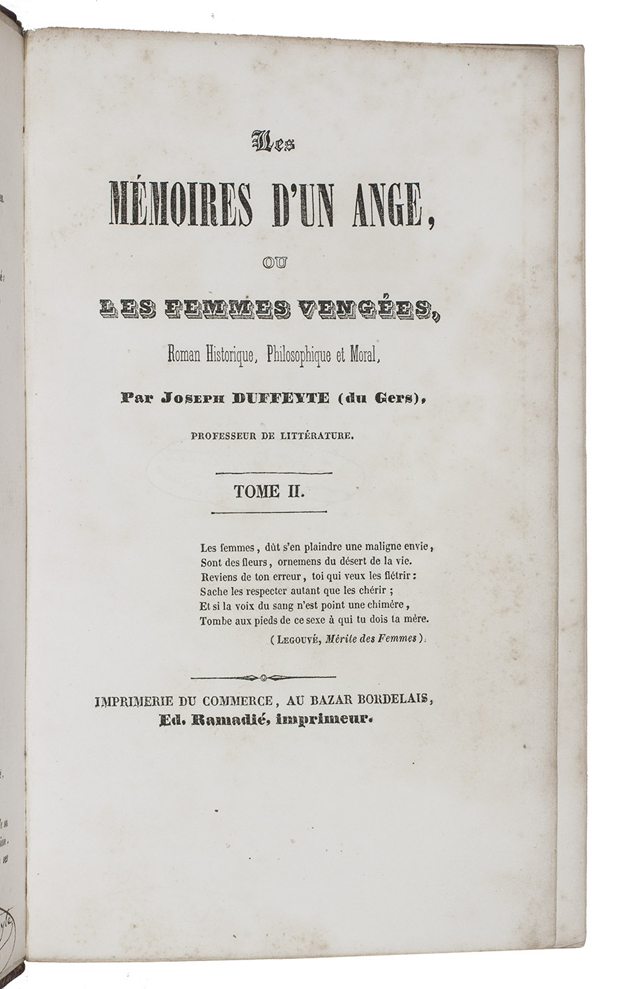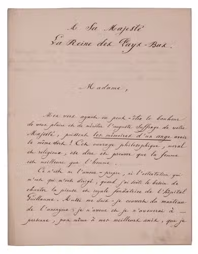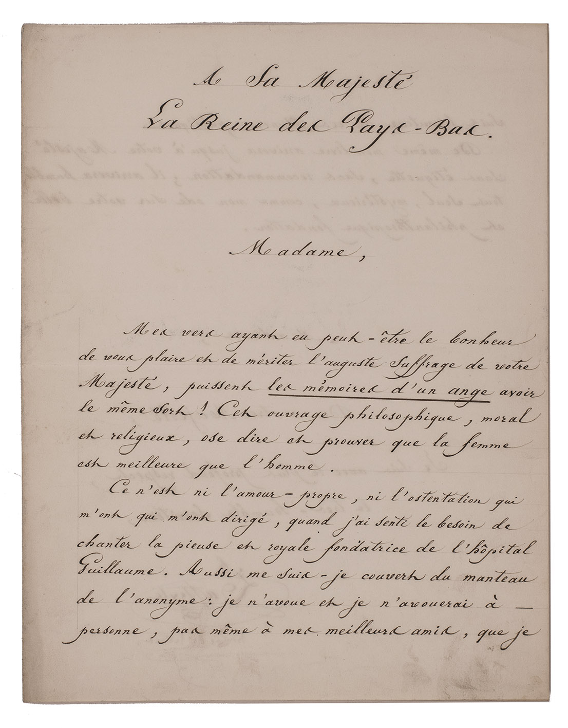Author's dedication copy for Queen Anna Pavlovna of the Netherlands (daughter of the late Tsar Pavel I and wife of King Willem II) of the extremely rare first edition of an "historique, philosophique et moral" novel written for women, including chapters such as "Parallèle de la position sociale de l'homme et de la femme". Together with the author's original accompanying letter. The novel tells the story of a virtuous young man who is visited by a beautiful angel who informs him that God has chosen him to write down and publish his revelations to teach men the value and moral influence of women and to rehabilitate women, who presently suffer under unjust prejudices. The author was a great fan of women and wrote primarily for and about them. He finds it unfair that men can do whatever they want while women "ces fleurs dans le désert de la vie" are virtually imprisoned. He also denounces arranged marriages and prostitution. The world was not ready for Duffeyte's ideas: a reviewer of the 1856 Paris edition concluded that the author must not be married. The present copy is also remarkable because the author presented it to Anna Pavlovna of Russia, daughter of the Tsar, who became Queen of the Netherlands when she married King Willem II in 1840.