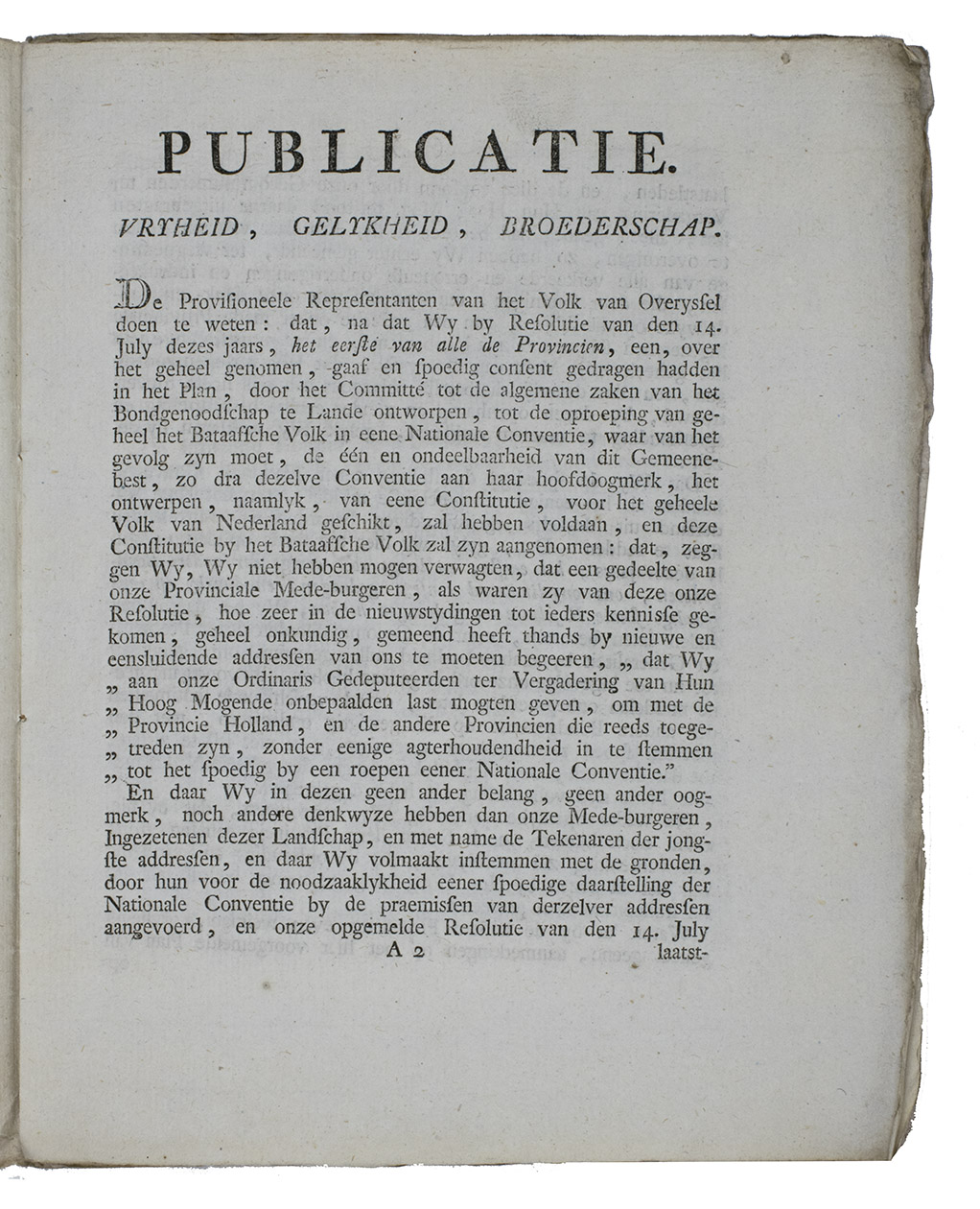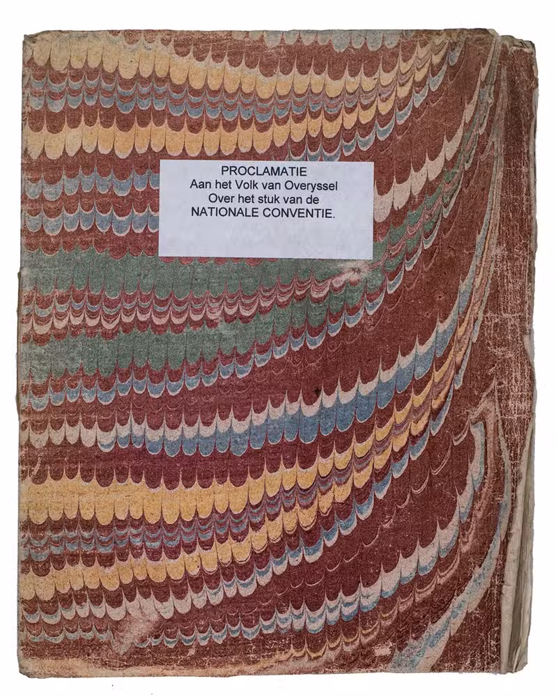 Rare and important pamphlet written in the wake of the intervention of the French Revolutionary intervention in the Dutch, Batavian, affairs: a emotional appeal to all inhabitants of the Province of Overijssel for the establishment and meeting of a National Convention in The Hague, written on behalf of the Patriots of Overijssel organized as the Provisionele Representanten van het Volk van Overijssel (Provisional representatives of the people of Overijssel).