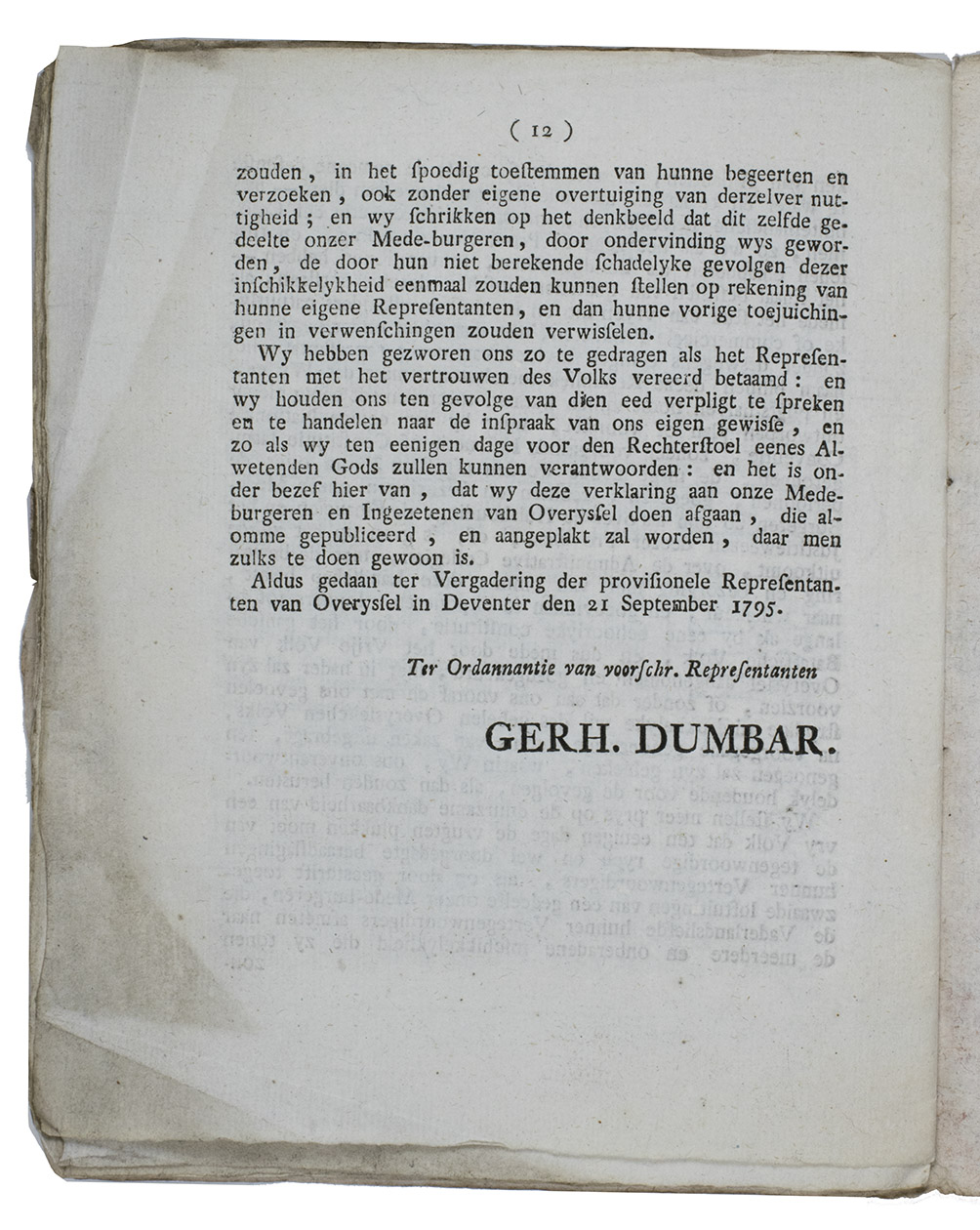 Deventer, Jan Hendrik de Lange, [1795]. 4to. With a woodcut coat-of-arms of the Province of Overijssel on the title-page. Contemporary marbled wrappers. 12 pp.