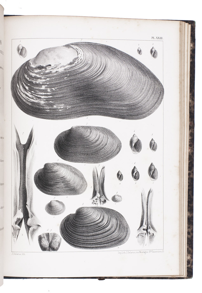 With a presentation inscription on the half-title of the plates-volume: "à Mr. LeMaout homm. resp. de l'aut. D. Dupuy". Slightly browned and some minor foxing. Bindings only slightly rubbed along the extremities. Overall in good condition. BMC NH, p. 495; Junk, Thes. libr. conchyliorum 128.
