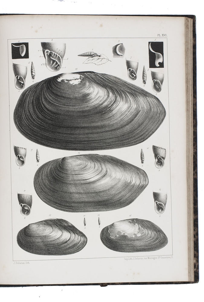 First edition of an extensive monograph on French land and fresh-water molluscs, by the French botanist and malacologist abbot Dominique Dupuy (1812-1885). The text volume contains descriptions of many different species of land and water snails, slugs, and fresh water mussels, describing both the animal and the shell and its habitat. The text volume closes with a bibliography and an index. The second volume contains all the lithographed plates, each depicting multiple snails and shells and each accompanied by a brief explanatory page.