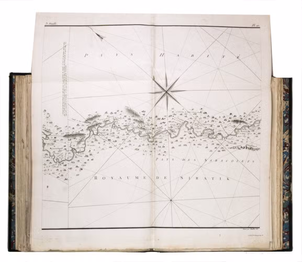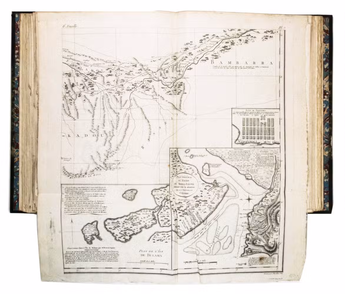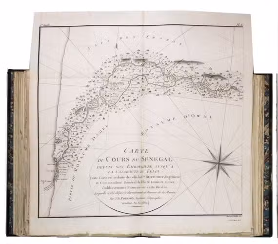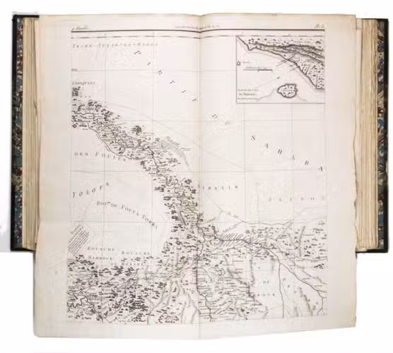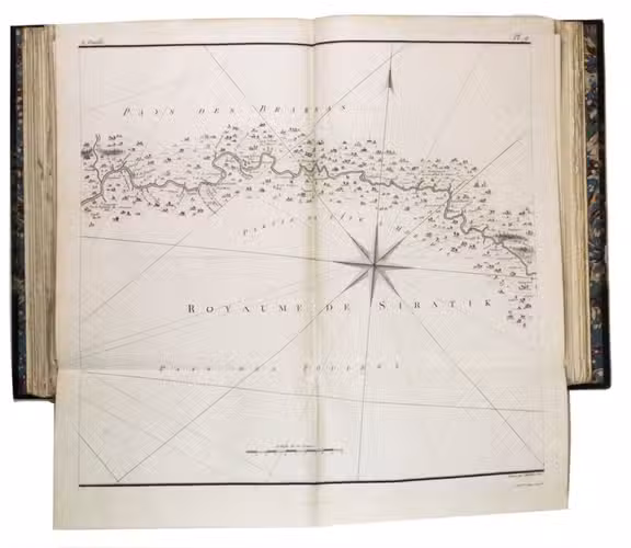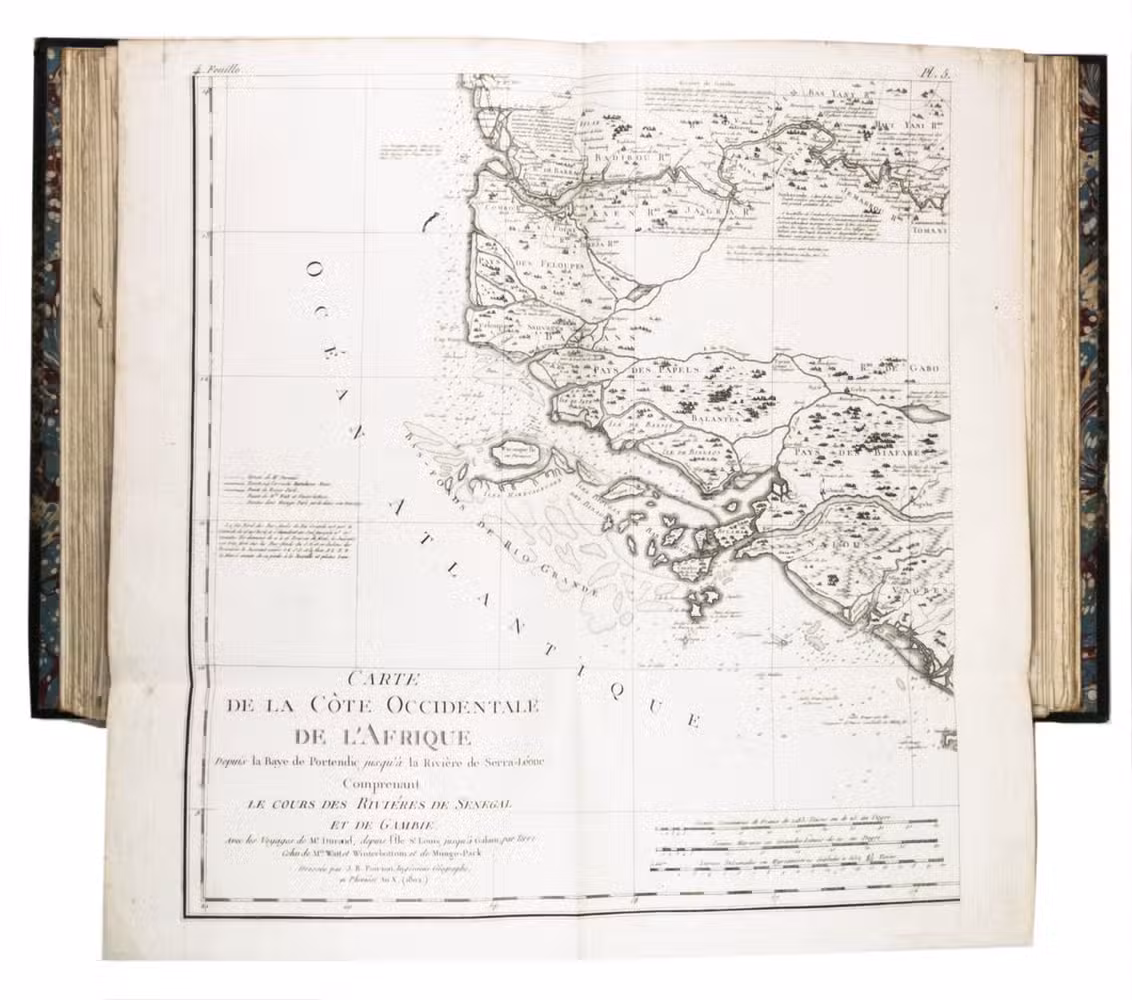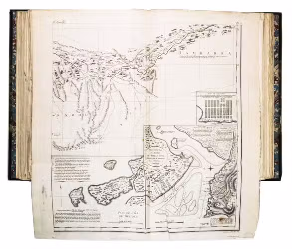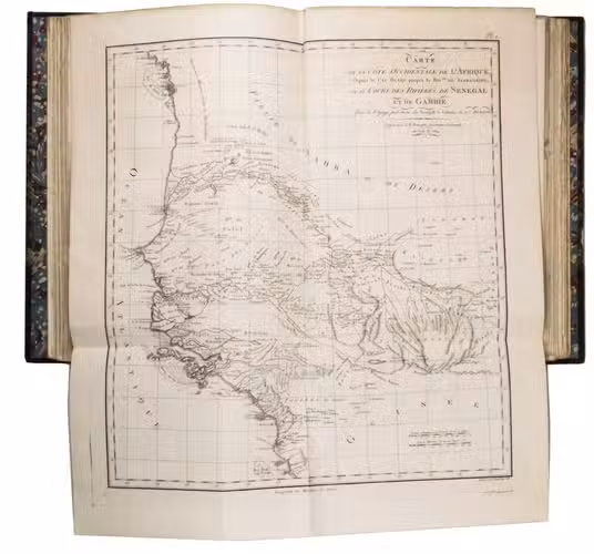 Attractive copy of the first edition, in the original French, of an account of the 15-month commercial expedition to Senegal and Sierra-Leone, initiated by the French African Company and led by Jean-Baptiste-Léonard Durand (1742-1812). Durand gives a detailed description of the native inhabitants and their customs, the geography, flora and fauna, also giving valuable information on European trade and commerce in the area, the relationship between the Europeans and African tribes, and of the things he accomplished and agreed upon with the local authorities. The atlas volume includes three copies of commercial treaties drawn up in French and Arabic; many very detailed maps of the coast of Senegal and of the settlements along the river Senegal; and illustrations with scenes of daily life and domestic vegetation and animals.