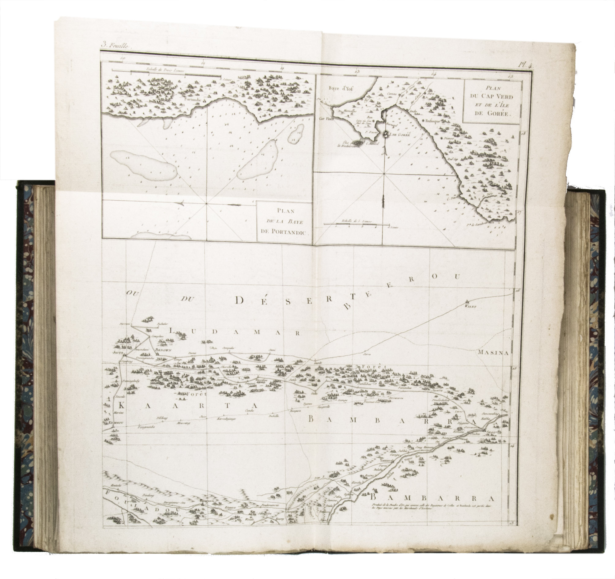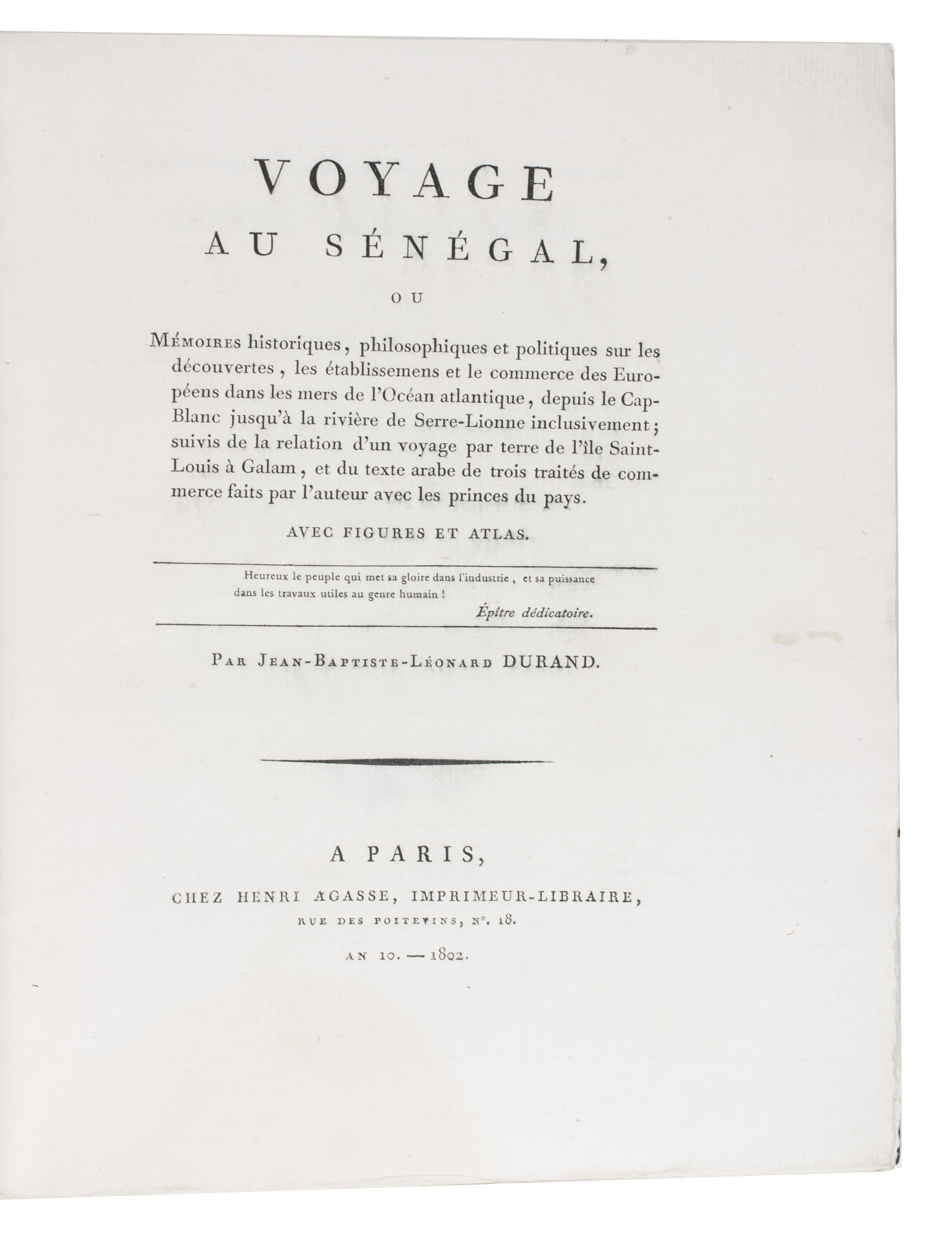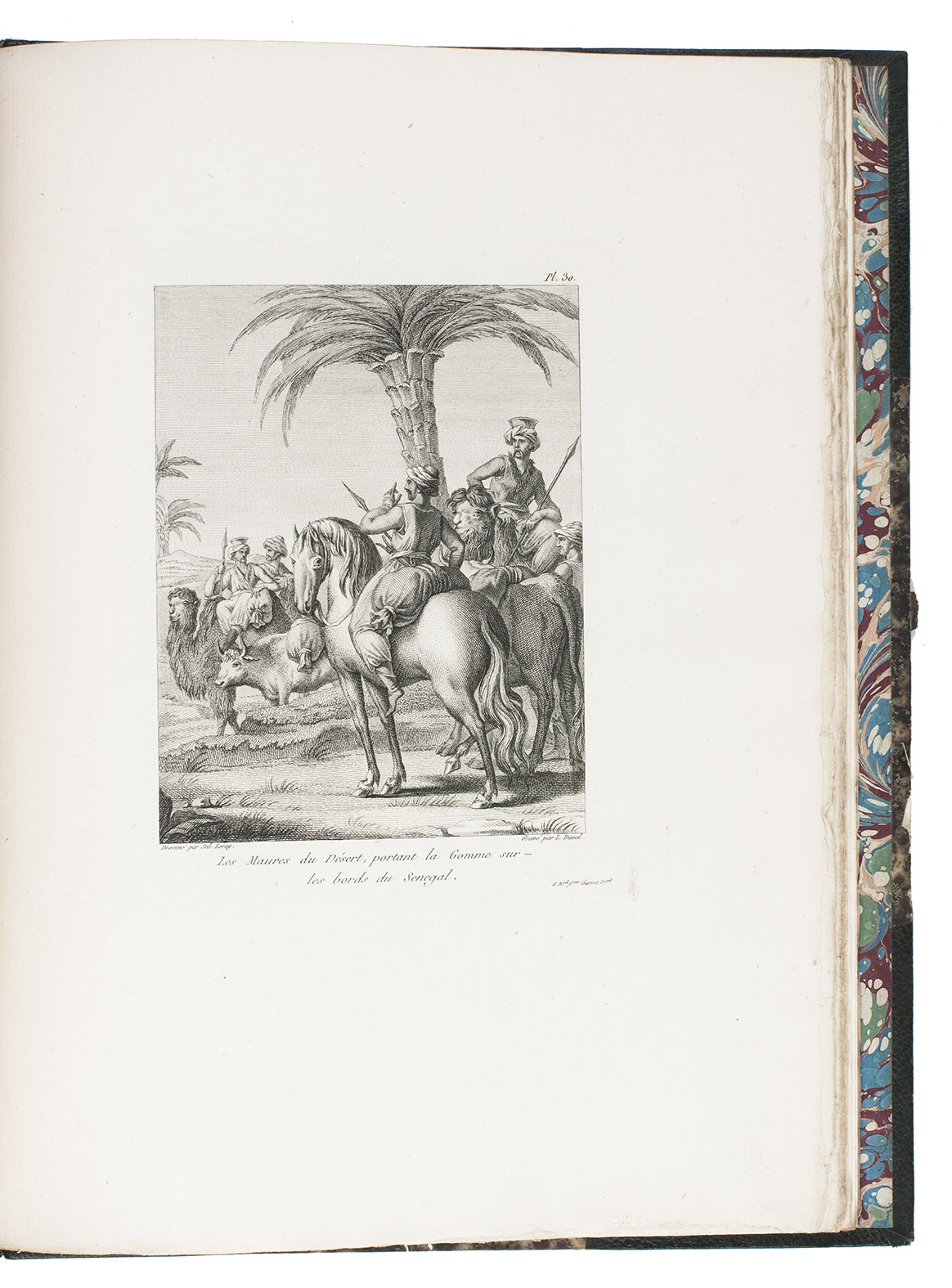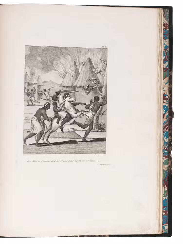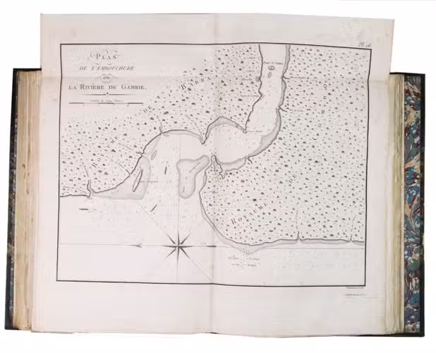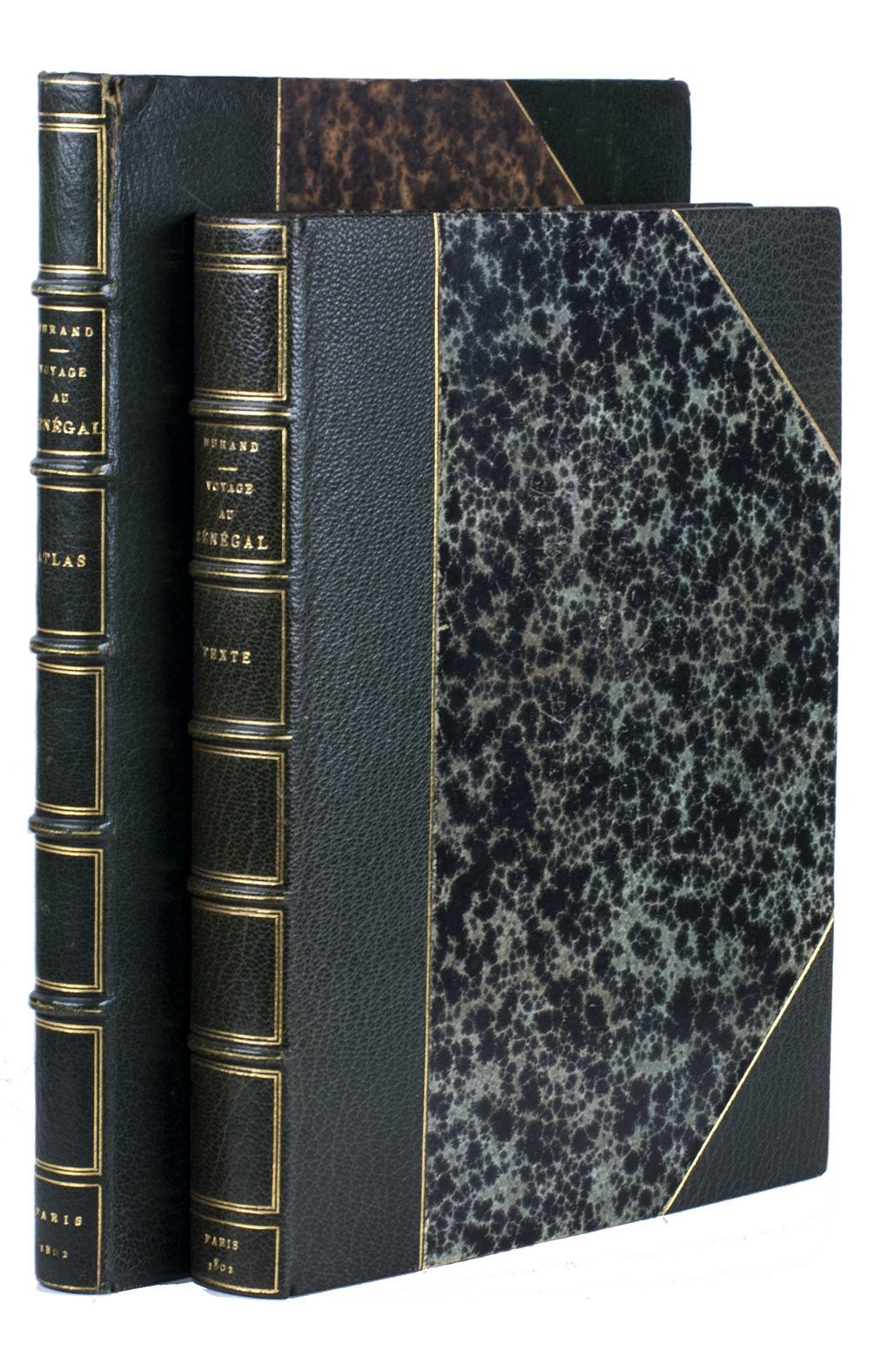 Attractive copy of the first edition, in the original French, of an account of the 15-month commercial expedition to Senegal and Sierra-Leone, initiated by the French African Company and led by Jean-Baptiste-Léonard Durand (1742-1812). Durand gives a detailed description of the native inhabitants and their customs, the geography, flora and fauna, also giving valuable information on European trade and commerce in the area, the relationship between the Europeans and African tribes, and of the things he accomplished and agreed upon with the local authorities. The atlas volume includes three copies of commercial treaties drawn up in French and Arabic; many very detailed maps of the coast of Senegal and of the settlements along the river Senegal; and illustrations with scenes of daily life and domestic vegetation and animals.