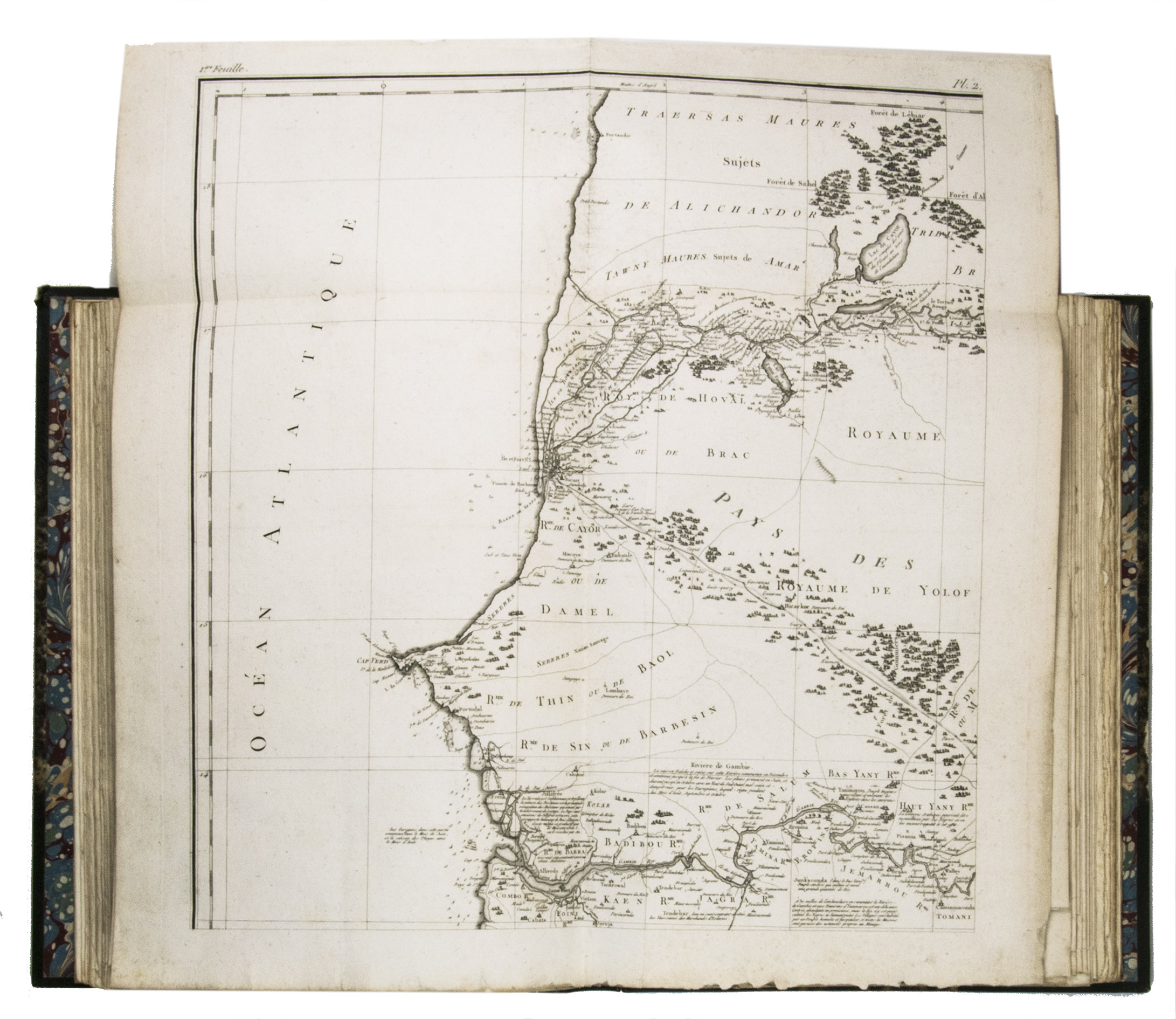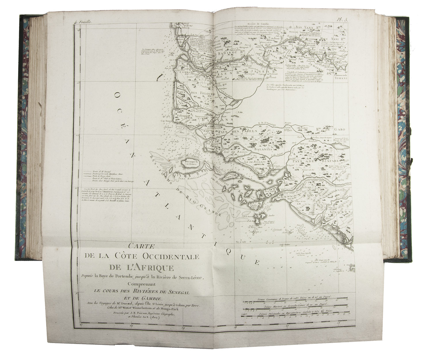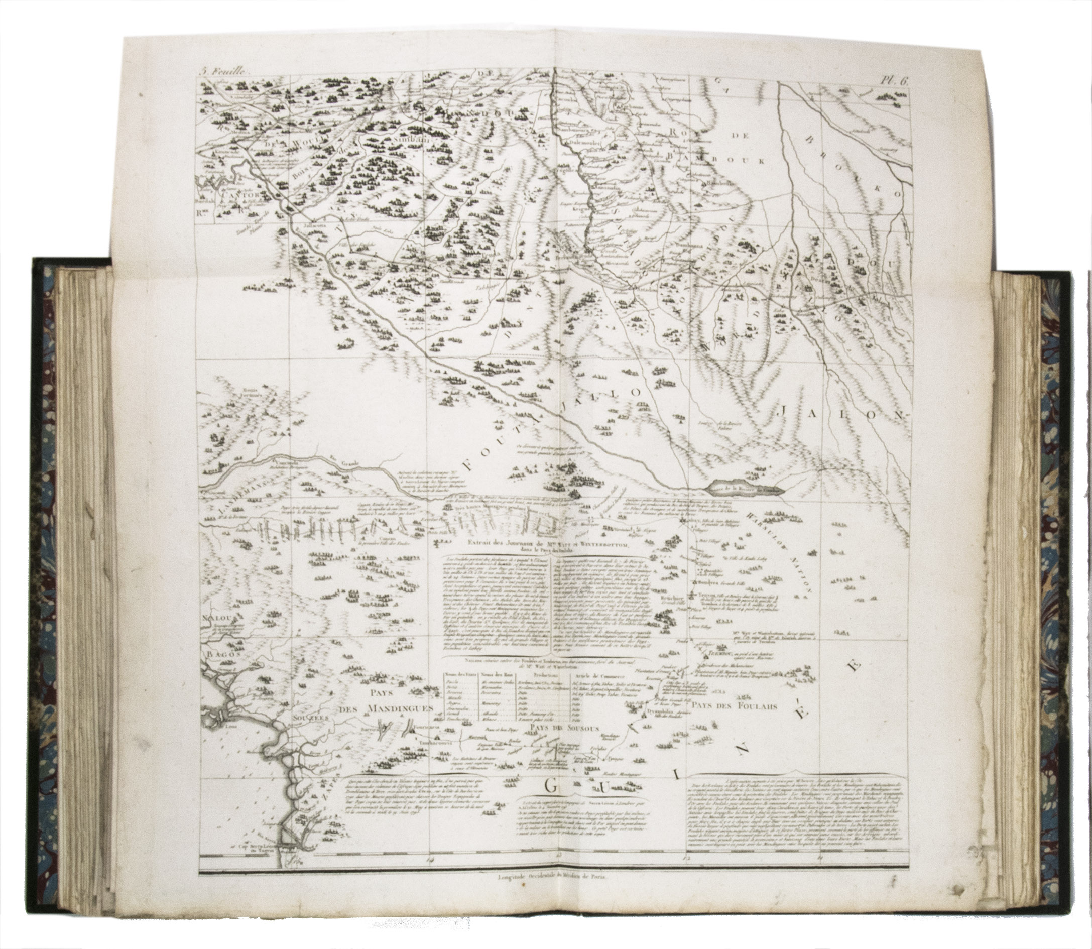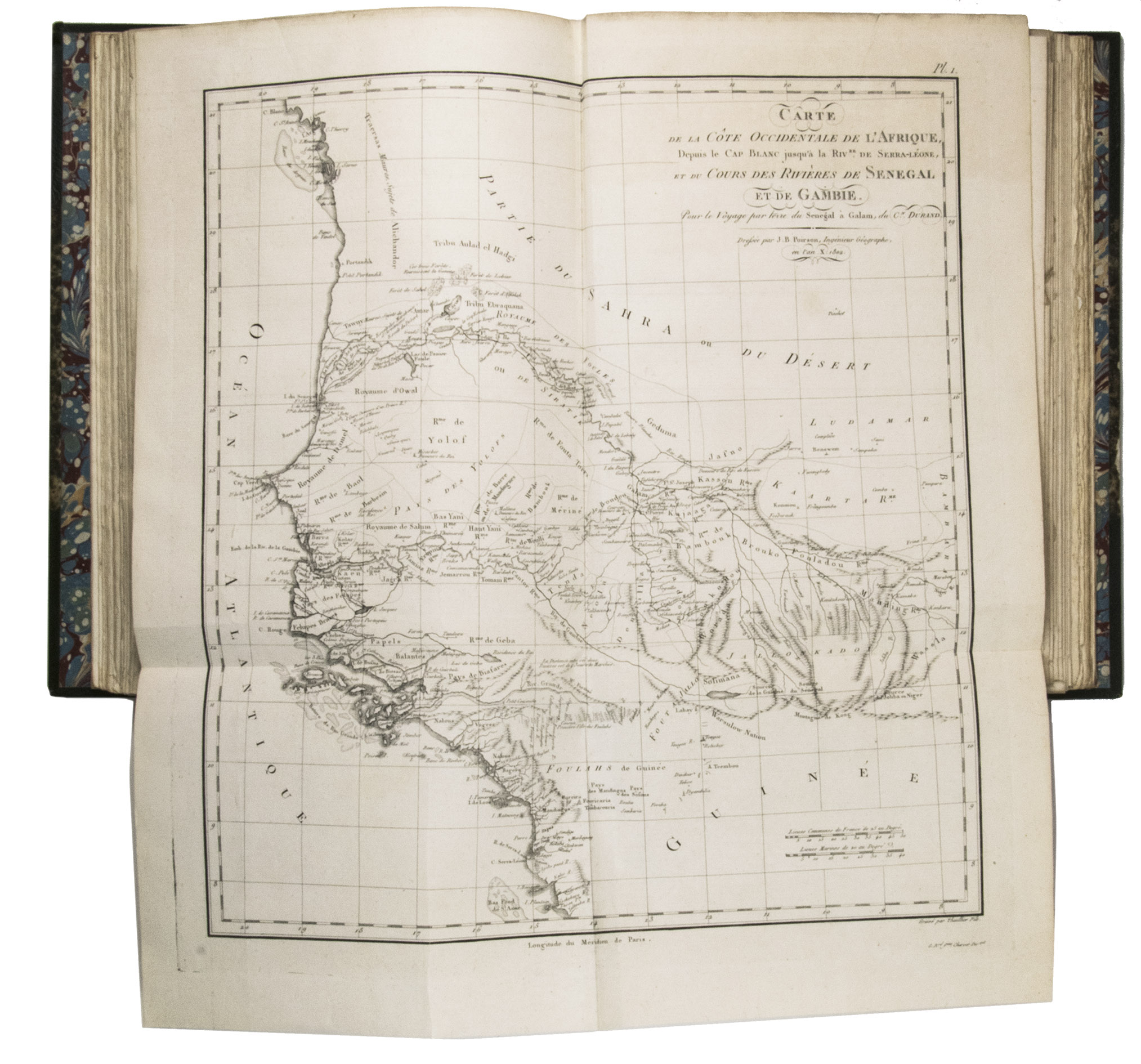 Attractive copy of the first edition, in the original French, of an account of the 15-month commercial expedition to Senegal and Sierra-Leone, initiated by the French African Company and led by Jean-Baptiste-Léonard Durand (1742-1812). Durand gives a detailed description of the native inhabitants and their customs, the geography, flora and fauna, also giving valuable information on European trade and commerce in the area, the relationship between the Europeans and African tribes, and of the things he accomplished and agreed upon with the local authorities. The atlas volume includes three copies of commercial treaties drawn up in French and Arabic; many very detailed maps of the coast of Senegal and of the settlements along the river Senegal; and illustrations with scenes of daily life and domestic vegetation and animals.