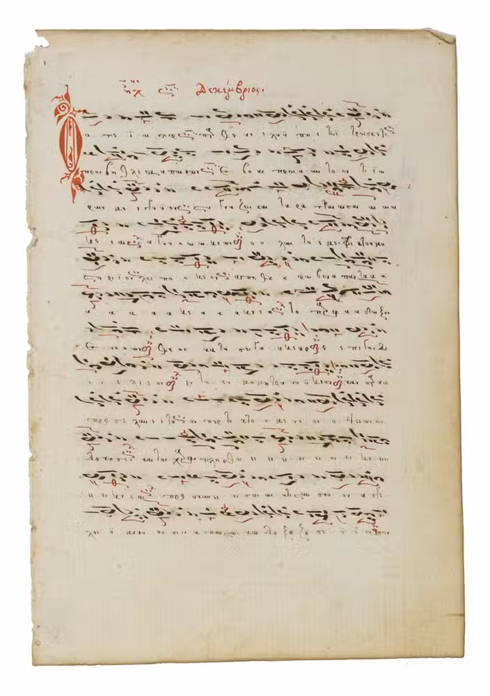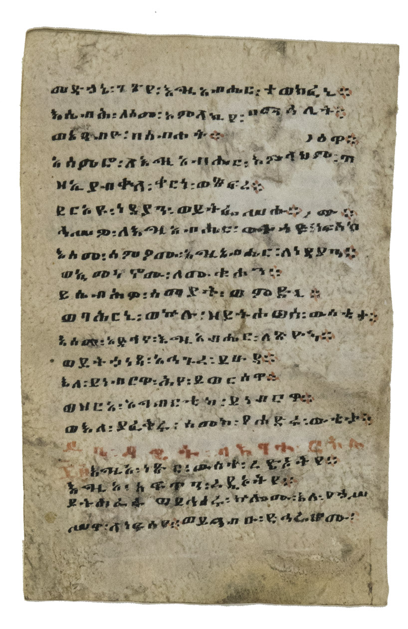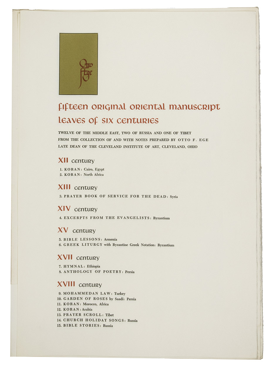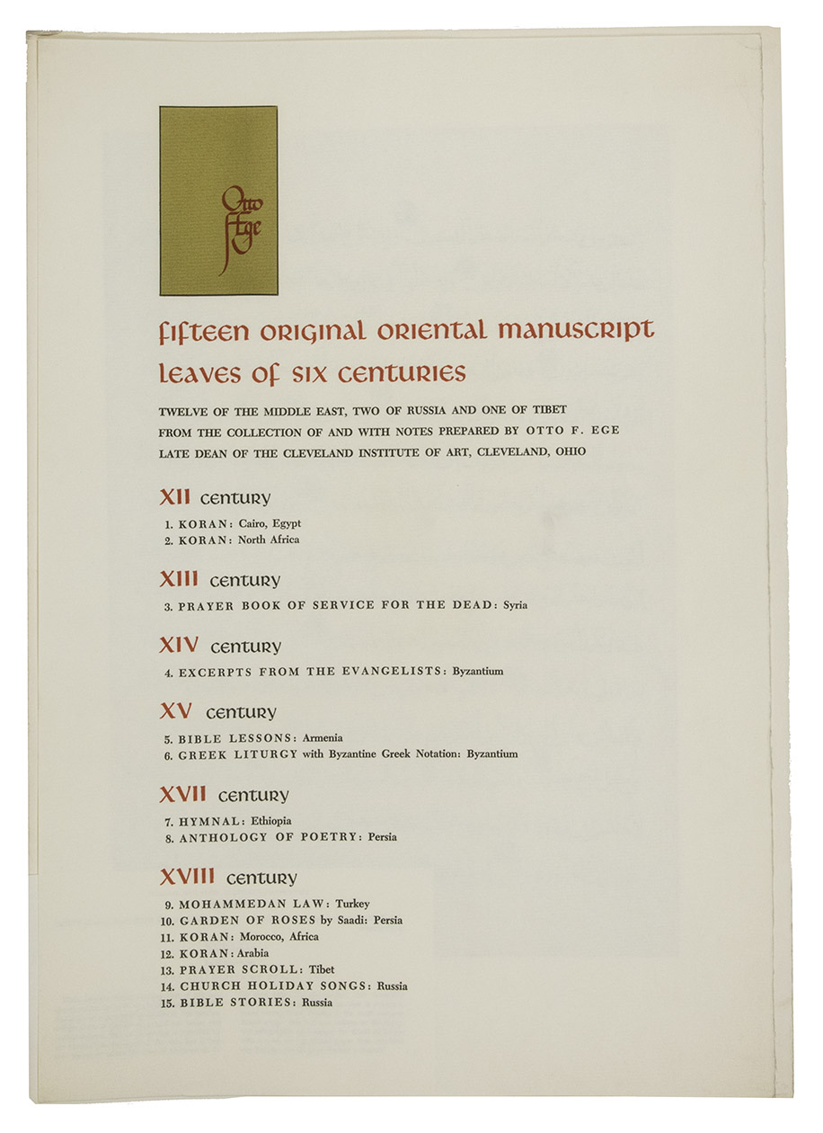 The present portfolio includes leaves from 15 manuscripts produced from the 12th to the 18th century, in Egypt, Iran, the Byzantine/Ottoman Empire, Persia/Iran, Russia, Tibet and other places. These mainly religious texts were written in several different languages, including Arabic, Syriac, Armenian, Ethiopic, Persian, Tibetan, Greek and Church Slavonic. Two of the fragments, one in Greek and one in Church Slavonic, even include music notation (neumes). Although the publication names no publisher and gives no date of publication, Ege compiled it himself and wrote the notes about each manuscript leaf, but it is said to have been published after (probably soon after) his death in 1951 (the description of Ege as "late dean of ..." is slightly ambiguous, but may indicate that he had died). His brief notes on the manuscripts lack many details and are often not reliable (particularly the dating), so we have tried to make some additions and corrections in our detailed list of the contents. One of the Cleveland institutions where he worked probably published the portfolio. It is listed in the National Union Catalog of pre-1956 imprints. As Ege intended, many of his portfolios and other fragments were sold and distributed worldwide. Beinecke Rare Book & Manuscript Library at Yale University acquired his personal collection, including 50 unbroken manuscripts, for their special collections in 2015.