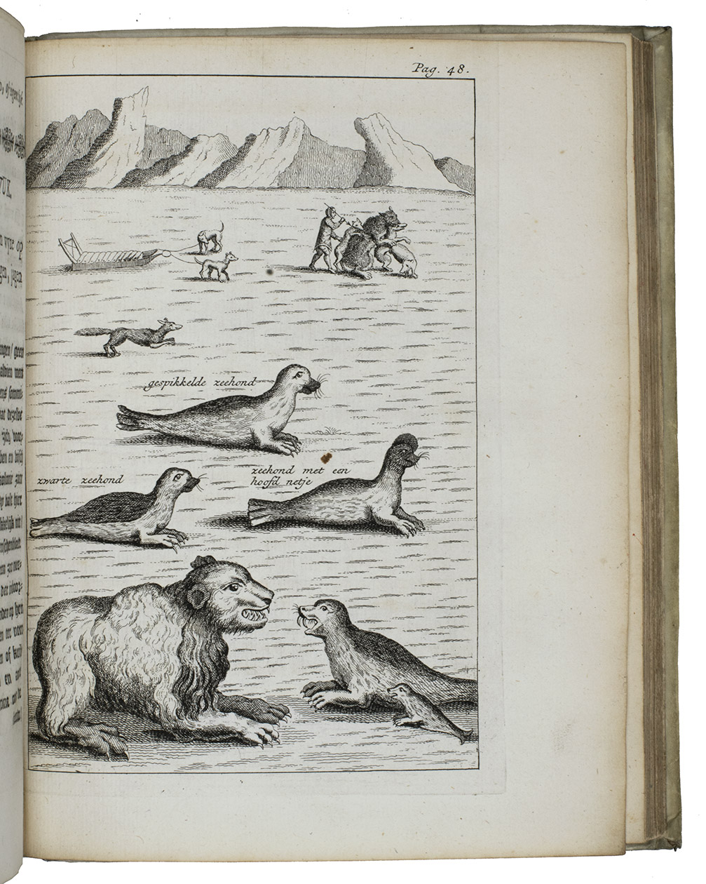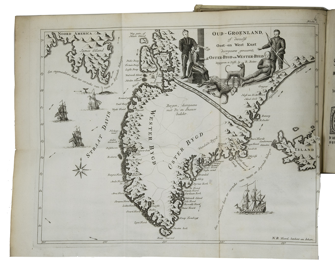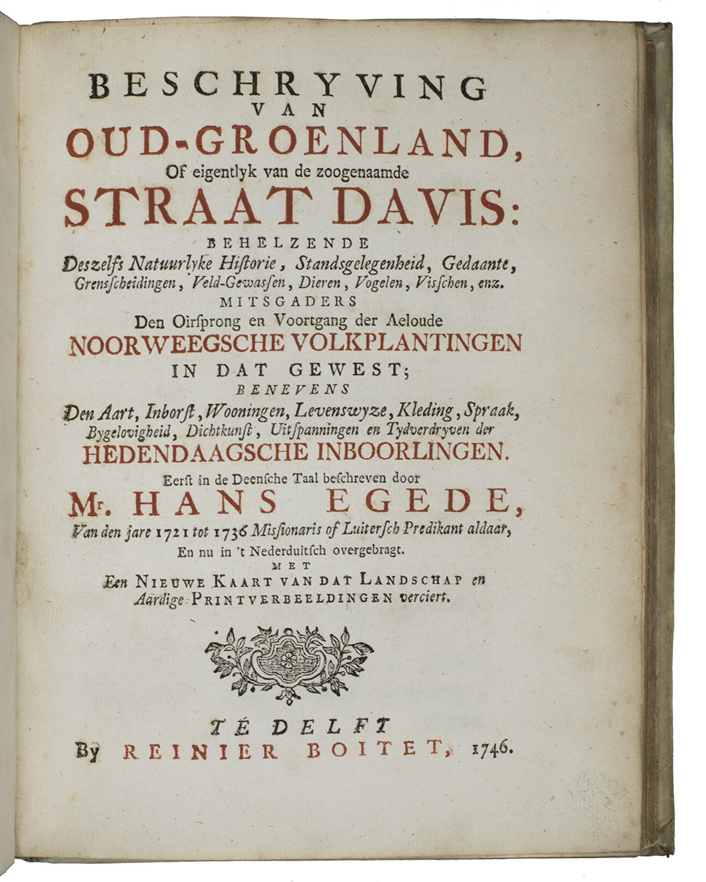 Delft, Reinier Boitet, 1746. 4to. With an engraved folding map of Greenland (printed for this edition by Boitet) and 10 engraved plates with full-page views of whales and seals, whale fishery and seal hunting, the Inuits and their cultural habits and houses and (in the first plate) flowers. With the title-page printed in red and black and with some woodcut initials and tailpieces. Contemporary vellum, manuscript title on spine. [24], 192 pp.