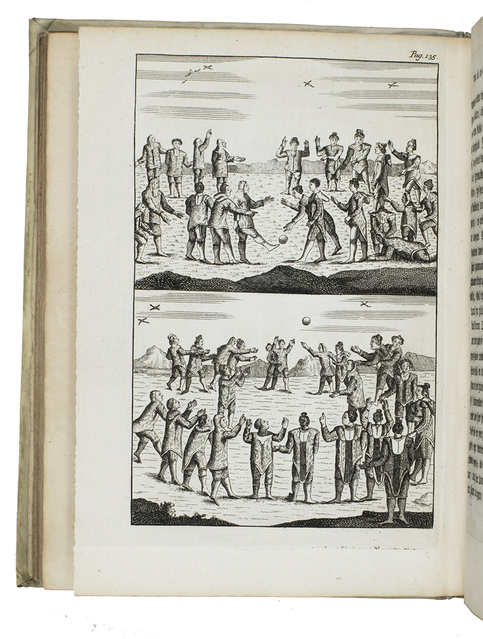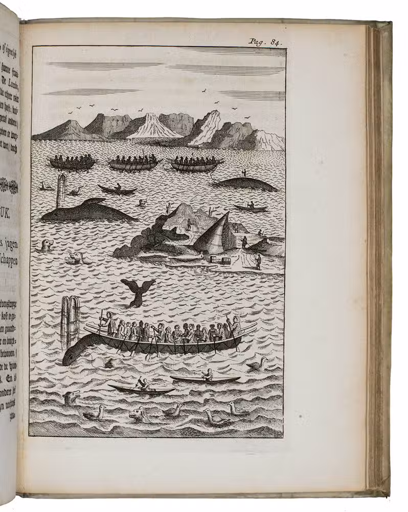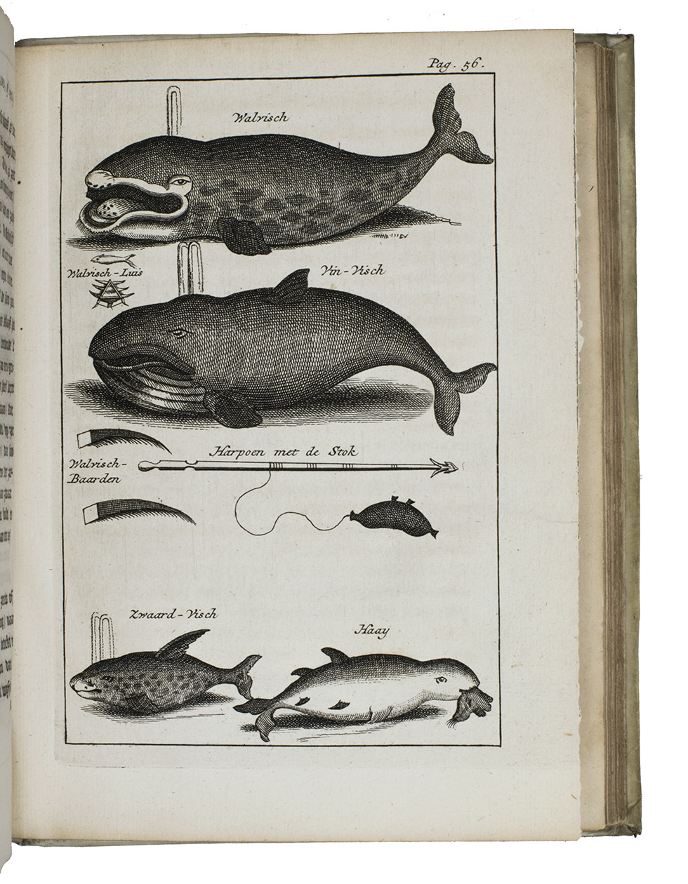 Delft, Reinier Boitet, 1746. 4to. With an engraved folding map of Greenland (printed for this edition by Boitet) and 10 engraved plates with full-page views of whales and seals, whale fishery and seal hunting, the Inuits and their cultural habits and houses and (in the first plate) flowers. With the title-page printed in red and black and with some woodcut initials and tailpieces. Contemporary vellum, manuscript title on spine. [24], 192 pp.