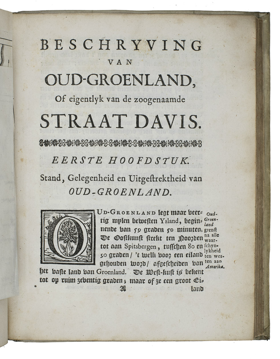 First Dutch translation of Hans Egede's first description of Greenland, including its natural and cultural history. Hans Egede (1686-1758) was a Norwegian-Danish missionary who went to Greenland in 1721 to convert the Greenlanders, but who also helped to initiate trade between Greenland and Denmark. His description of Greenland and Davis Strait is not only the first description of Greenland and its coastal area, but also one of the most trustworthy and popular accounts of the region. He describes not only the history of Greenland, but also the flora and fauna and the Inuit culture, commerce and religion. He draws particular attention to seal hunting and whaling, illustrated with engraved plates.