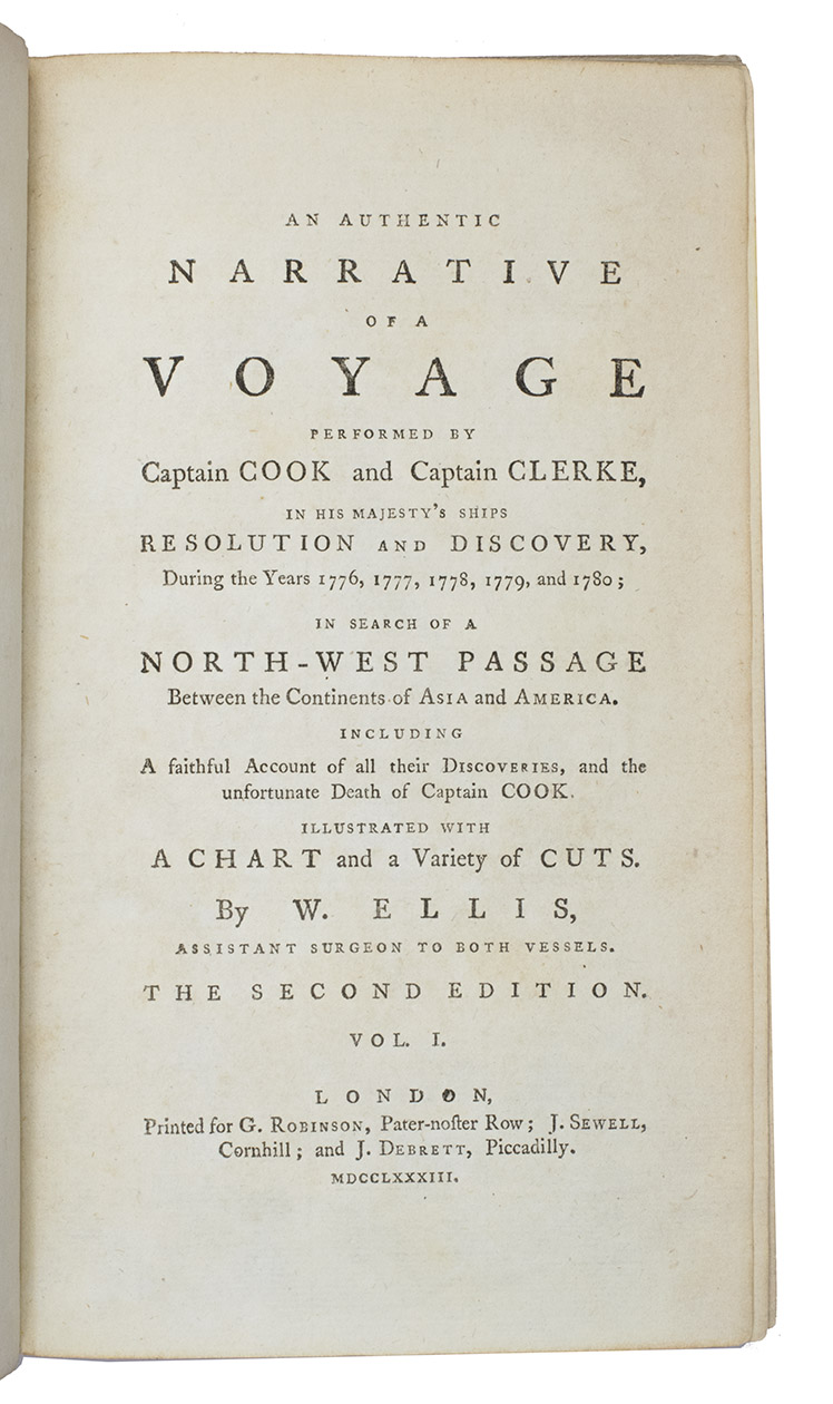 An authentic narrative of a voyage performed by Captain Cook and Captain Clerke, in his majesty's ships Resolution and Discovery, during the years 1776, 1777, 1778, 1779 and 1780; in search of a North-West passage between the continents of Asia and America. Including a faithful account of all their discoveries, and the unfortunate death of Captain Cook.
