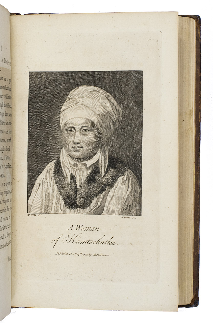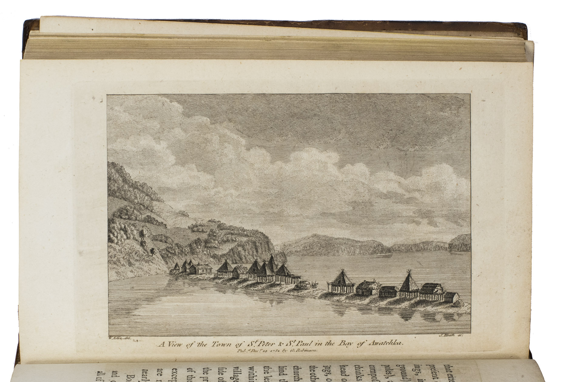 London, G. Robinson, J. Sewell and J. Debrett, 1783. 2 volumes. 8vo. With one folding engraved chart showing the tracks and discoveries in the Pacific Ocean made by Captain Cook and Captain Clerke and 21 full-page engraved plates showing natives from the Sandwich Islands, views of islands, natives in canoes, a Kamtschatka travelling in the winter and many more. Contemporary calf. [12], 358, [1]; [4], 347, [4] pp.