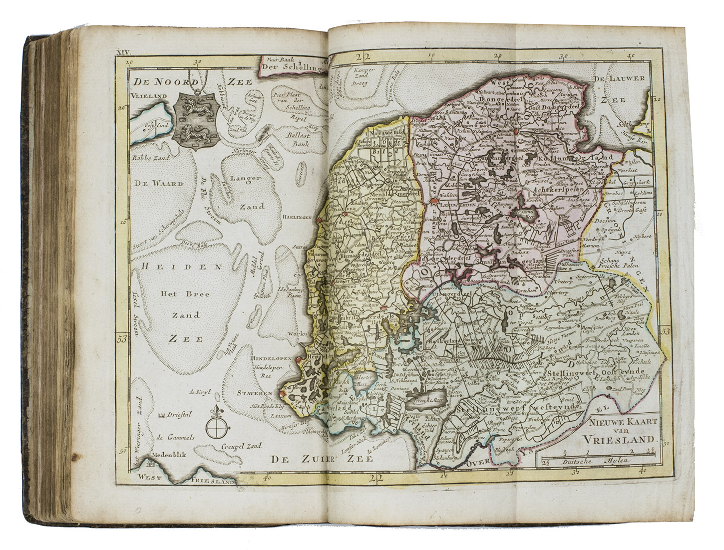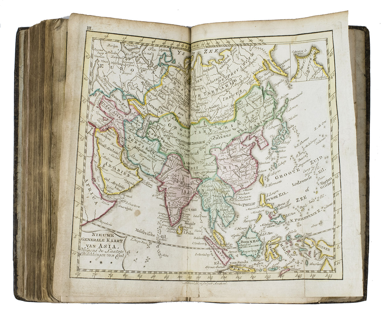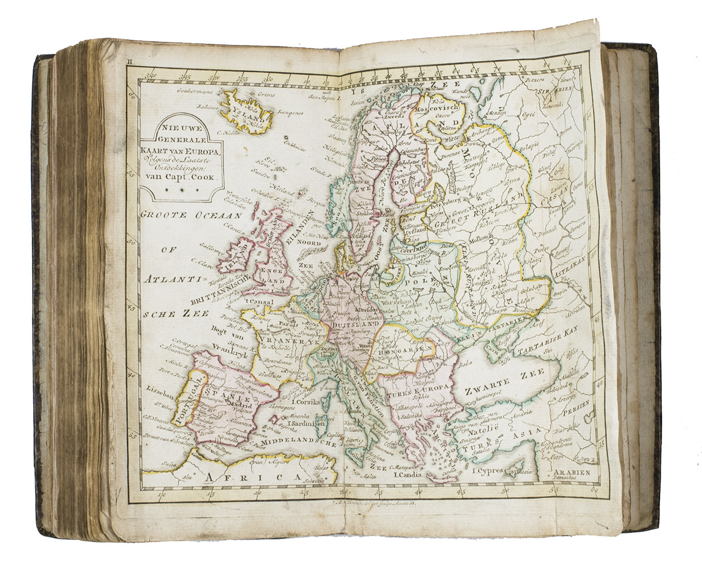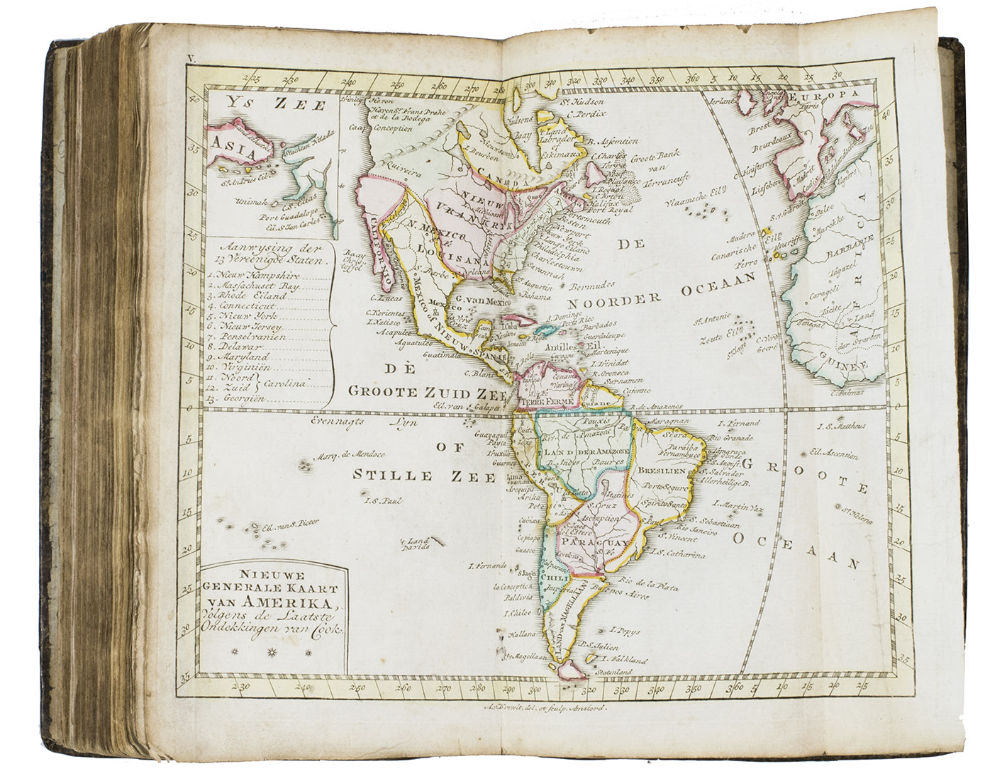 Second enlarged edition of a pocket atlas of the Low Countries with attractively coloured maps. The introduction deals with geography in general, and also gives a description of the different parts of the Low Countries. It has been expanded with a list of departures of canal boats and ferries as well as a list of inns. The atlas begins with a world map in two hemispheres and four maps of the continents, all updated in accordance with the latest discoveries of Captain Cook, followed by maps of individual provinces of the Dutch Republic and the Southern Netherlands, and finally two distance tables of cities in the Low Countries. The map of the Americas numbers the thirteen new United States and names them in a key at the side, and the text refers to the American independence as a momentous event that expands the boundaries of freedom and discusses the close relations with the Dutch Republic.