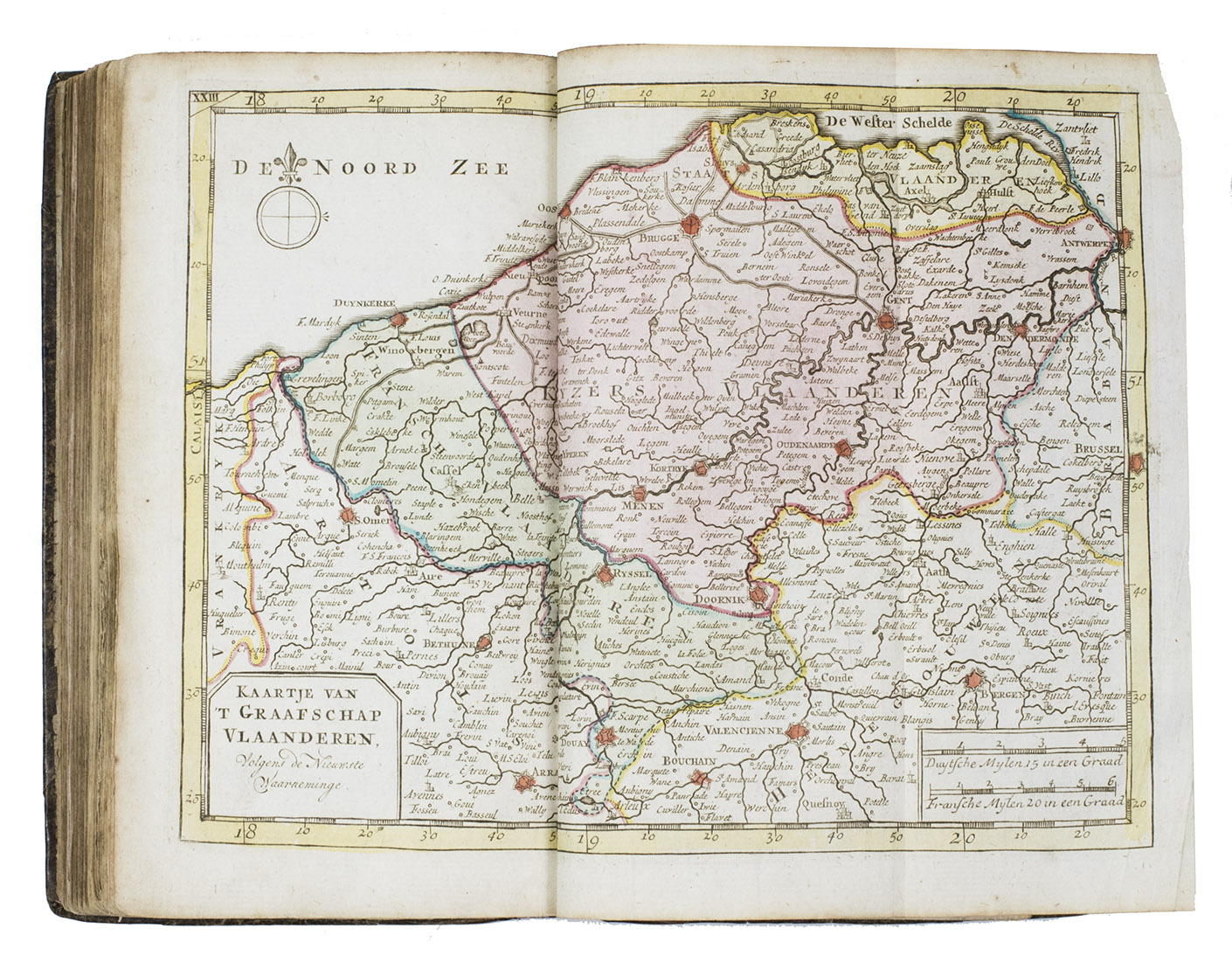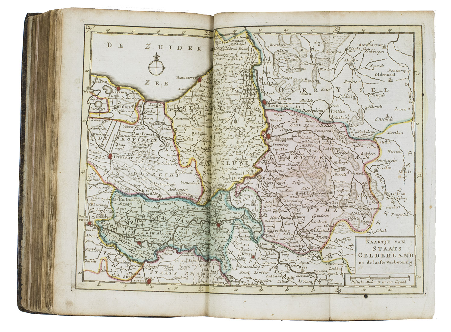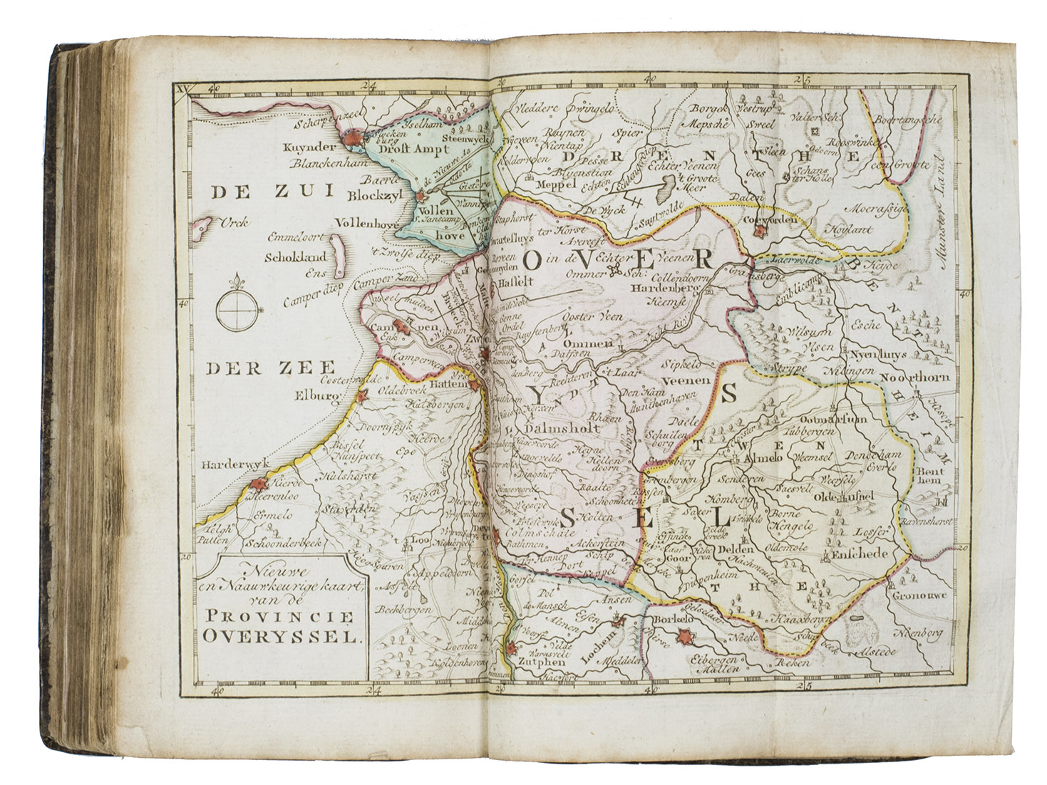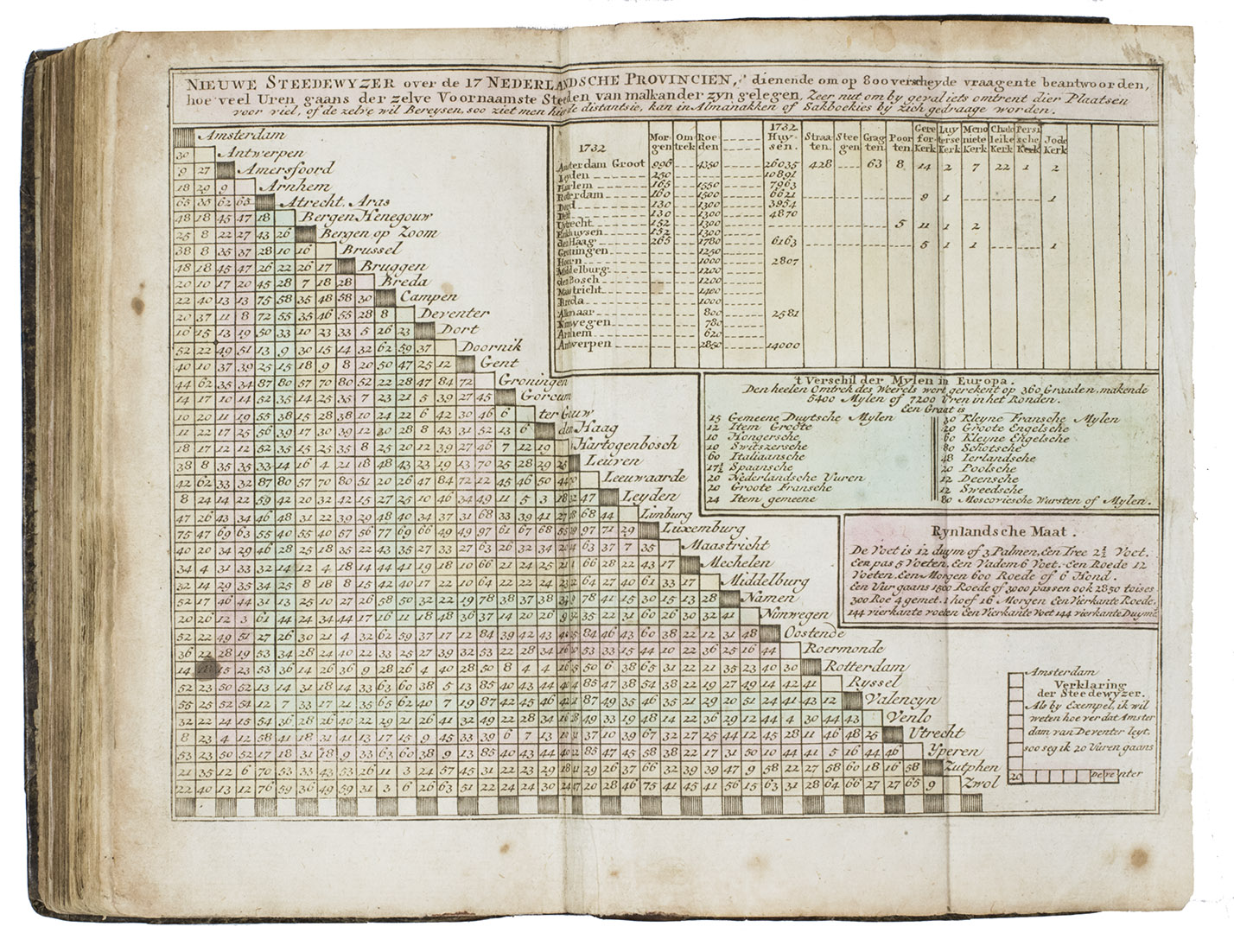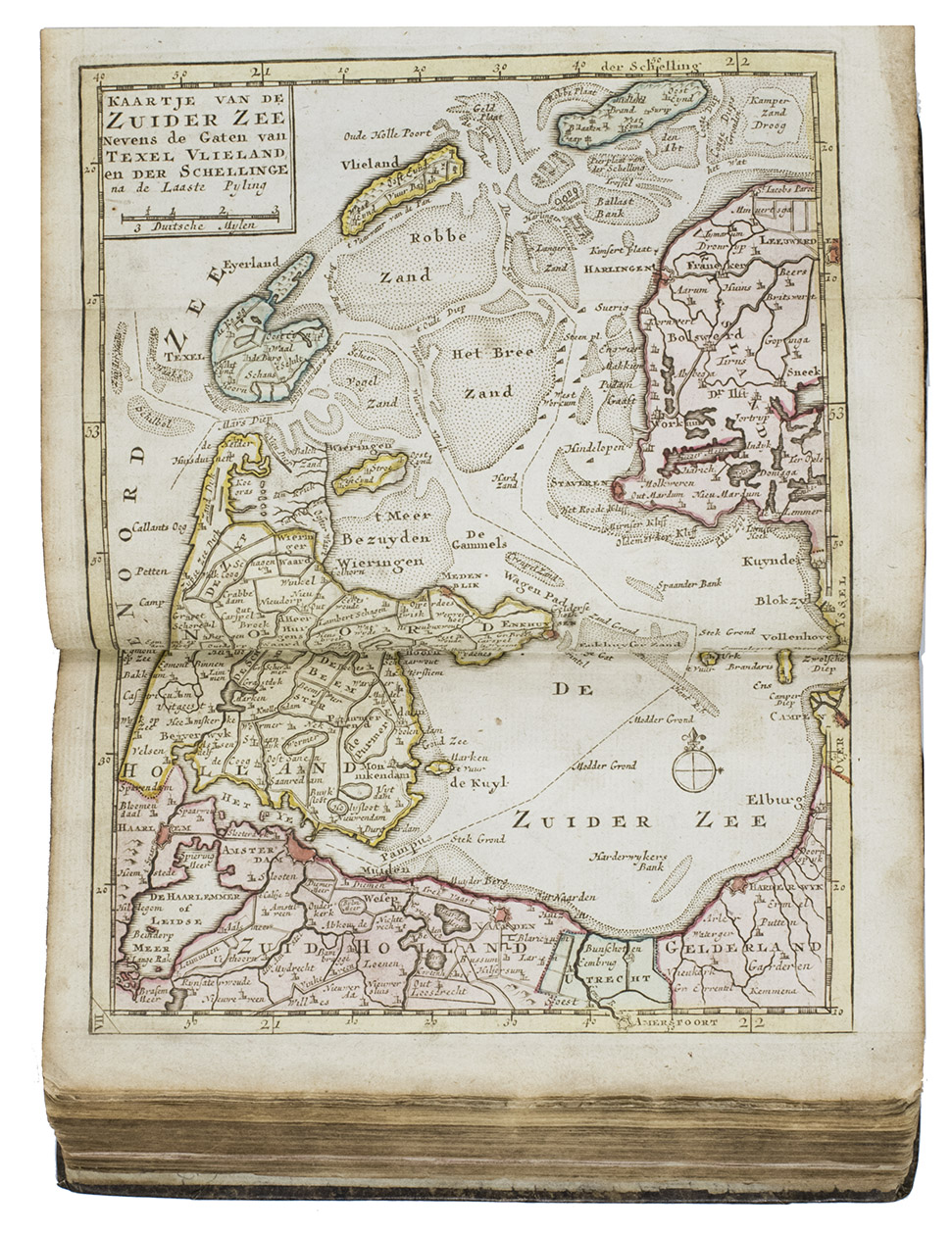 Second enlarged edition of a pocket atlas of the Low Countries with attractively coloured maps. The introduction deals with geography in general, and also gives a description of the different parts of the Low Countries. It has been expanded with a list of departures of canal boats and ferries as well as a list of inns. The atlas begins with a world map in two hemispheres and four maps of the continents, all updated in accordance with the latest discoveries of Captain Cook, followed by maps of individual provinces of the Dutch Republic and the Southern Netherlands, and finally two distance tables of cities in the Low Countries. The map of the Americas numbers the thirteen new United States and names them in a key at the side, and the text refers to the American independence as a momentous event that expands the boundaries of freedom and discusses the close relations with the Dutch Republic.