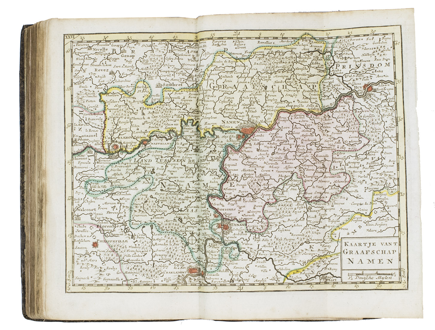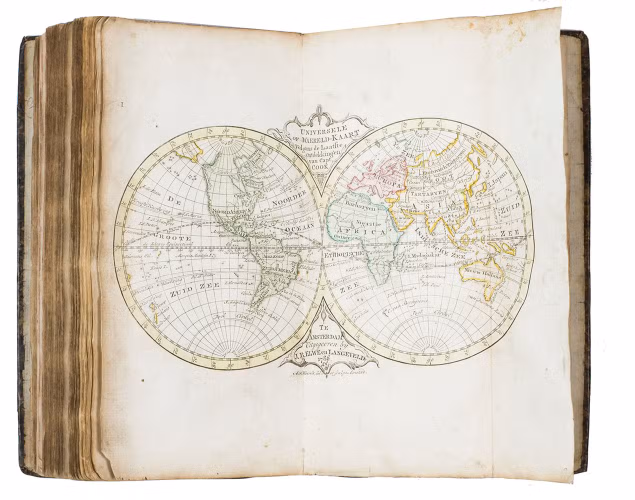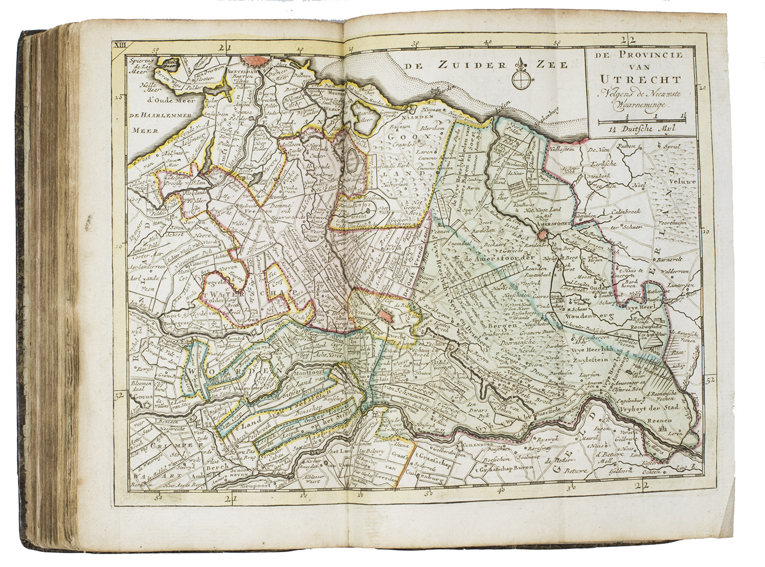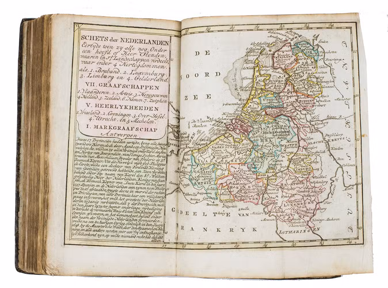 Second enlarged edition of a pocket atlas of the Low Countries with attractively coloured maps. The introduction deals with geography in general, and also gives a description of the different parts of the Low Countries. It has been expanded with a list of departures of canal boats and ferries as well as a list of inns. The atlas begins with a world map in two hemispheres and four maps of the continents, all updated in accordance with the latest discoveries of Captain Cook, followed by maps of individual provinces of the Dutch Republic and the Southern Netherlands, and finally two distance tables of cities in the Low Countries. The map of the Americas numbers the thirteen new United States and names them in a key at the side, and the text refers to the American independence as a momentous event that expands the boundaries of freedom and discusses the close relations with the Dutch Republic.
