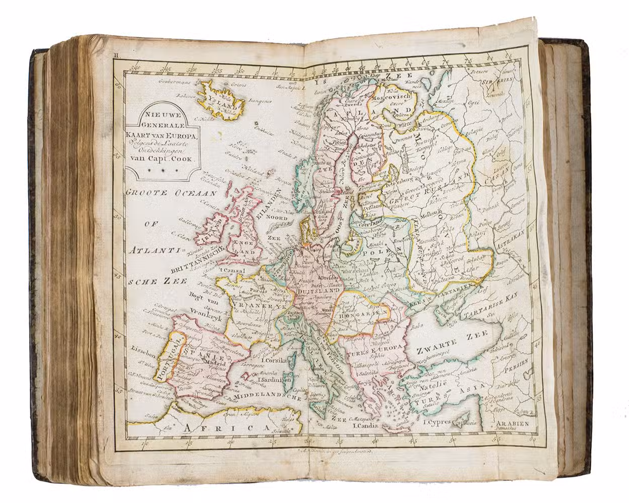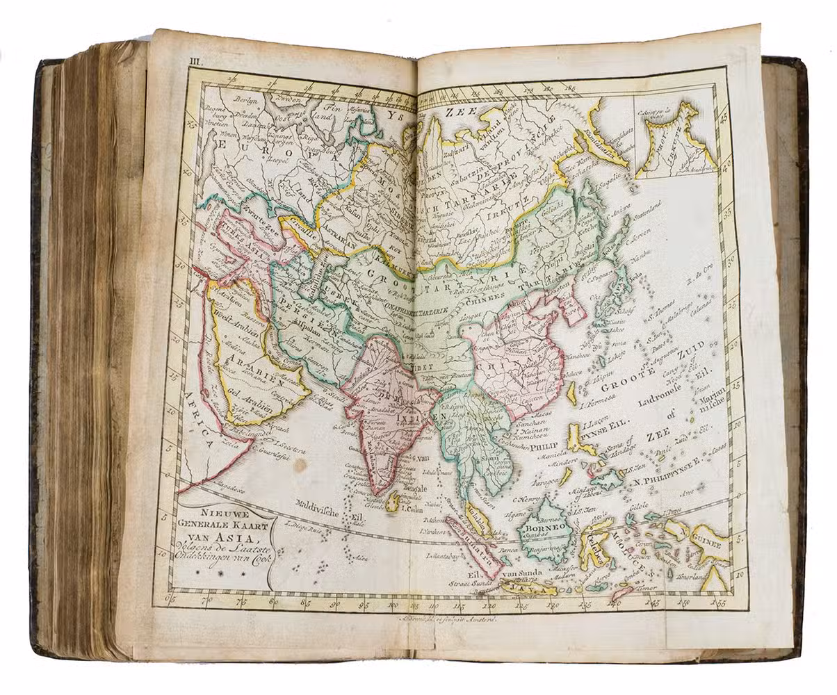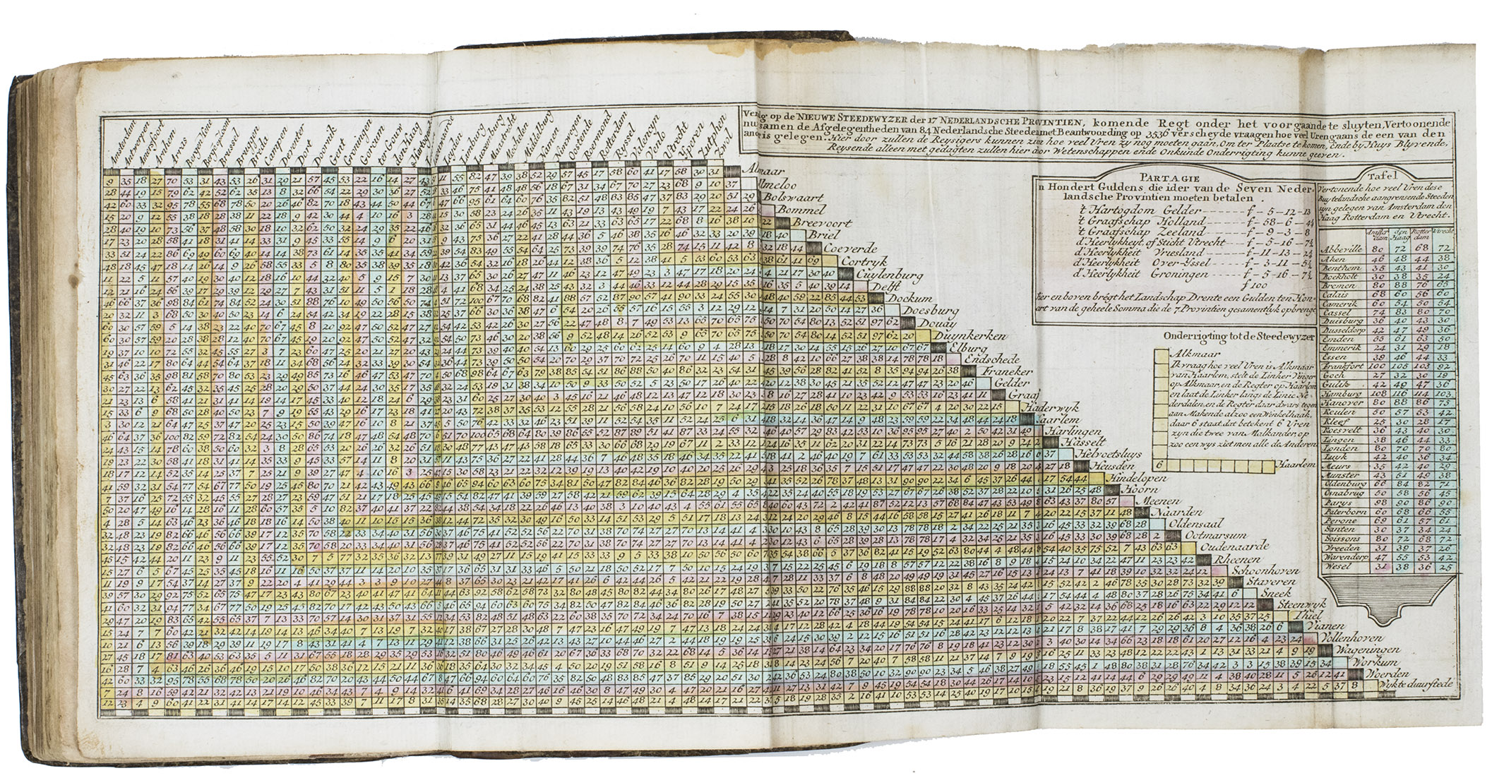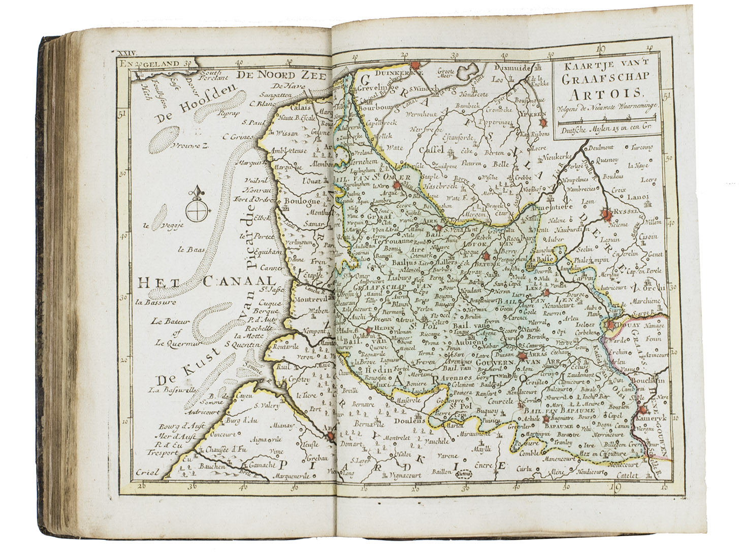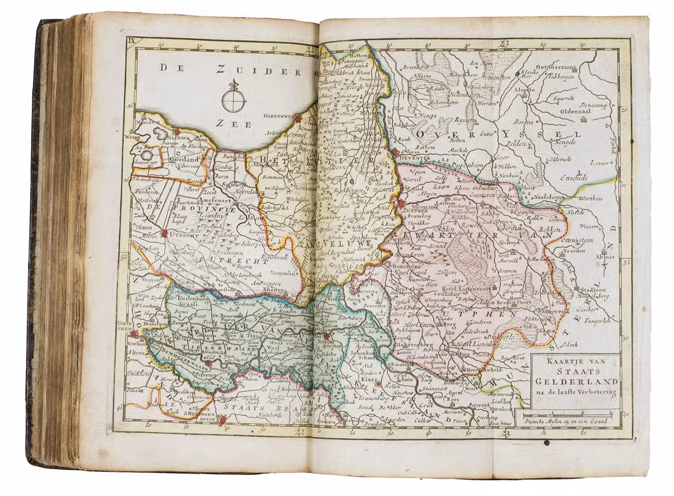 Second enlarged edition of a pocket atlas of the Low Countries with attractively coloured maps. The introduction deals with geography in general, and also gives a description of the different parts of the Low Countries. It has been expanded with a list of departures of canal boats and ferries as well as a list of inns. The atlas begins with a world map in two hemispheres and four maps of the continents, all updated in accordance with the latest discoveries of Captain Cook, followed by maps of individual provinces of the Dutch Republic and the Southern Netherlands, and finally two distance tables of cities in the Low Countries. The map of the Americas numbers the thirteen new United States and names them in a key at the side, and the text refers to the American independence as a momentous event that expands the boundaries of freedom and discusses the close relations with the Dutch Republic.