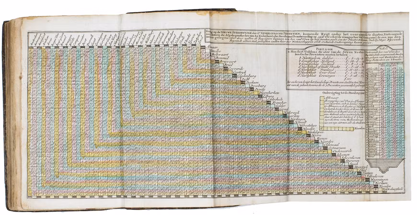 Amsterdam, Jan Barend Elwe and Dirk Meland Langeveld, 1786. 8vo. With double-page engraved title-page, 29 folding engraved maps and 2 folding engraved tables, all coloured by a contemporary hand. Contemporary half calf, rebacked with the original gold-tooled backstrip. 243, [1] pp. text