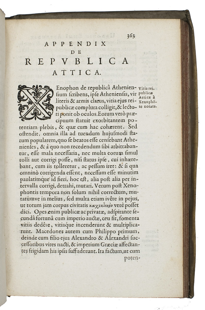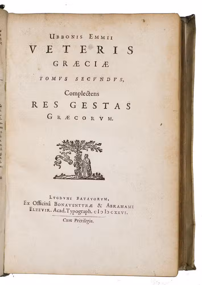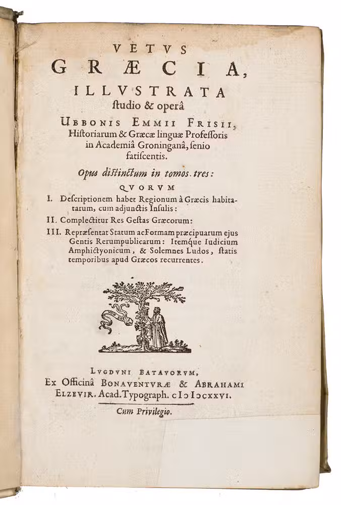 First edition of this highly interesting and original work in three parts on the geography, history and form of government of the Greeks, which Ubbio Emmius (1547-1625) composed during the last years of his life, and which was published posthumously in Leiden in 1626 by the Elzevier brothers with a dedicatory introduction is by his son Wessel.