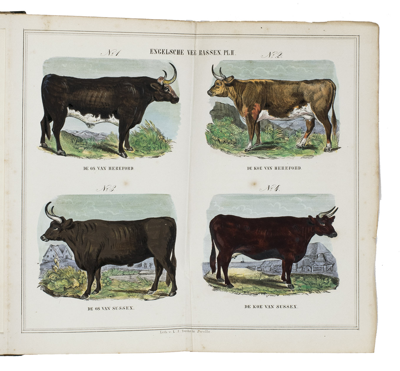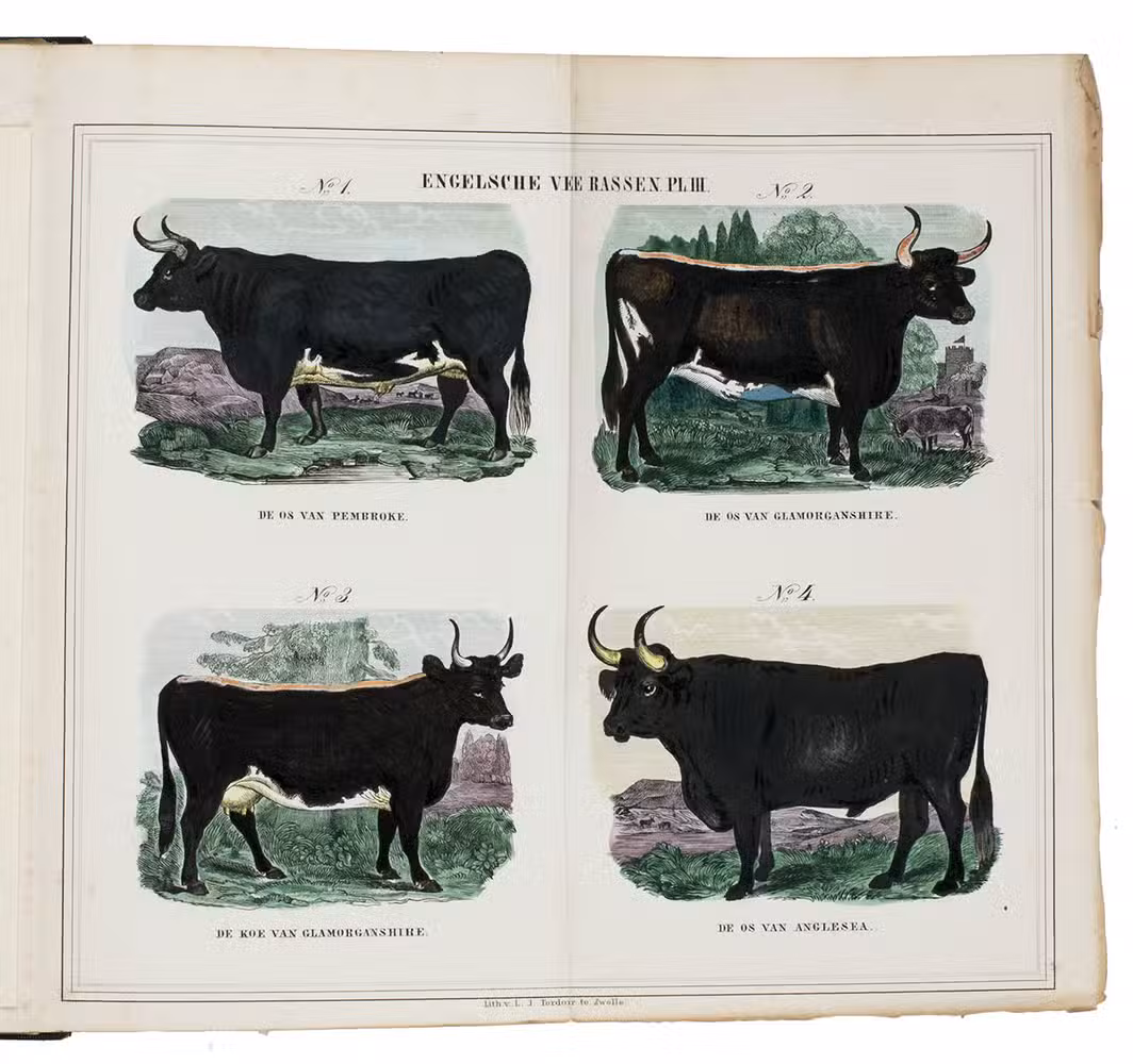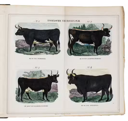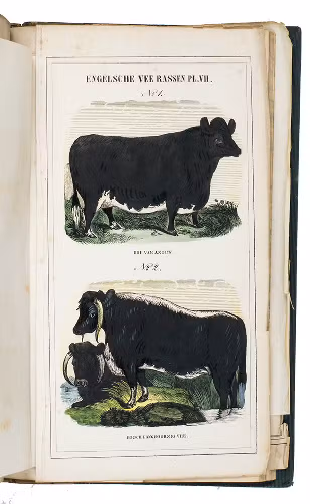 Zwolle, W.E.J. Tjeenk Willink, 1852. With 32 charming handcoloured illustrations of British cattle breeds on 9 folding lithographed plates by L.J. Tordoir in Zwolle. Contemporary half calf with gold-tooled spine. [8], 342, [2] pp.