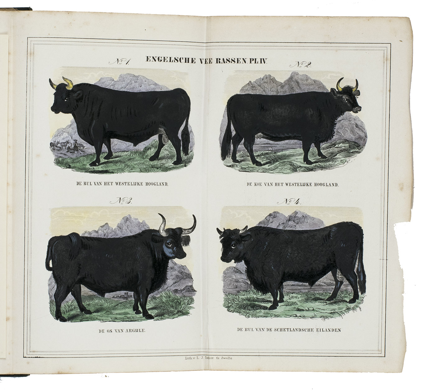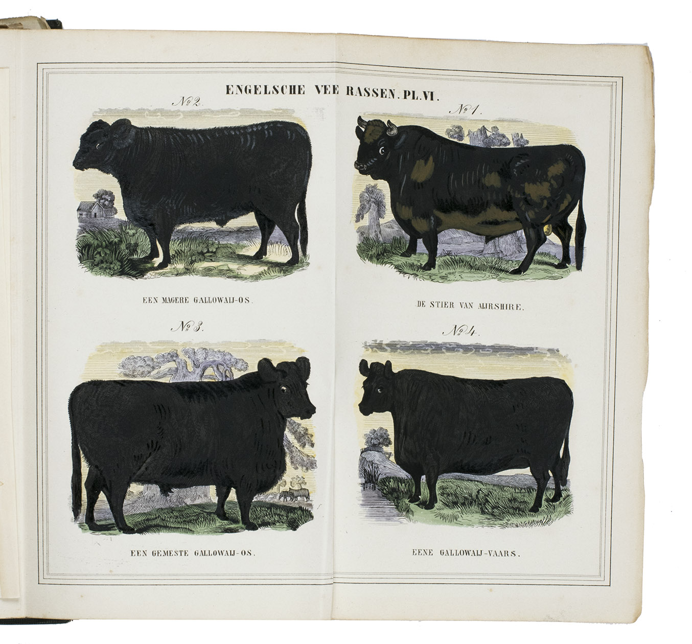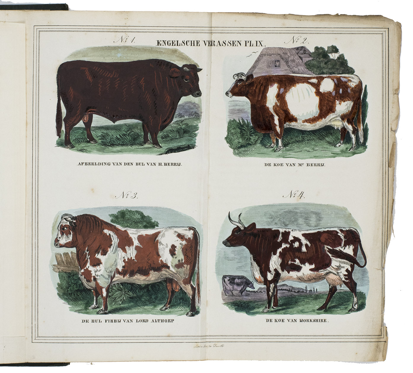 Zwolle, W.E.J. Tjeenk Willink, 1852. With 32 charming handcoloured illustrations of British cattle breeds on 9 folding lithographed plates by L.J. Tordoir in Zwolle. Contemporary half calf with gold-tooled spine. [8], 342, [2] pp.