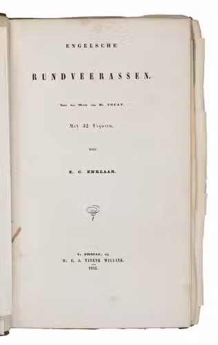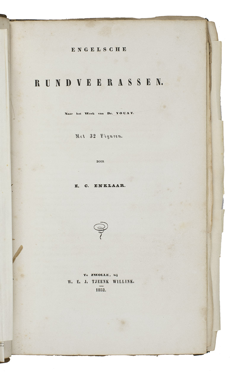 The translator, Evert Cornelis Enklaar (1799-1880), was an authority on Dutch agriculture in his time. He was the author of the influential Dutch agricultural manual Handboek voor den beoefenaar van den landbouw (1854) and many other works on the same subject. The present cattle book is very rare, the NCC only names 3 Dutch libraries with a copy.