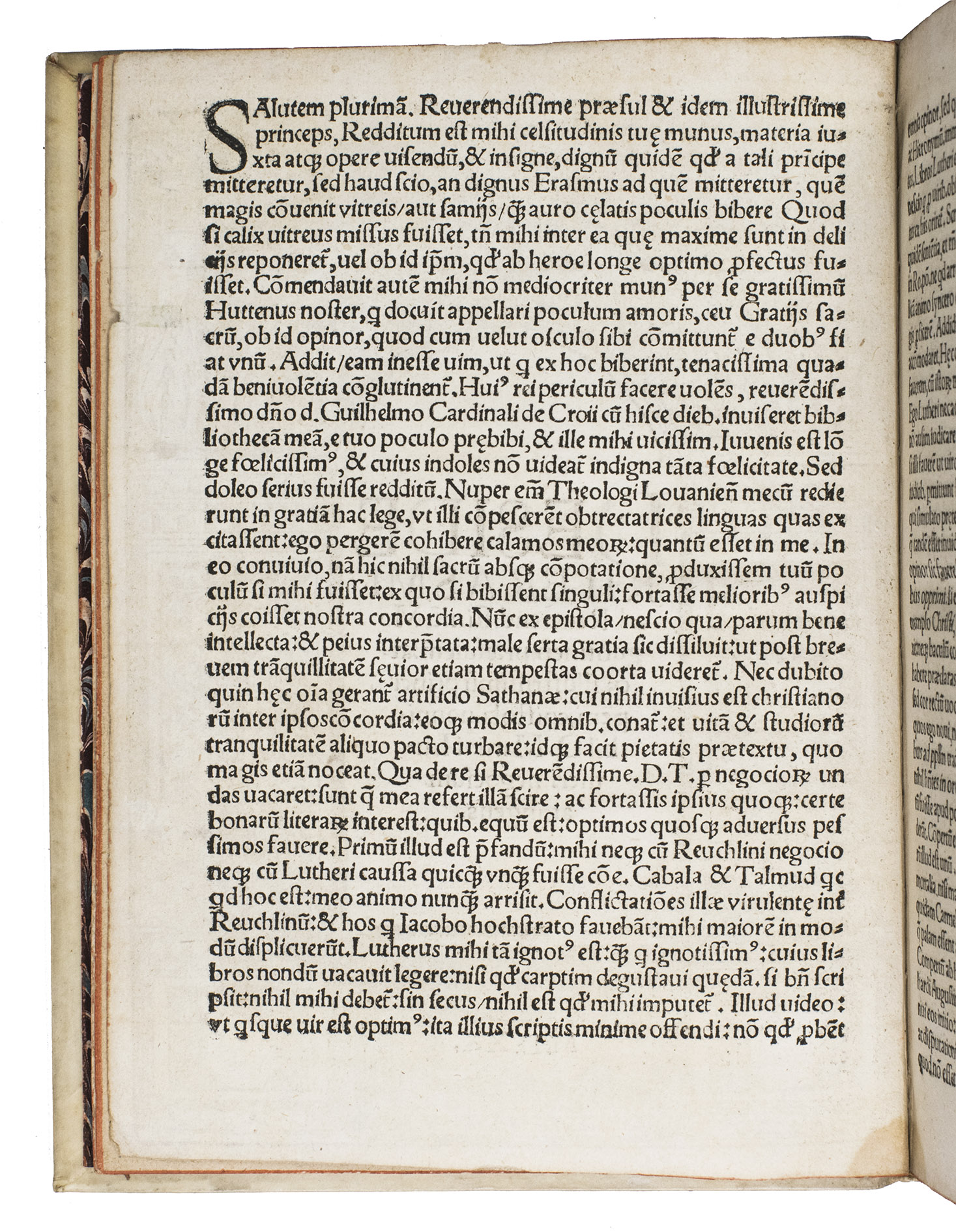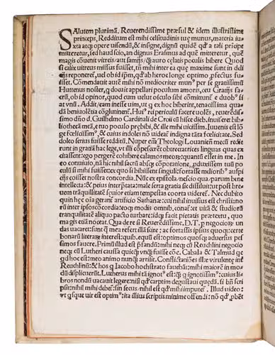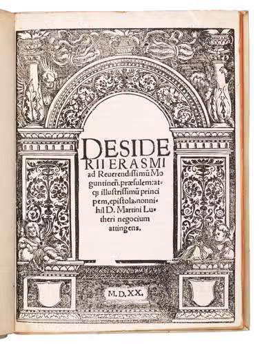 Early print of the letter Erasmus wrote to Cardinal Albrecht of Brandenburg, Archbishop of Mainz, in October 1519, with statements about Luther. In it Erasmus recommends to hear Luther, whom he defends in several instances, and suggests to help him where he errs. The letter was delivered by Ulrich von Hutten (1488-1523) and likely published without Erasmus's consent. The present edition is one of seven unauthorised editions published in the same year. It was printed by Marcus Wirsung (ca. 1460-ca.1520) and Sigmund Grimm (ca. 1480-1530), whose printing office was the most important publication centre for humanist literature in pre-Reformation Augsburg. Their edition includes a beautiful title border by Hans Weiditz (1495-ca.1537), and is among the rarest of the seven, with only five copies recorded by the Universal Short Title Catalogue (USTC). The present copy was auctioned at Sotheby's in 1955 and 1980, and is one of only two copies that we have been able to trace in sales records.