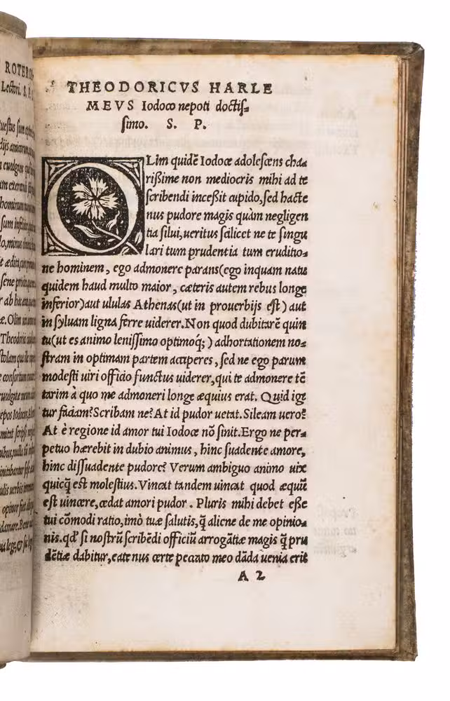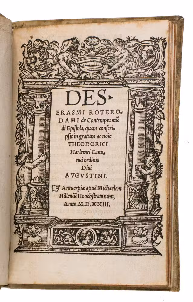 Very rare early edition of Erasmus first written work, a letter in praise of monastic life, which was only published later in his career. Erasmus wrote it in 1488 or 1489 when he was 20 years old, at the request of Theodoricus of Haarlem, a fellow canon at the Augustine monastery at Steyn, in order to persuade his nephew to join the order. It circulated in manuscript form for many years, and was likely used to entice prospective candidates to enter the order of Canons Regular of St. Augustine.