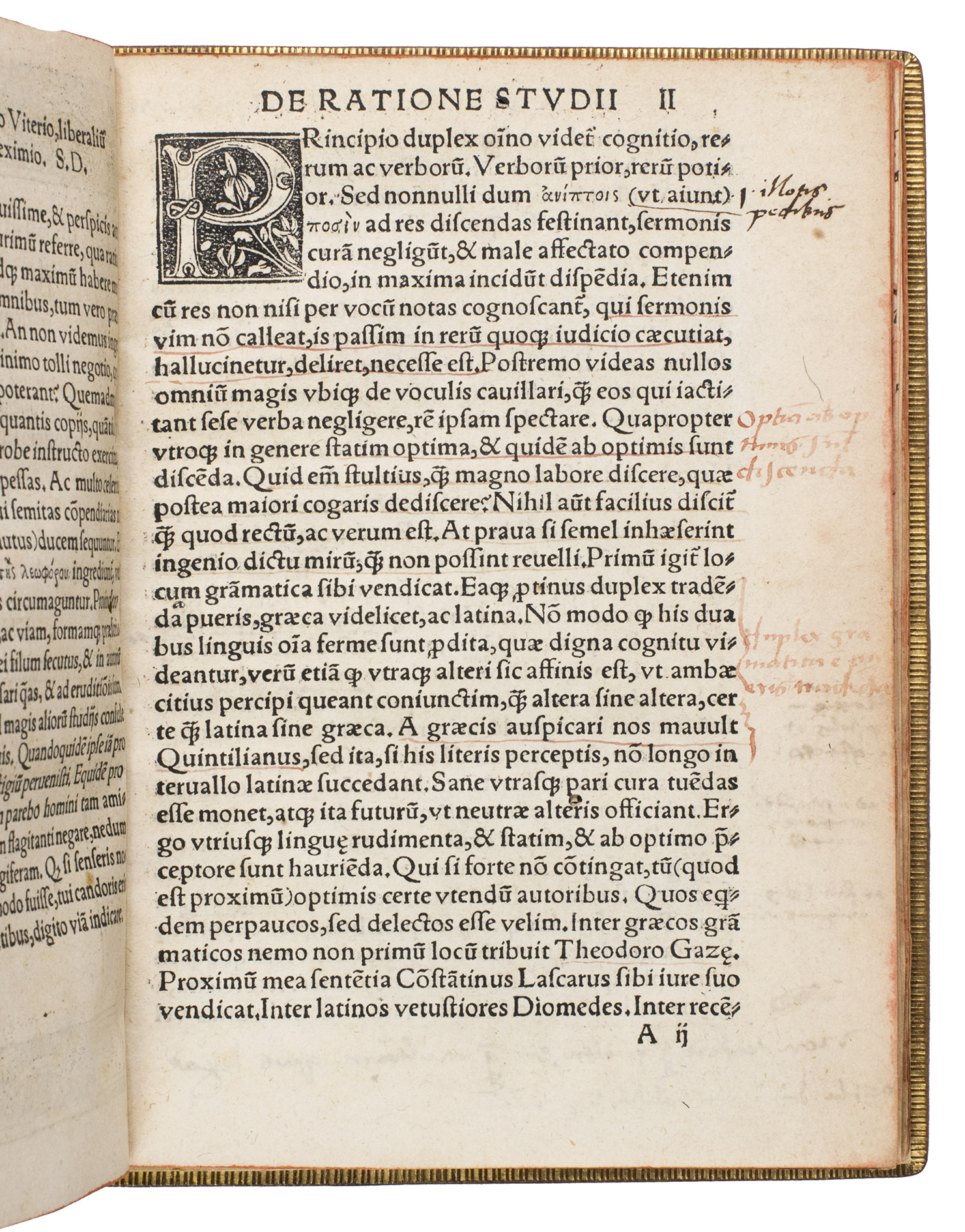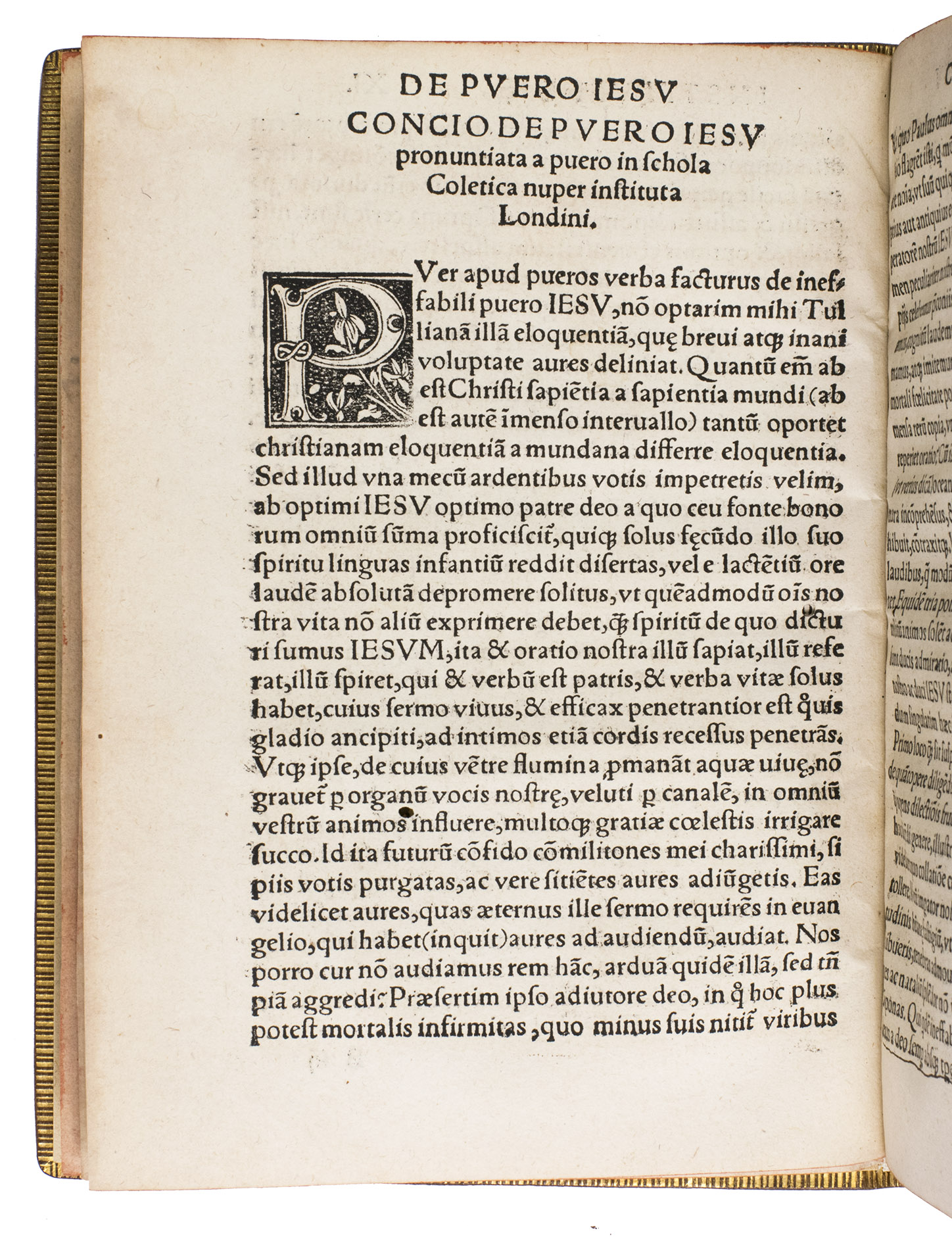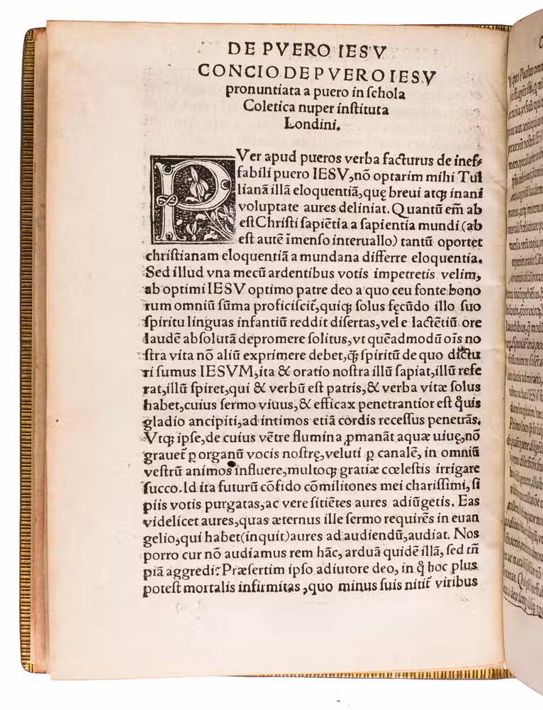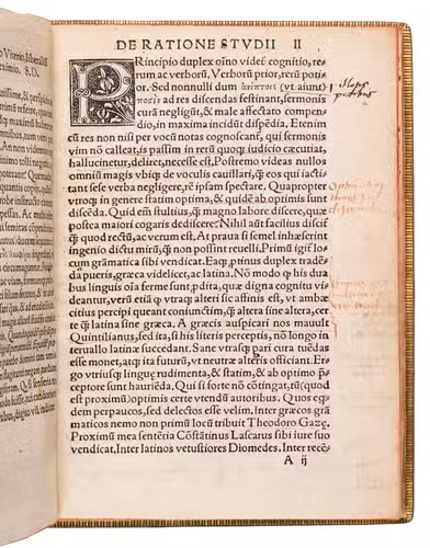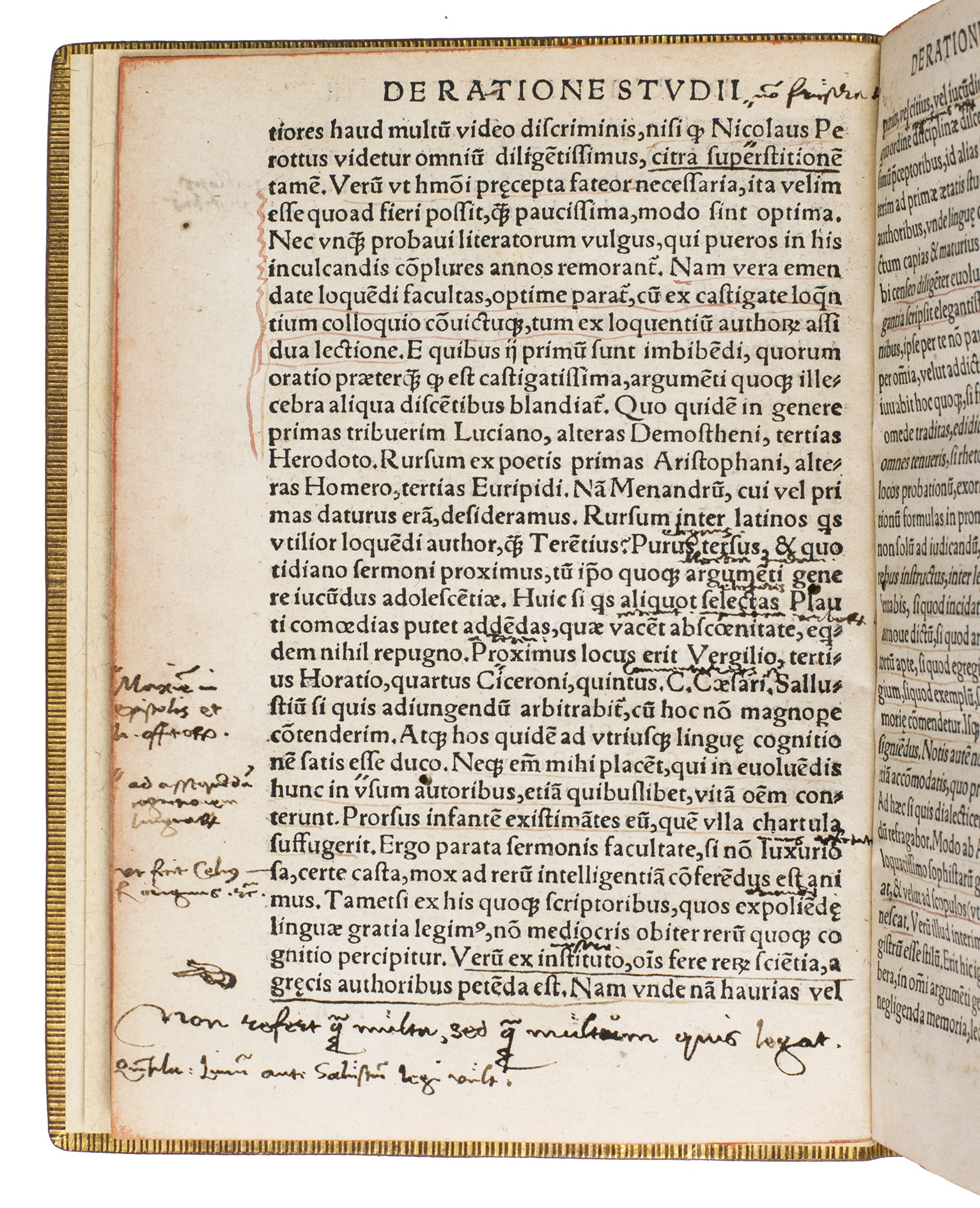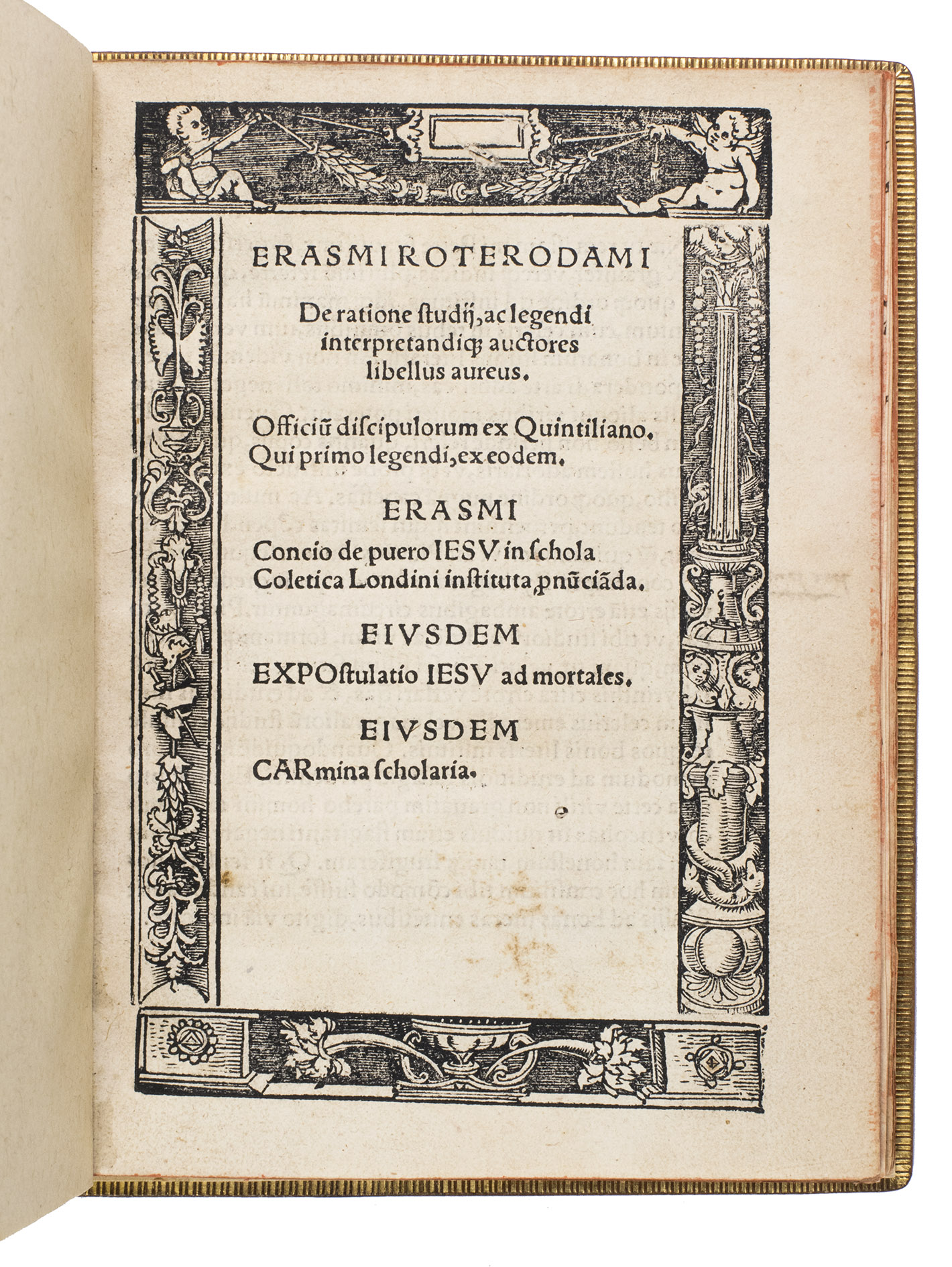 Early edition of Erasmus seminal educational treatise De ratione studii, here presented alongside several other influential pedagogical and devotional texts. It further includes: Officium discipulorum ex Quintiliano (The duties of students according to Quintilian), including a section on the first stages of learning to read, also derived from Quintilian, a sermon on the child Jesus by Erasmus, intended for delivery at the Colet School in London, a lament of Jesus addressed to mankind, and a collection of school poems.