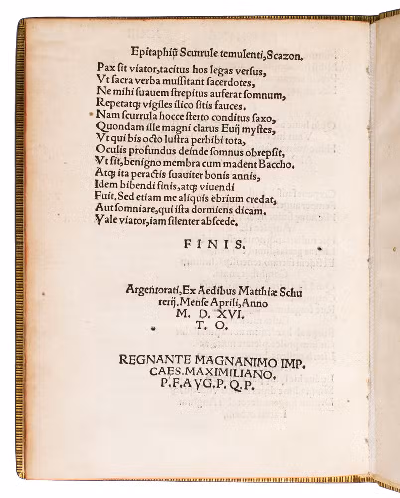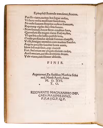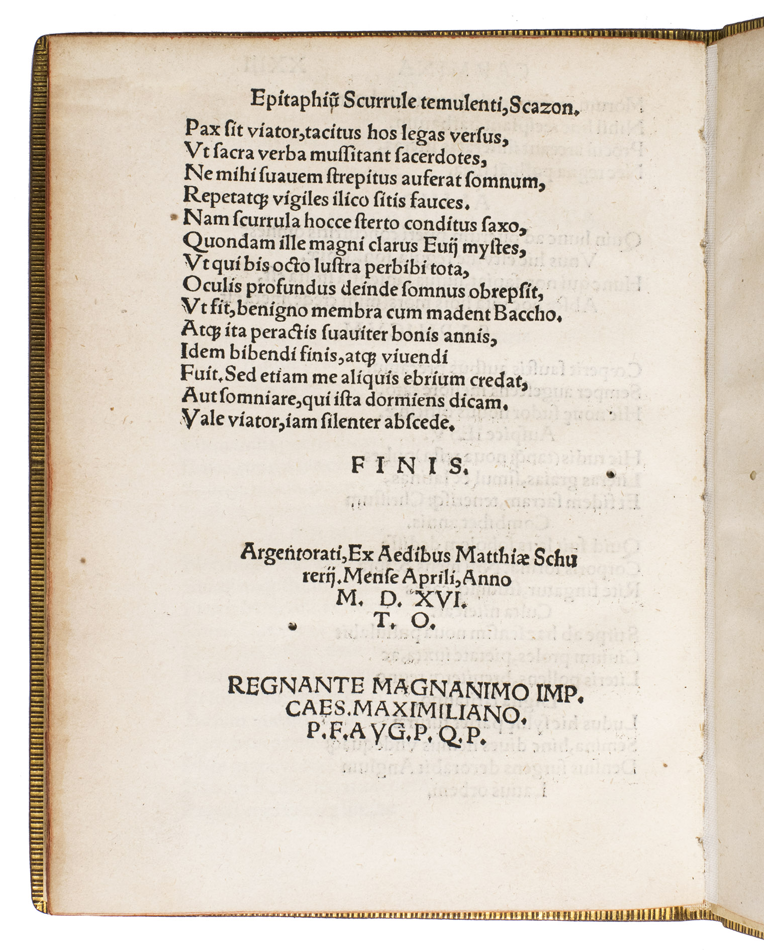 (Colophon) Strasbourg, Matthias Schürer, April 1516. 4to. With a woodcut decorated title frame and 3 woodcut decorated initials. Modern brown pigskin. XXIII, [1 blank] ll.