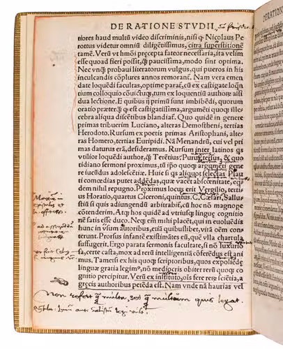 Of particular note is Erasmus endorsement of an instructional technique that became central to Renaissance humanist pedagogy: the use of structured annotation. In De ratione studii, he recommends that students classify selected passages under thematic headings, a mnemonic device that aids both retention and retrieval. This principle would go on to shape the methods of early modern teaching and note-taking. It also reflects Erasmus' broader educational reforms, where rhetoric and moral philosophy intersect. His engagement with progymnasmata (preliminary rhetorical exercises), especially those of Aphthonius, favoured for their clear organisation into theory and examples, demonstrates his commitment to practical and accessible instruction for young learners.