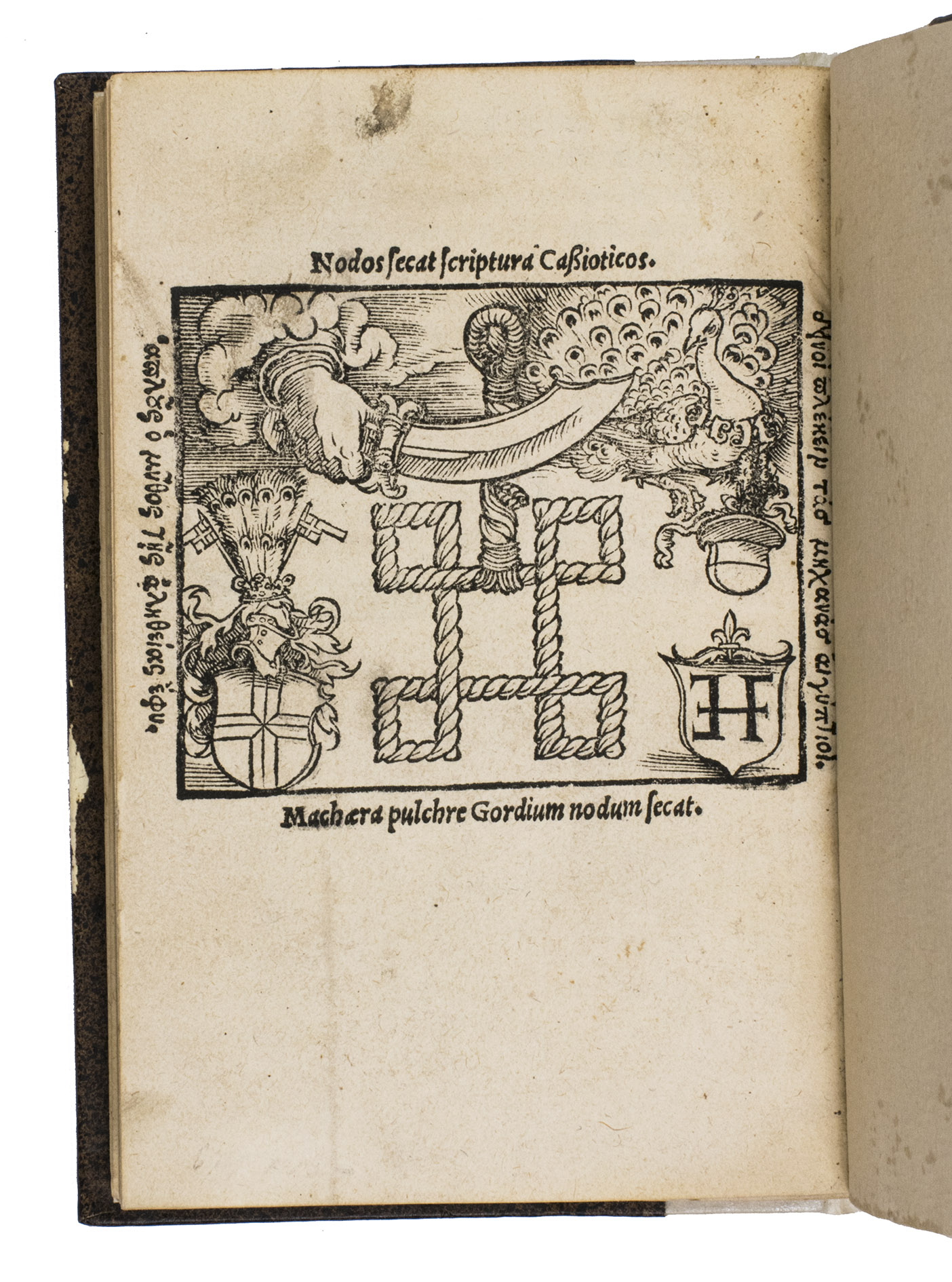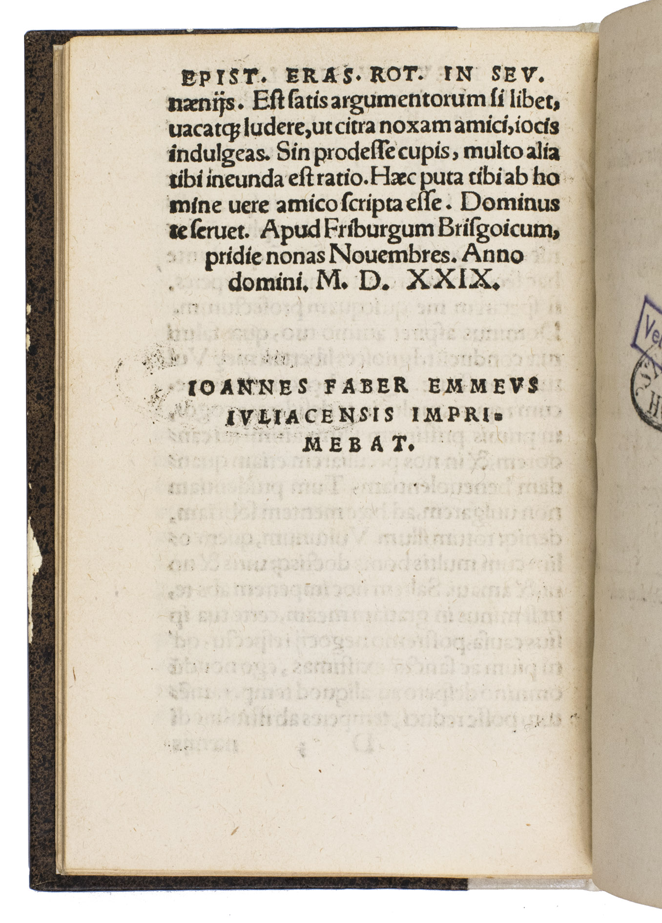 With a black oval stamp ("Stadtbibliothek zu Homburg V.D.H") on the title page, one small ("Veräusserte doublette") and one larger blue/purple rectangular stamp ("Stadt-Bibliothek Homburg ...") on the verso of the title page, and a repeat of the oval and smaller rectangular stamps on the blank recto of the last leaf; all from the city library in Bad Homburg vor der Höhe in Germany. The binding is very slightly damaged along the fore-edge of the front board, some occasional minor staining. Otherwise in very good condition. Bezzel 953; Bomelius p. 20; Erasmus Online 2045; Prinsen p. 92; USTC 651263; Vander Haeghen I, 97; not in Adams; BM STC German; De Reuck.