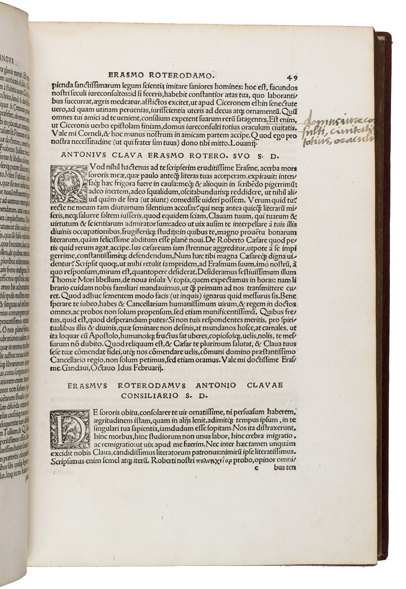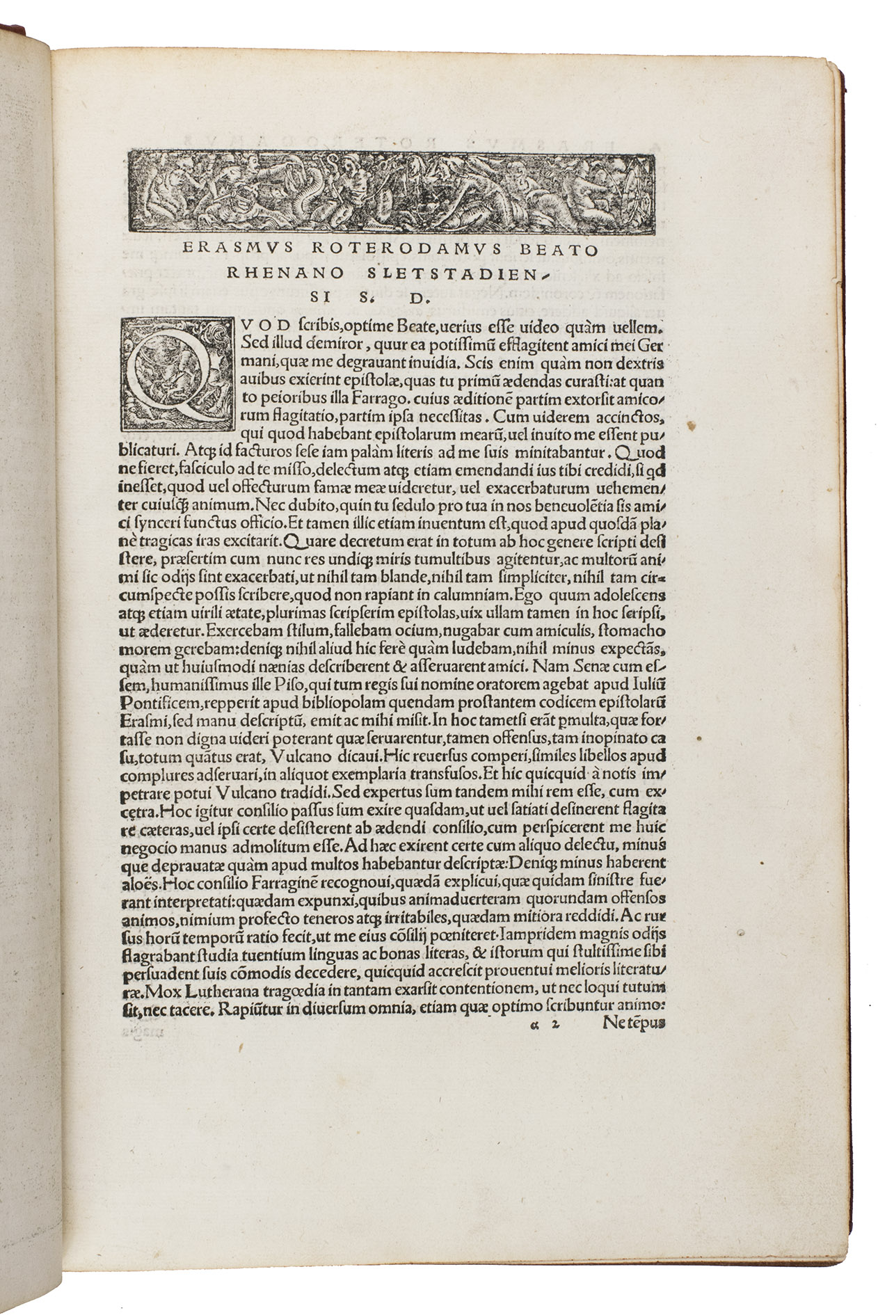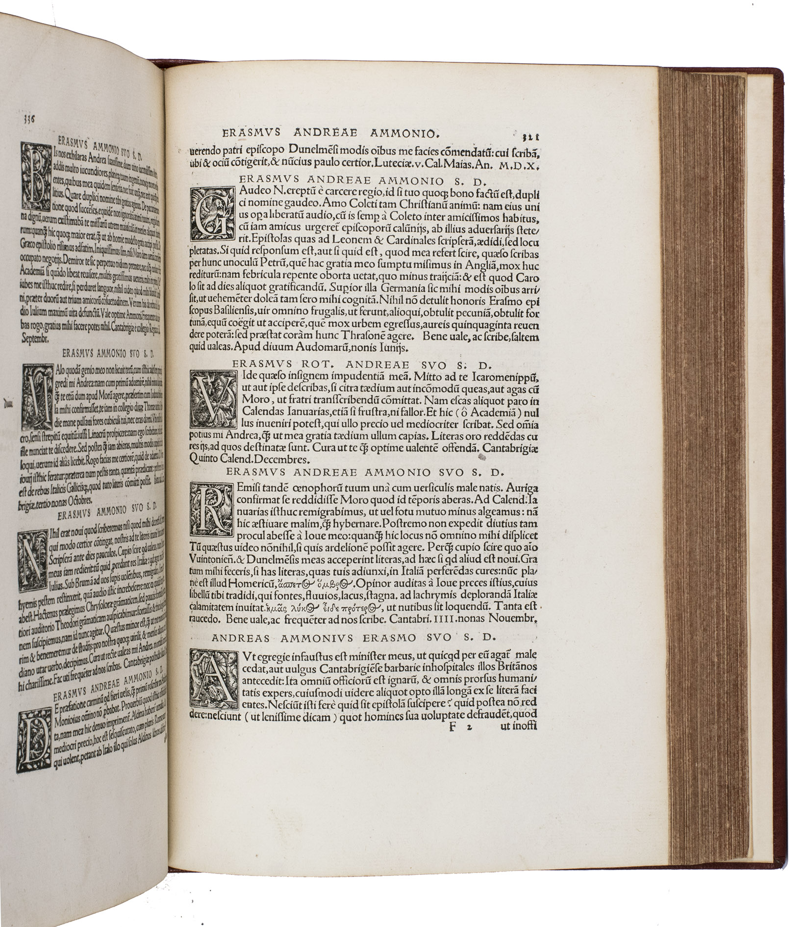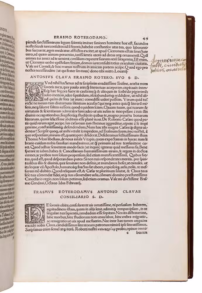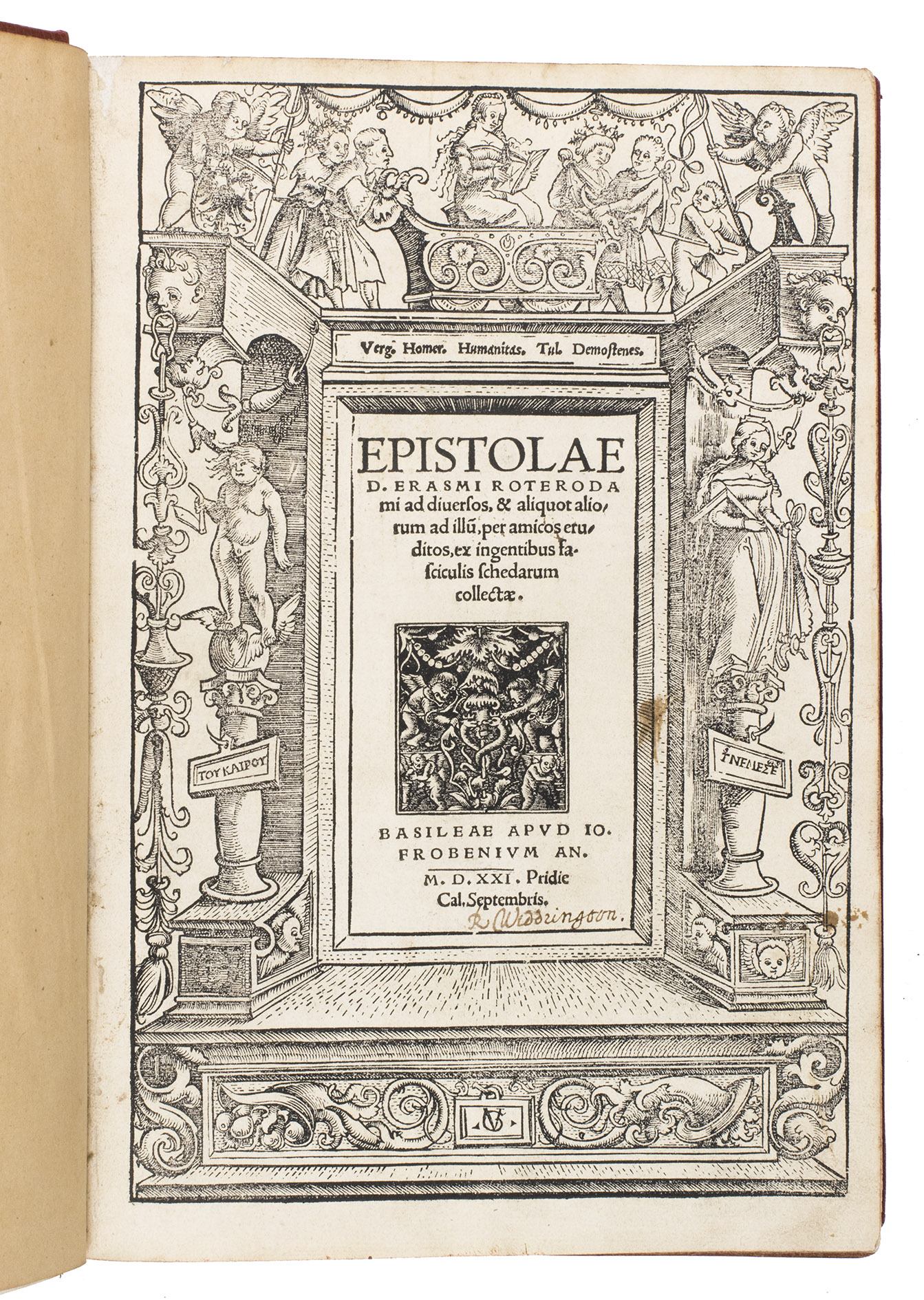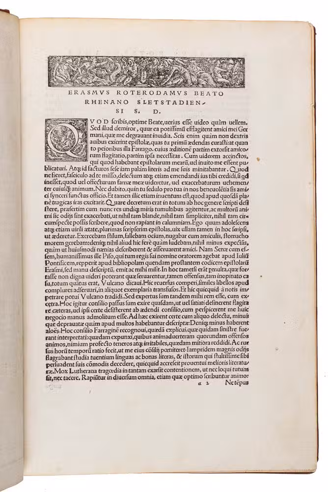First complete edition of the letters of Desiderius Erasmus, containing 171 letters which had never been published before, with correspondence with many of the most prominent figures of the 16th century. The work has been beautifully illustrated with a splendid large woodcut title border by Urs Graf (ca. 1485-1528), known as "The triumph of Humanitas", and two fine borders by Ambrosius Holbein (ca. 1494-1519). The present copy has been annotated in several contemporary hands, and was owned by Ralph Widdrinton (d. 1688), the Regius professor of Greek at Cambridge University.