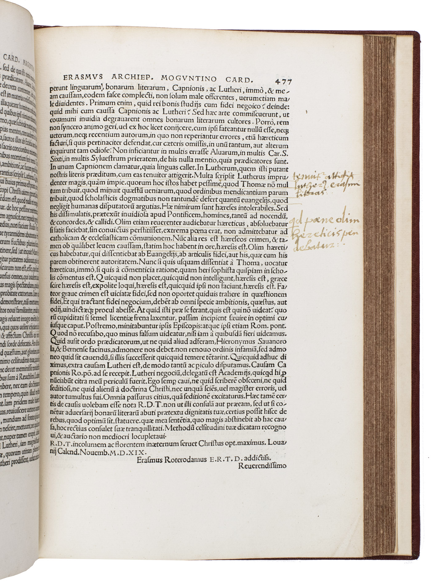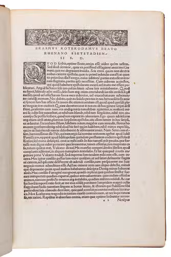 With a later ownership annotation ("R. Widdrington") on the title page. The binding is very lightly soiled. The work is slightly browned throughout, with contemporary and later manuscript annotations in the margins in three different hands, a vertical tear in the upper part of the first errata leaf, without loss of text. Otherwise a very good copy with ample margins. Adams E 852; BM STC German p. 276; Erasmus Online 2069; USTC 651629 (34 copies); Vander Haeghen I, 99; VD 16 VD16 E 2925.
