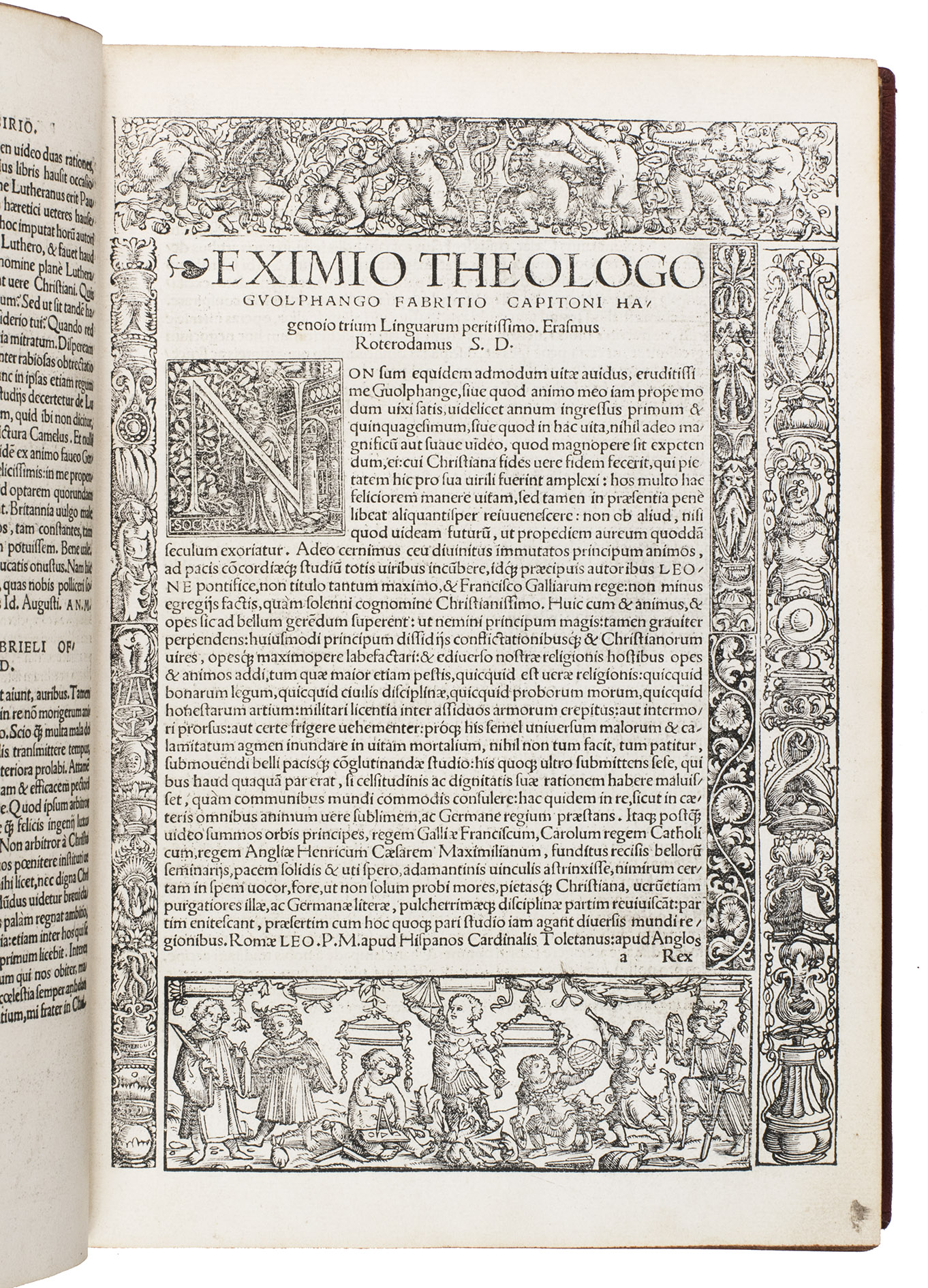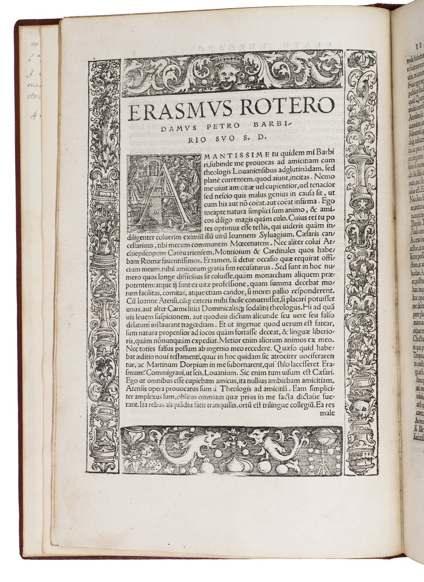 Basel, Johann Froben, 31 Aug. 1521. Folio. With a decorative woodcut border on the title page by Urs Graf, 2 decorative woodcut borders in the text by Ambrosius Holbein, numerous decorated woodcut initials, and a woodcut printer's device at the end of the work. Modern blind-tooled red morocco. 12, "668" [=618], [6] pp