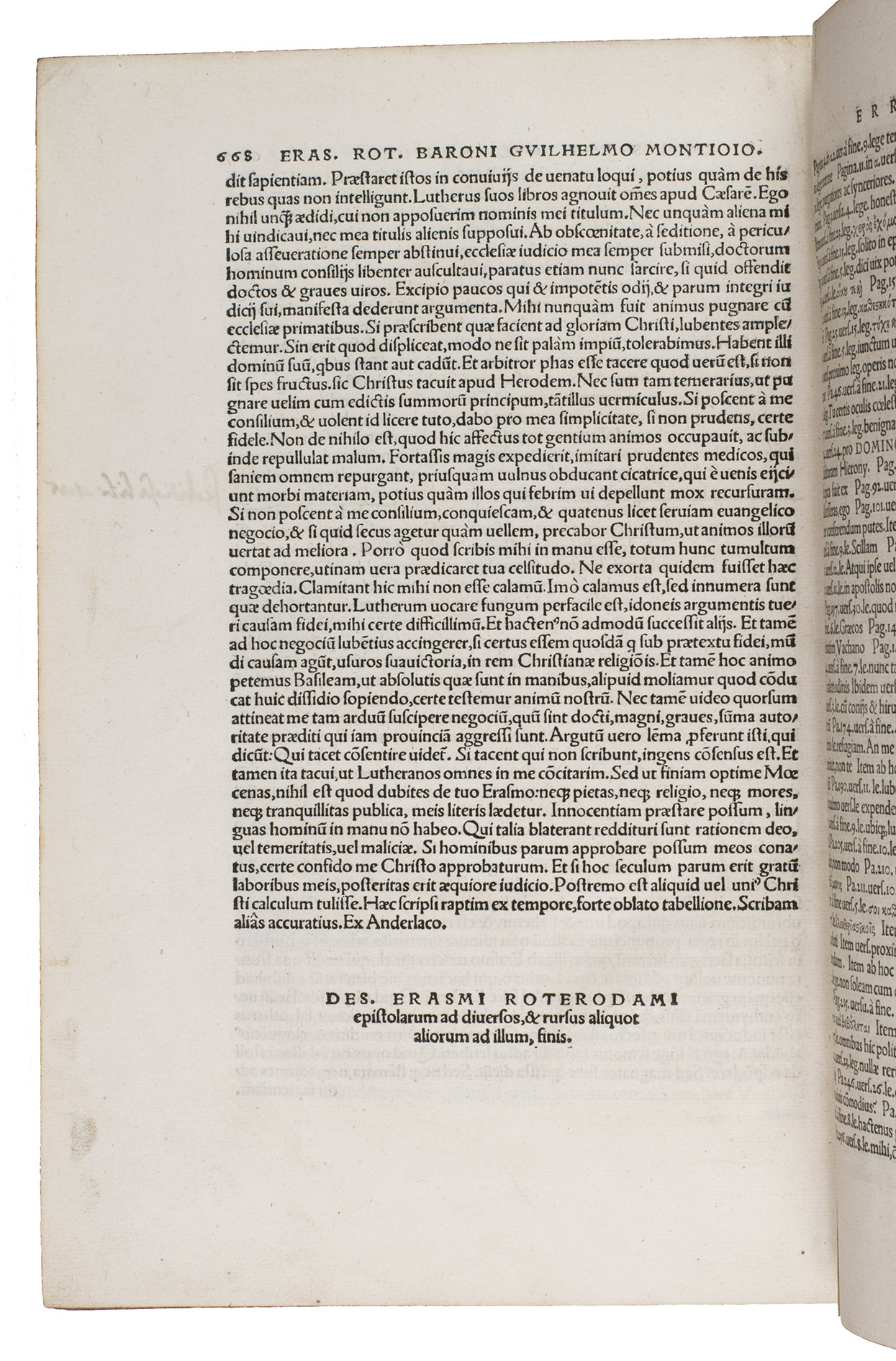 The Epistolae ad diversos contains 617 letters in total and is far larger than any of the earlier collections of Erasmus' correspondence, namely the Epistolae aliquot of January 1518 (52 letters), the Auctarium of October 1518 (63 letters), and the Farrago of November 1519 (333 letters). The present letter collection is also the first with a preface by Erasmus. The majority of the letters date to 1519-1521, but some are earlier, with the first dated to 11 July 1513. They reflect Erasmus' changing stance towards Luther and Protestantism, but also continue his attacks on friars and the theologians of Louvain. Among the authors correspondents are prominent humanists and other important figures, including Beatus Rhenanus, Ulrich Zasius, Johann Eck, Guillaume Budé, Jean Grolier, Georg Spalatin, Hermann von dem Busche, Konrad Peutinger, John Colet, Thomas More, John Fisher, Thomas Linacre, William Grocyn, Luther, Melanchton, Pope Leo X, and Henry VIII, King of England. Erasmus later made many editorial changes to the letters, making the present edition of particular importance.