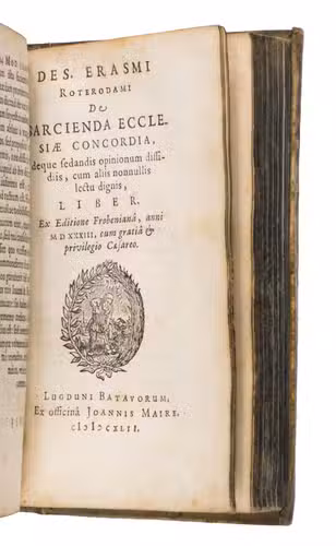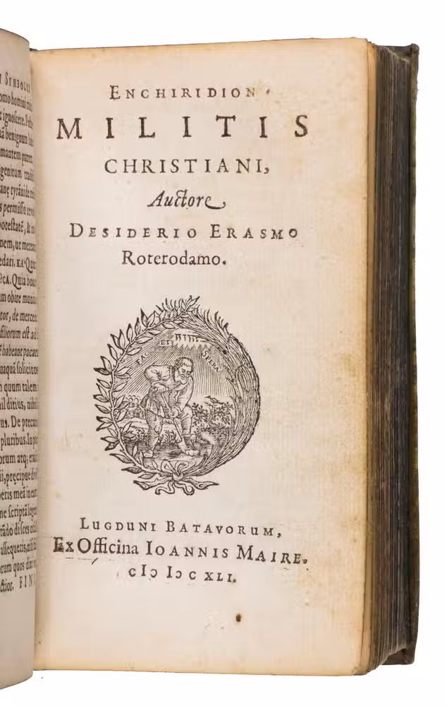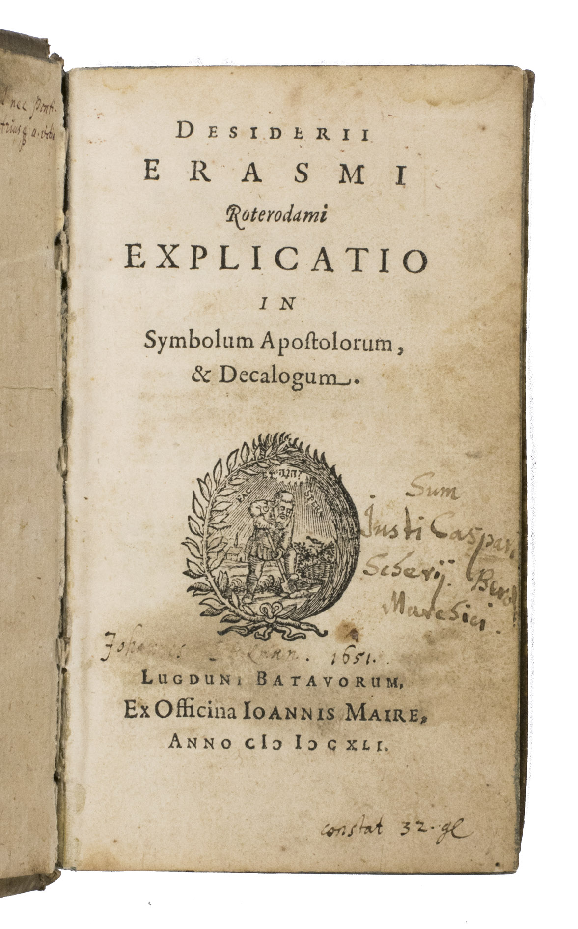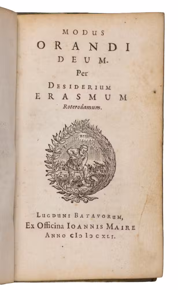 Fine Sammelband with four theological works by Desiderius Erasmus, all published by the well-known Leiden printer Joannes Maire. The present work containing four 17th-century editions reflects the enduring popularity of Erasmus' didactic and theological writings nearly a century after his death.