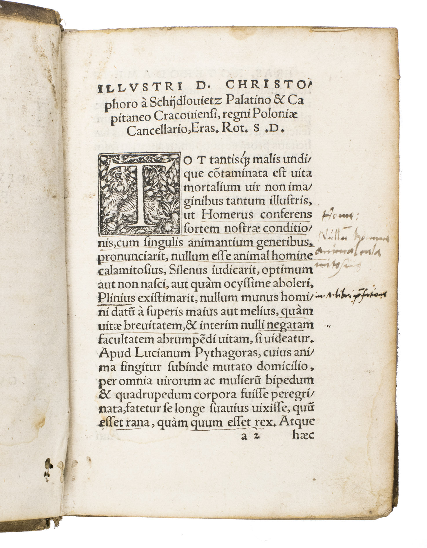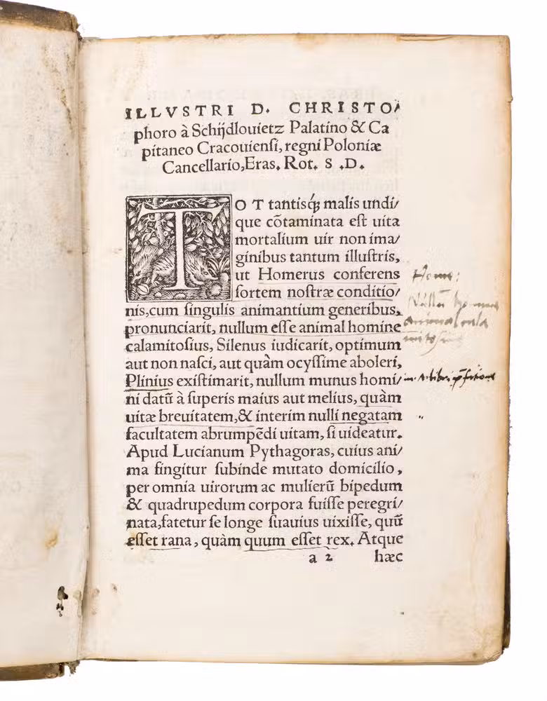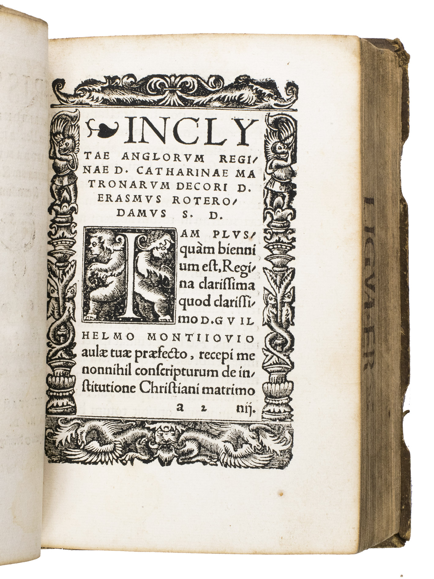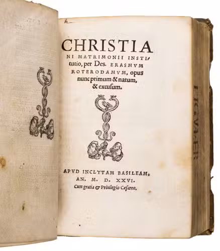 Ad 2: First edition of a moral treatise written for Catherine of Aragon, Queen of England, and first published in 1526. The work is described by Johan Huizinga as "one of the purest and most beneficent moral treatises,". It comprises Erasmus humanist and theological vision of marriage as a sacred union of souls as well as bodies, the foundation of family and society, and a mirror of the bond between Christ and the Church. This is the genuine first edition, preceding the folio edition, as shown by the presence of a list of errata not present in later editions.