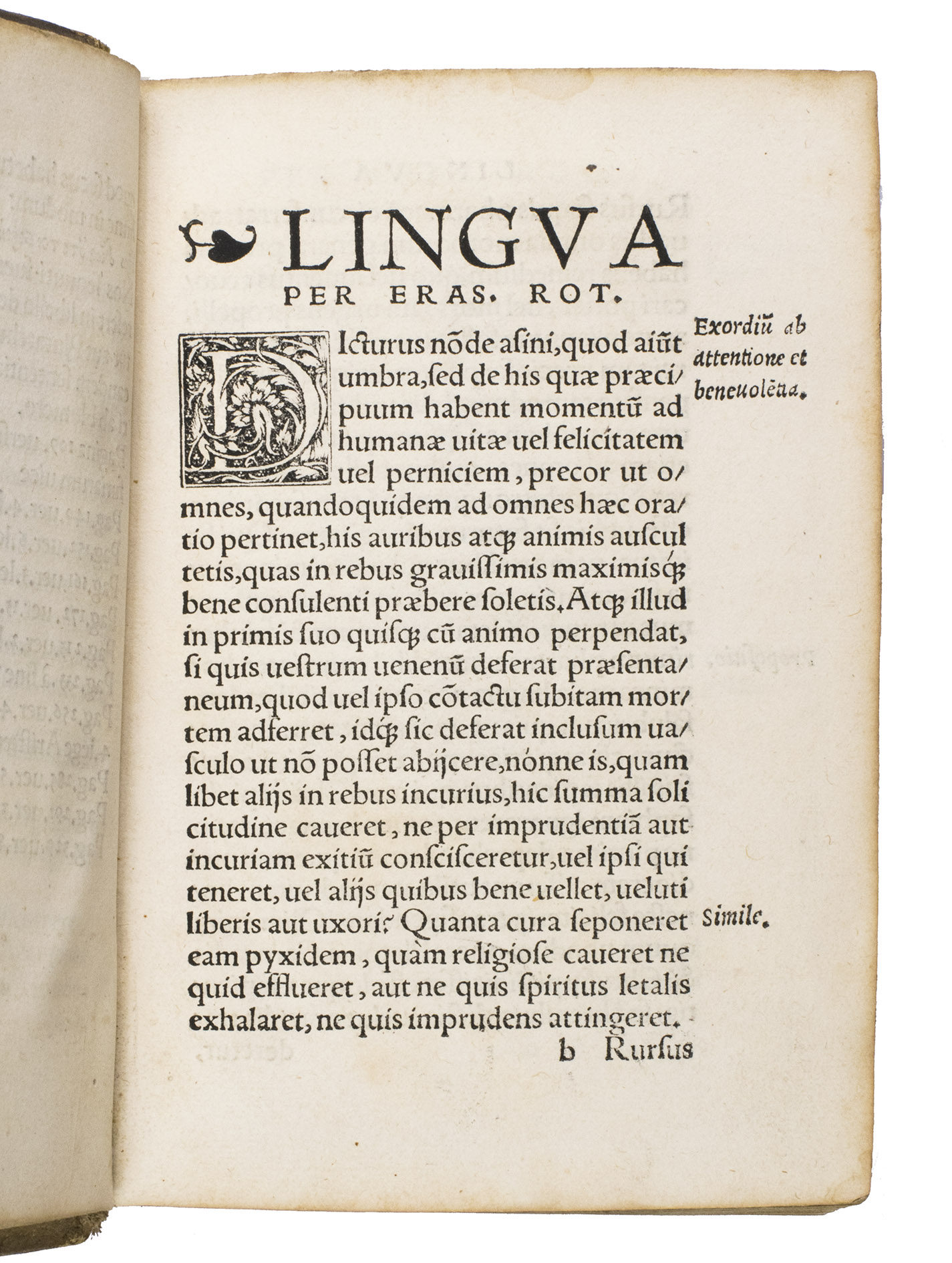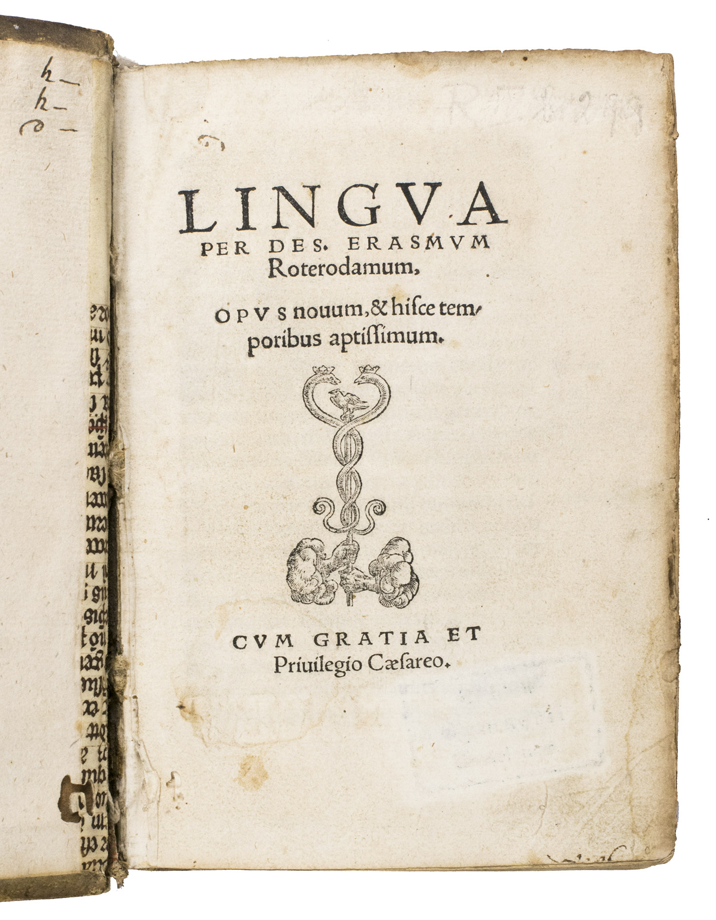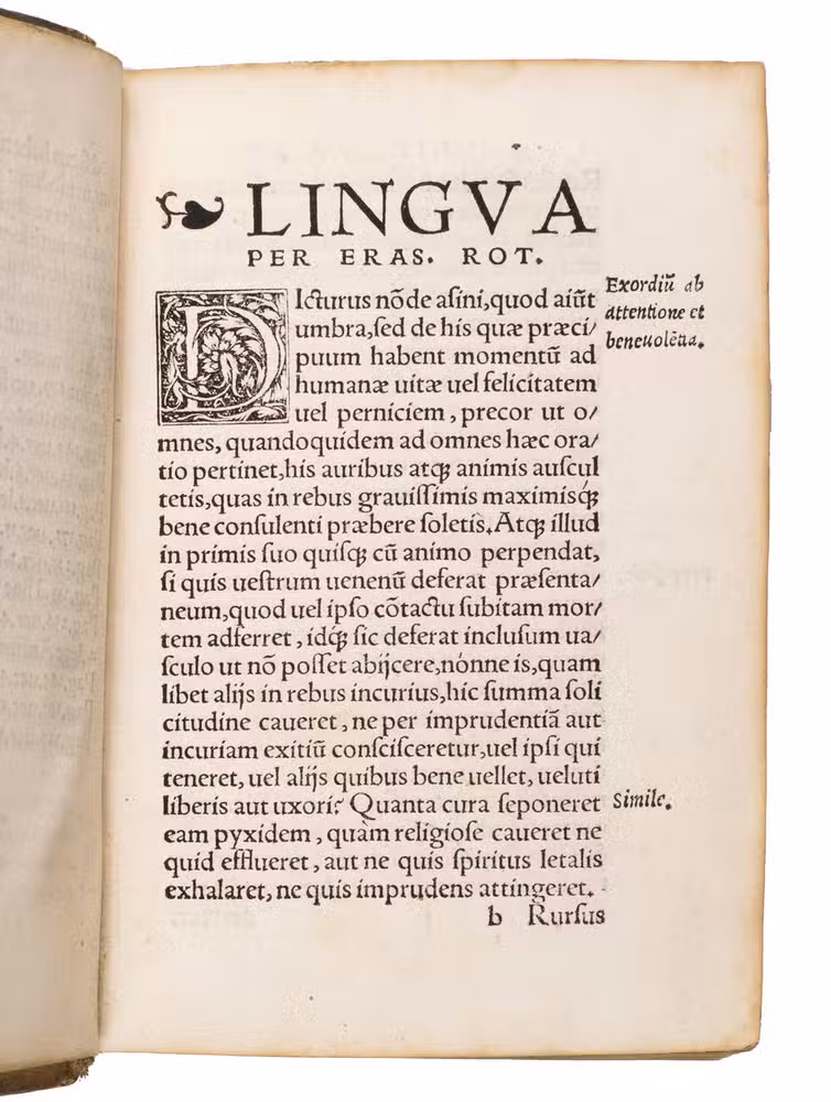 Ad 1: First edition, in Latin, of an eloquent treatise on the use and abuse of the human tongue, exploring how speech can both edify and destroy. Rich with anecdotes drawn from classical and biblical sources, Erasmus warns against gossip, falsehood, and unrestrained speech, urging instead honesty and self-control. The work proved especially popular in the Low Countries, where no fewer than fourteen Dutch translations appeared between 1533 and 1633.
