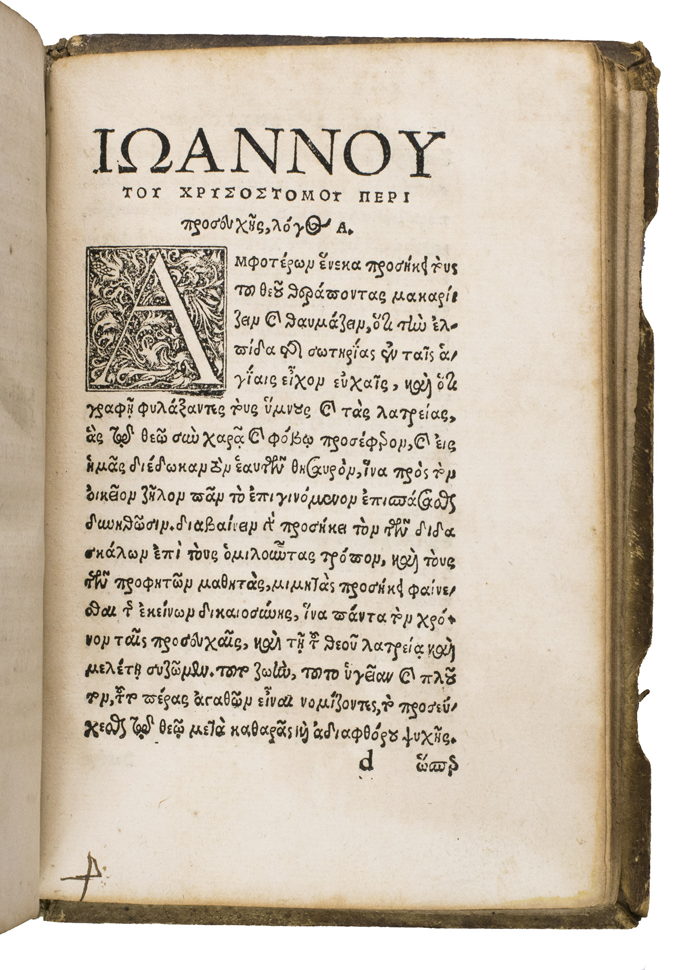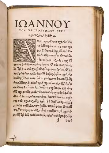 Ad 3: Erasmuss first Latin translation of two treatises on prayer by Saint John Chrysostom (ca. 347-407 CE), accompanied by the original Greek text. Chrysostom reflects on the nature and power of prayer, the inner disposition of humility and purity required of the supplicant, the various forms of prayer (praise, thanksgiving, petition, intercession), and the particular efficacy of communal devotion. A spiritual manual for the Christian life, enhanced by Erasmus elegant rendering.