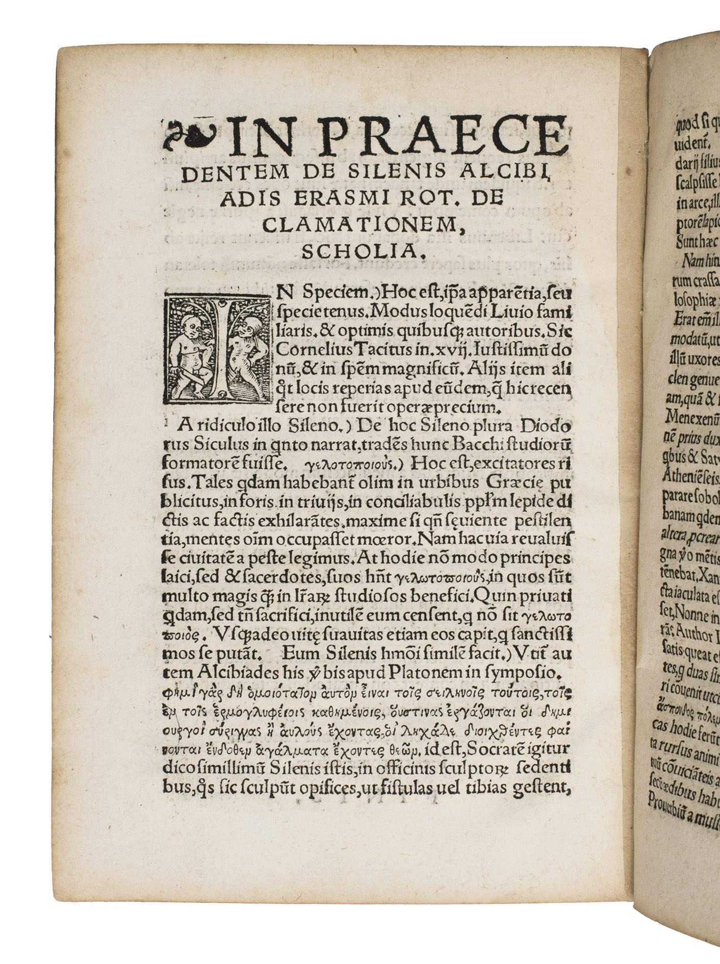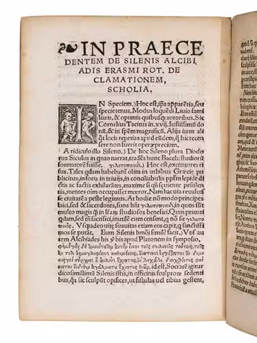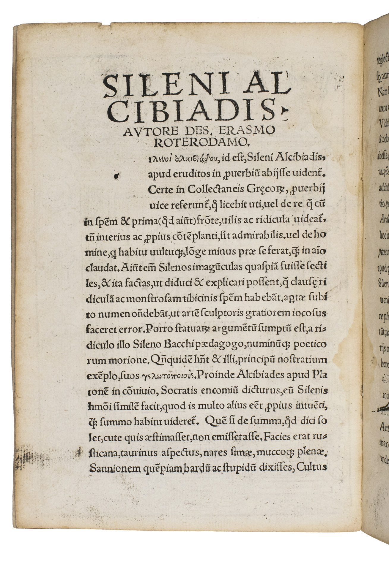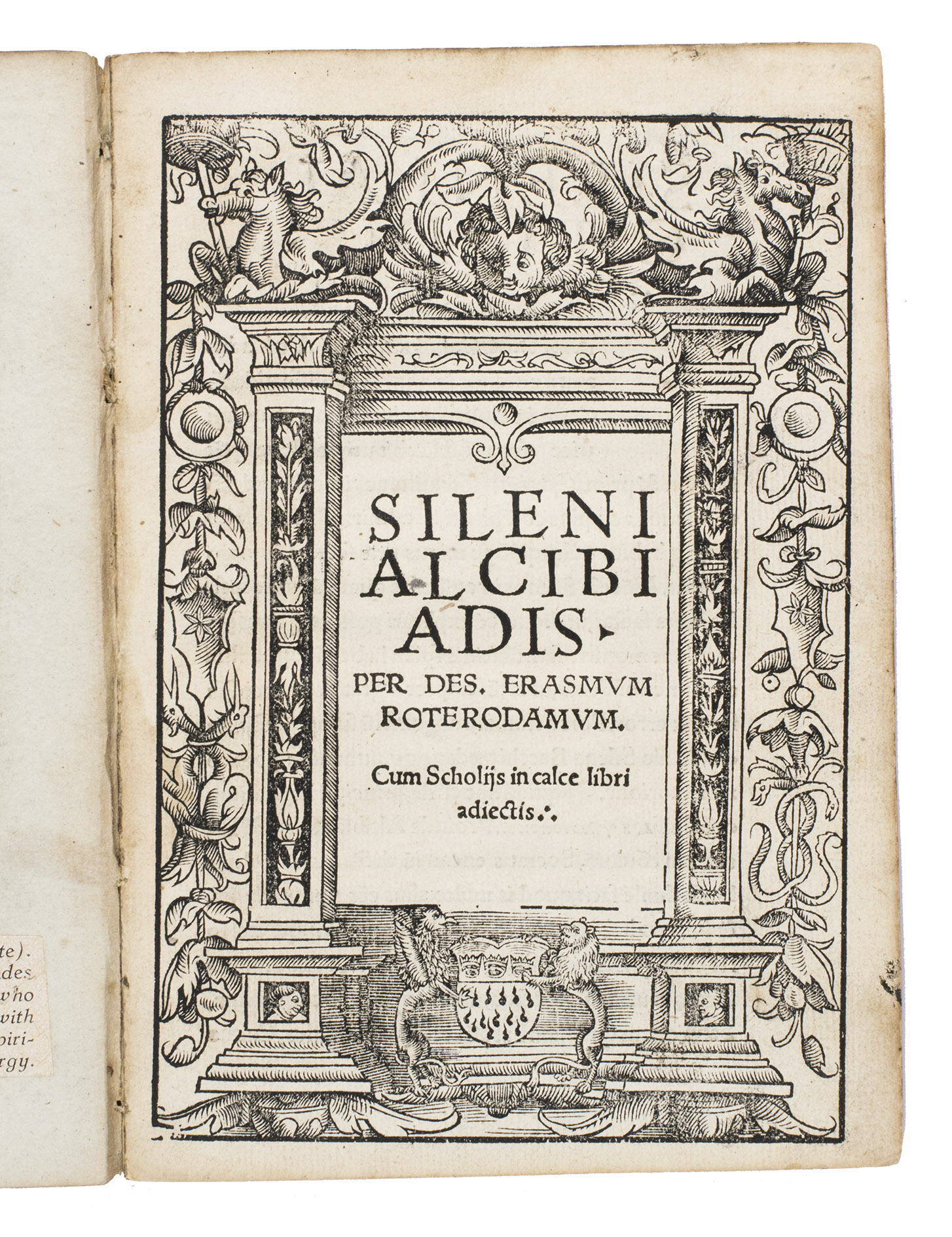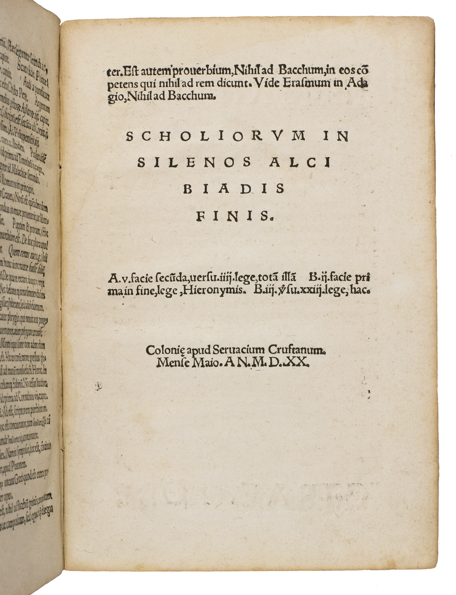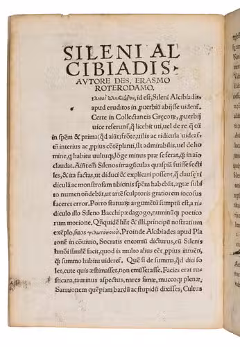 Rare, early edition of an influential work by Desiderius Erasmus, which is a call for reform of the Catholic Church. It uses the Ancient Greek figure Alcibiades (ca. 450-404 BC) and the mythical characters known as the Sileni as an allegory for looking beyond appearances in order to perceive someone's (or the Church's) true nature. Erasmus wrote the text as part of his compilation of proverbs, the Adagia, in particular for the revised 1515 edition, where it became one of the most popular entries. It was then published by Froben as a separate work in 1517, with his scholia. The present edition is the fourth or fifth overall, but the first by Servas Kruffter (fl. ca. 1520-1538), and is of considerable scarcity, with only five copies recorded in institutions and none in sales records. The Cologne printer Kruffter was repeatedly restricted by censorship and even put in jail several times. Only a comparatively small number of books from his limited production has survived.
