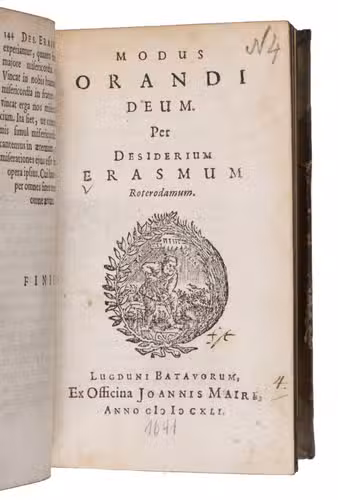 With a manuscript owner's inscription on the title pages of ads 1 and 6, a small manuscript inscription on the title page of ad 2, and a small manuscript inscription on the title pages of ads 3, 5, and 6-14. Further with two library stamps of the Nordelbische Kirchenbibliothek in Hamburg (incl. "Gelöscht" stamps) on the versos of the title pages of ads 1 and 6. The bindings are dust soiled and slightly damaged along the extremities, but the structural integrity of both bindings remains fine, slight foxing and browning throughout. Otherwise in good condition. Breugelmans, Fac et spera. Joannes Maire (2003), 1642:7 and other numbers; ads 2-6 and 10-14 in verzicht werken Erasmus (Rotterdam 1936); all works in the STCN and USTC; Van der Haeghen I, 182 and other numbers. A detailed list of references is available upon request.