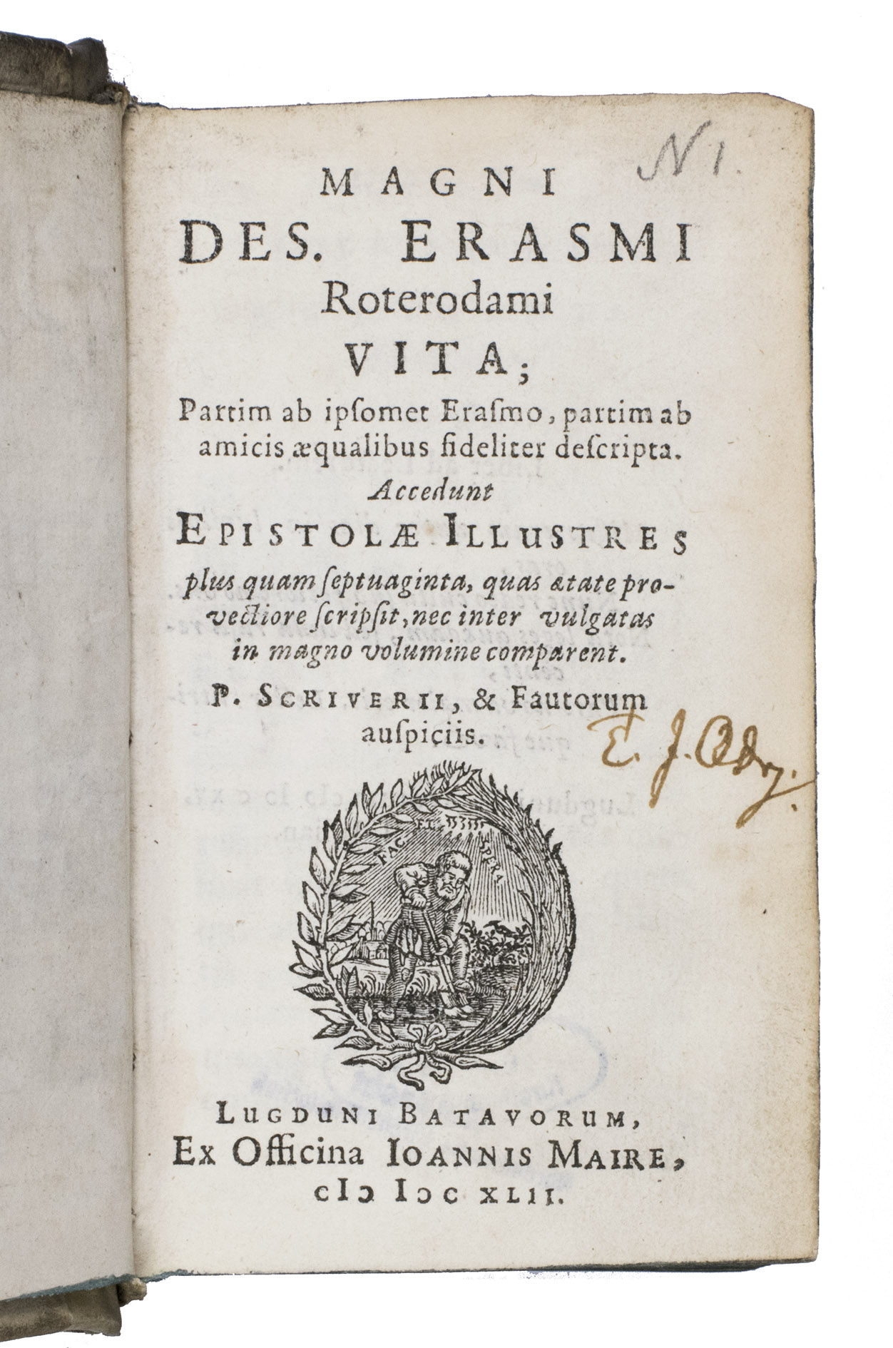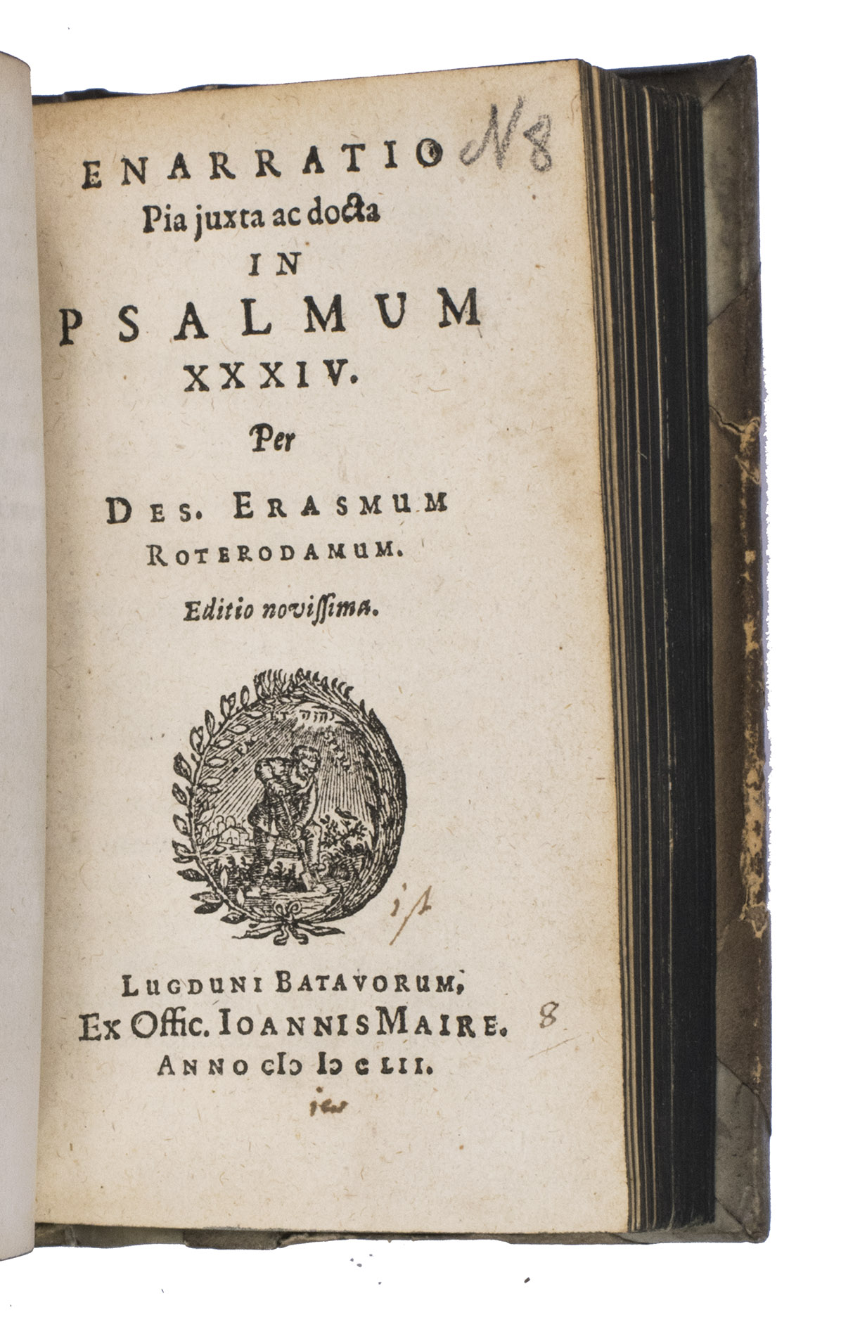 Leiden, Joannes Maire, 1652. 14 works in 2 volumes. 12mo. Ad 1 with an engraved title page by C. van Dalen showing Erasmus standing in a church with a book in his left hand pointing to three other men. All title pages contain Maire's woodcut device (see Breugelmans, nr. 13), and a woodcut portrait of Erasmus in a roundel on leaf *8r in ad 1 and his device in a roundel in the text on leaf 2*5v in ad 1. Further with several woodcut decorated initials throughout.