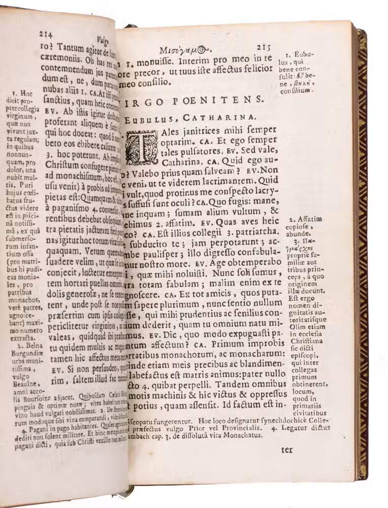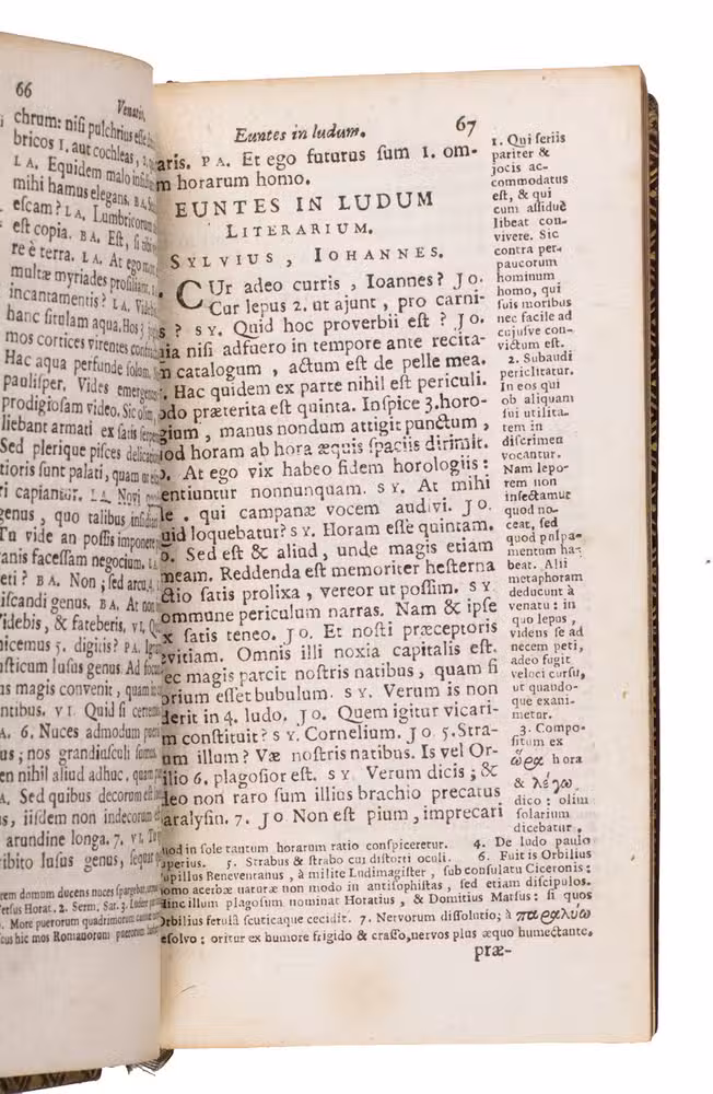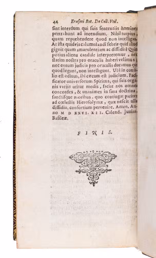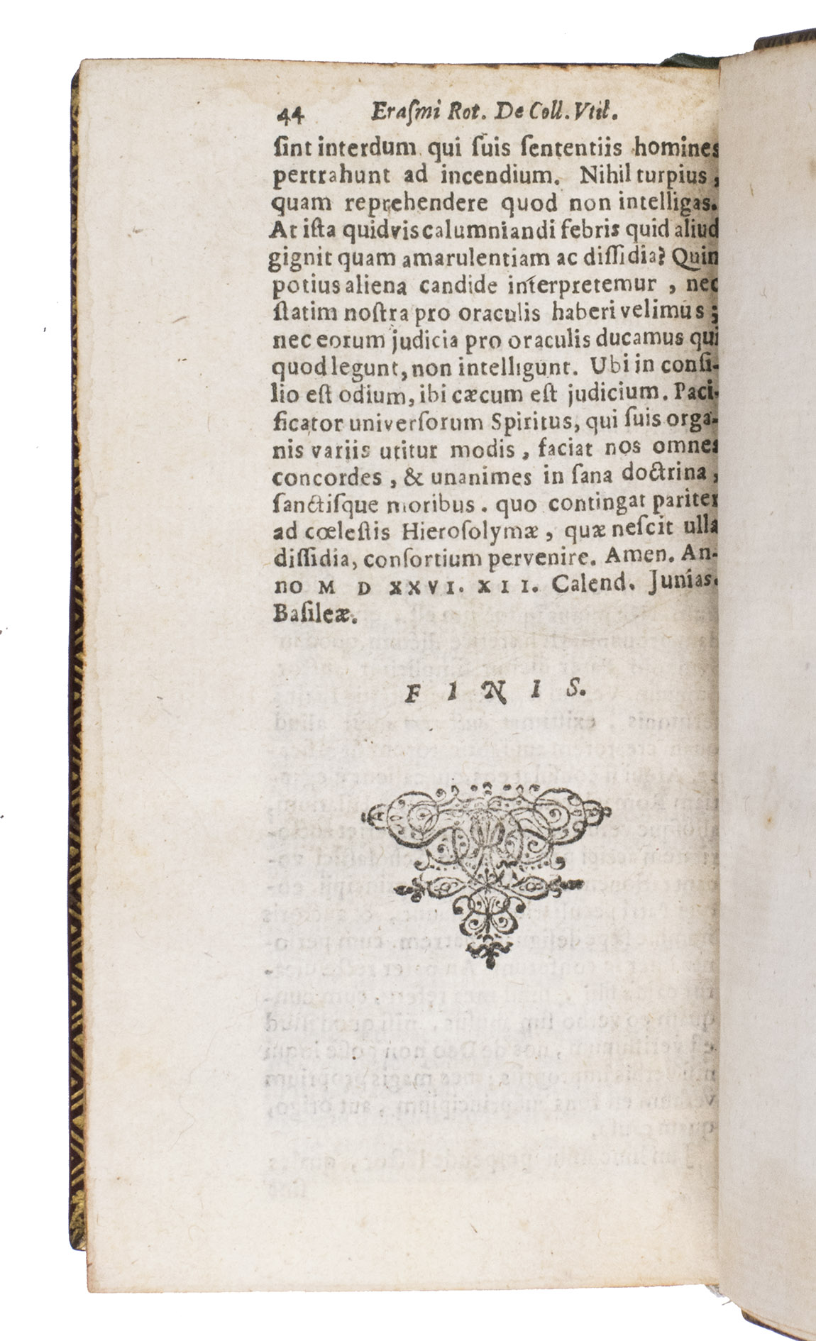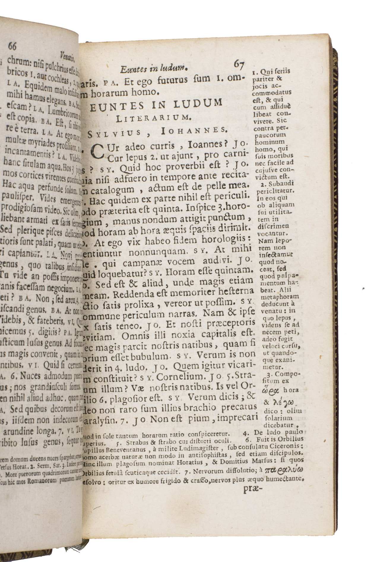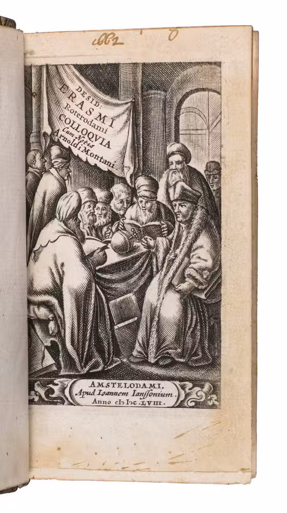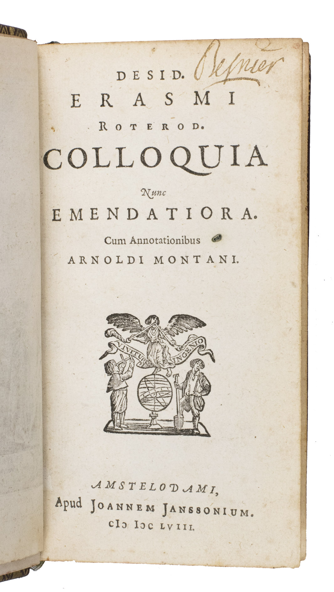 Montanus' edition of a renowned famous Latin schoolbook written by Erasmus, one of the most used Latin schoolbooks for centuries, as it discusses all basic scholarly and moral issues. With Erasmus' preface-letter to Froben at Basel, dated 1524, and the Vita Erasmi preceding the Colloquia, as well as two indices of authors and dialogues. Included at the end is a short essay explaining the usefulness of the book.