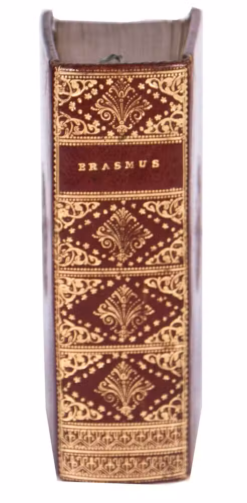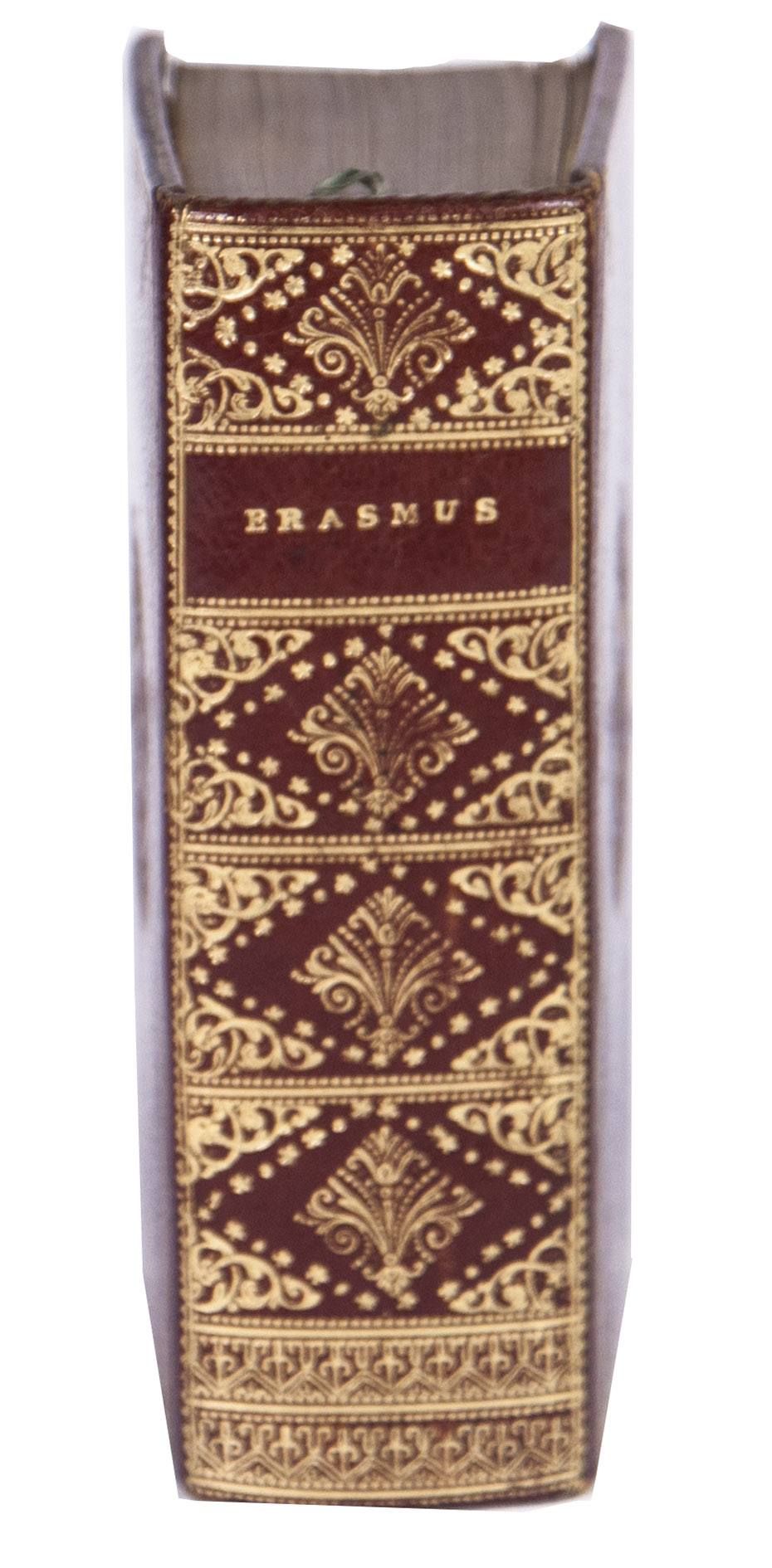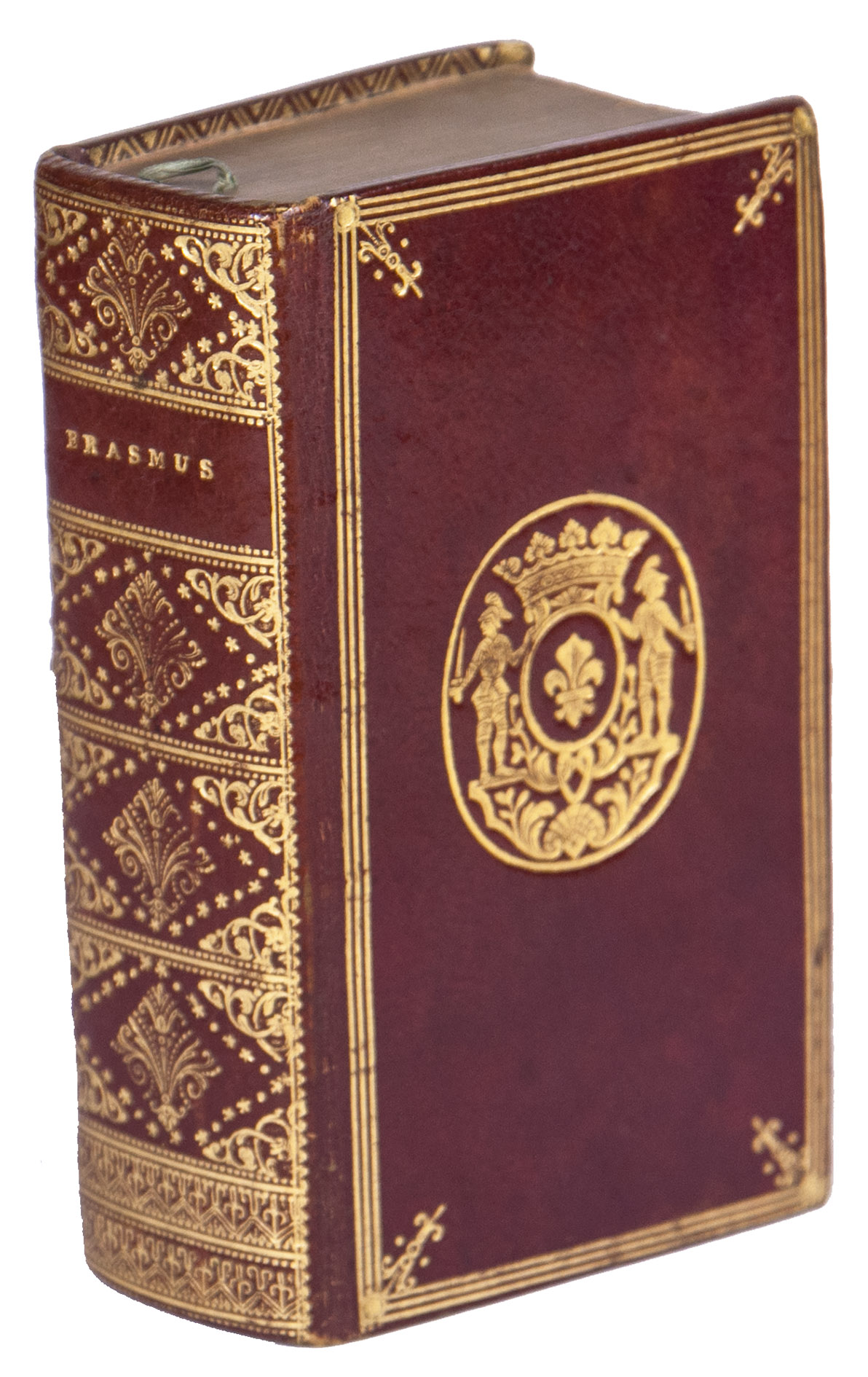 Amsterdam, Joannes Janssonius, 1658. 12mo. With an engraved title page, a full-page engraving showing Erasmus, woodcut decorated initials, and several woodcut head- and tailpieces. 18th-century richly gold-tooled red morocco, both boards show a triple fillet frame with small cornerpieces in the inside corners and an oval armorial centrepiece (crowned fleur-de-lis flanked by two knights), gold-tooled spine with "Erasmus" lettered in gold, gold-tooled board edges and turn ins, gilt edges, marbled endpapers. [1], [1 blank], [1], [1 blank], [20], 820, 44 pp.