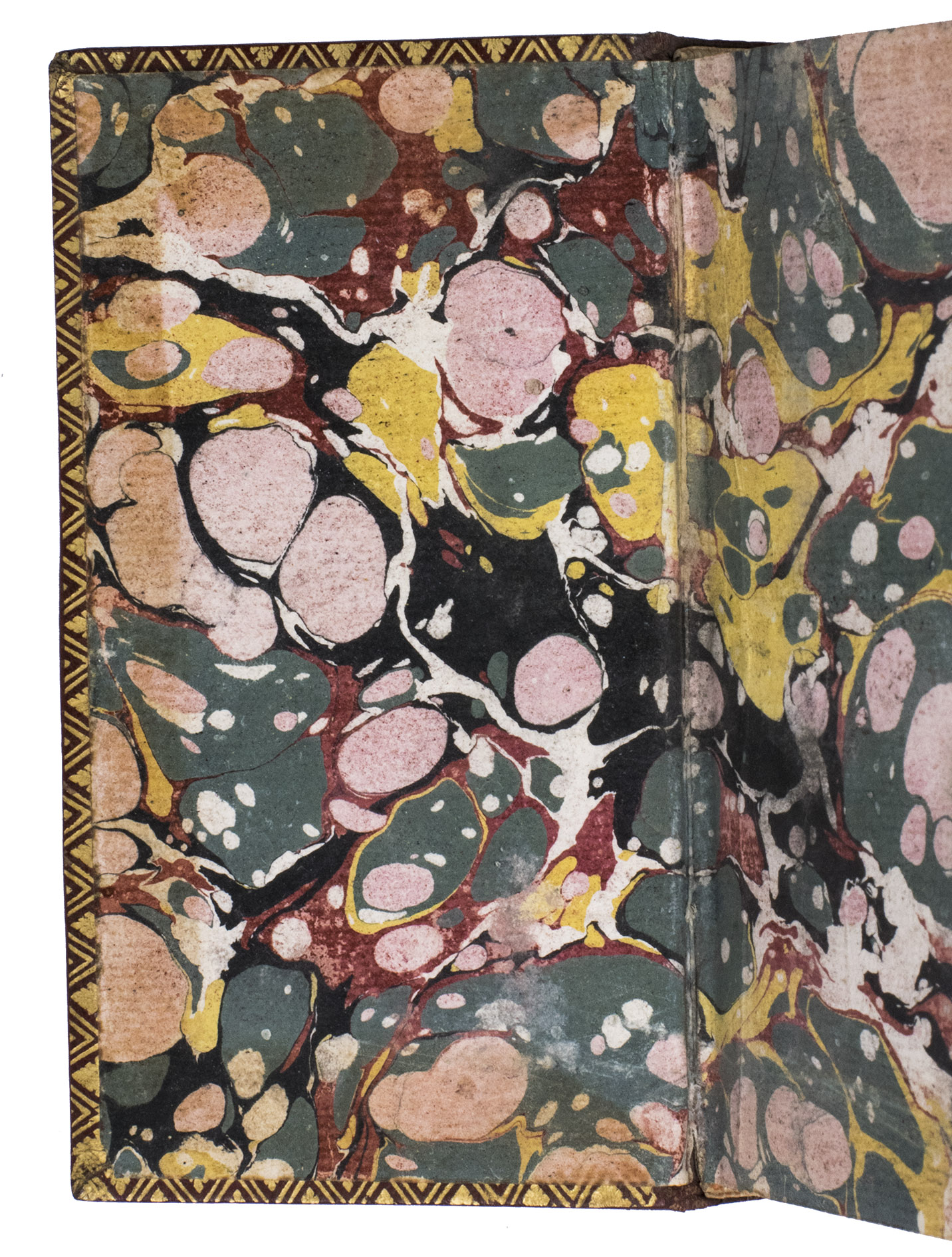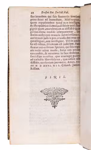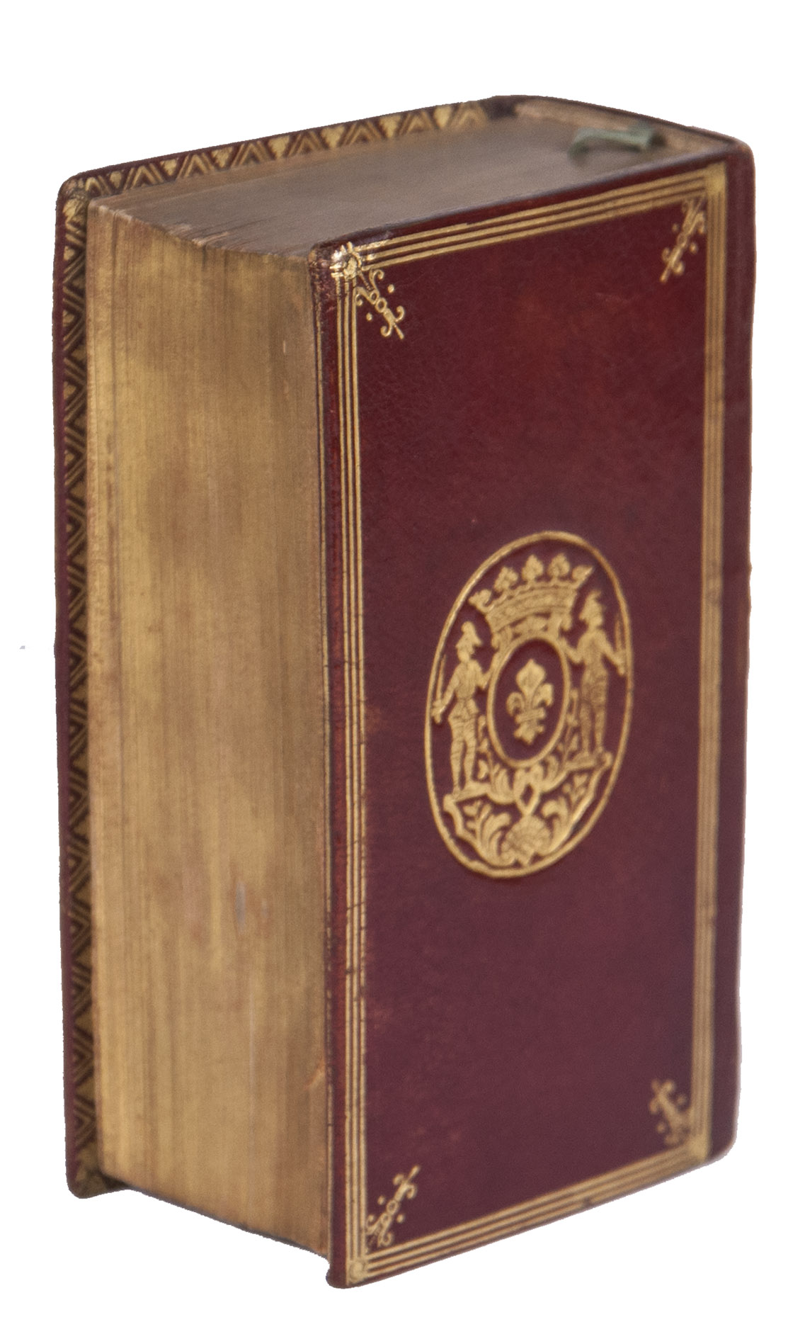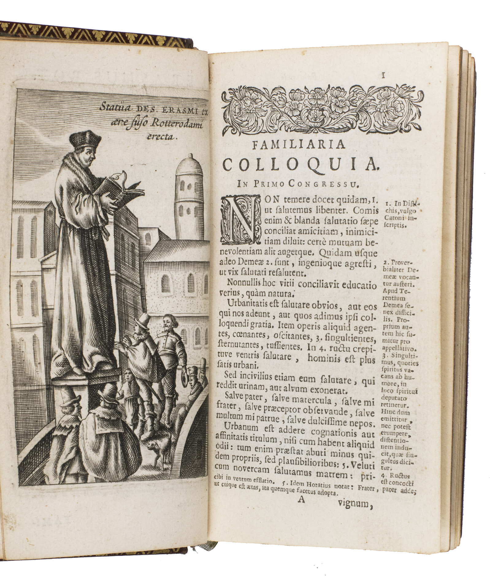 Amsterdam, Joannes Janssonius, 1658. 12mo. With an engraved title page, a full-page engraving showing Erasmus, woodcut decorated initials, and several woodcut head- and tailpieces. 18th-century richly gold-tooled red morocco, both boards show a triple fillet frame with small cornerpieces in the inside corners and an oval armorial centrepiece (crowned fleur-de-lis flanked by two knights), gold-tooled spine with "Erasmus" lettered in gold, gold-tooled board edges and turn ins, gilt edges, marbled endpapers. [1], [1 blank], [1], [1 blank], [20], 820, 44 pp.