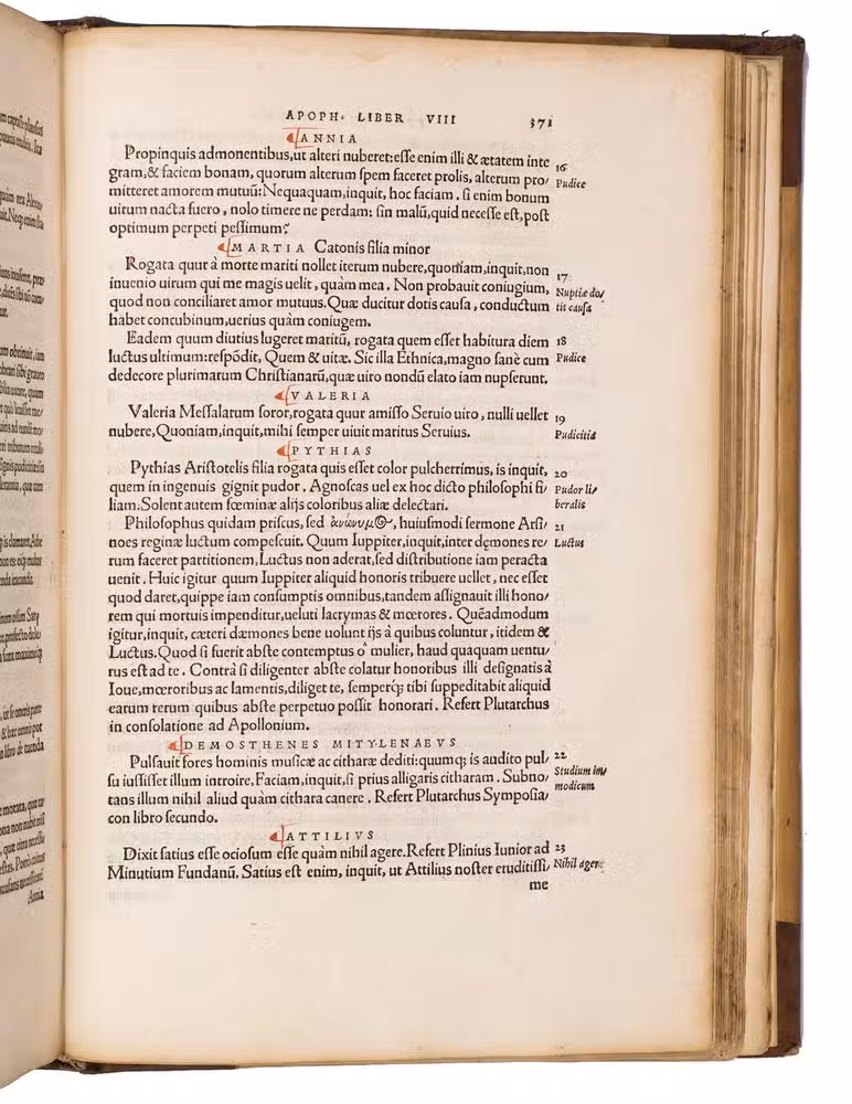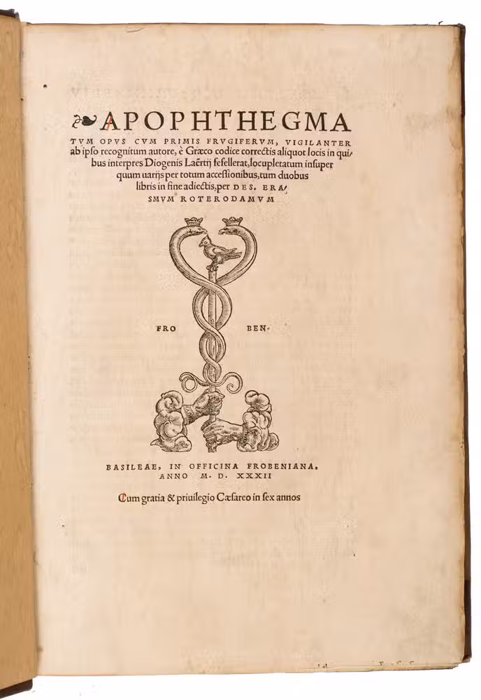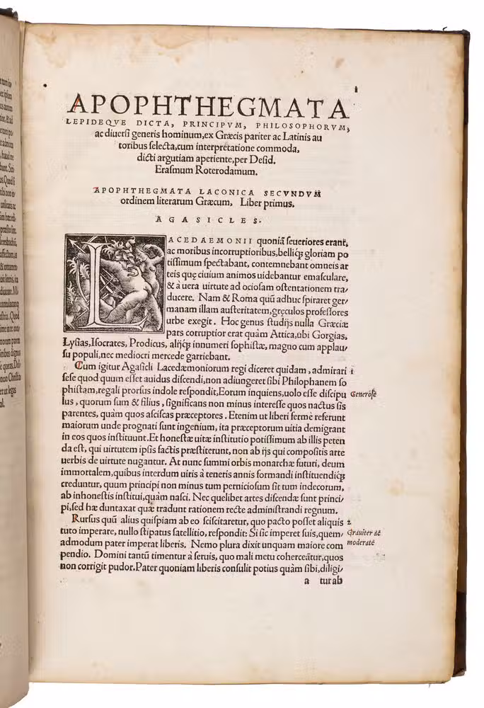 Apophthegmata are concise, witty, and often morally pointed sayings or anecdotes attributed to notable historical figures, valued for the ethical and rhetorical lessons they convey. In his Institutio principis christiani (1516), Erasmus famously advised that the first secular work a prince should read was Plutarchs Apophthegmata. He took this advice to heart by compiling his own version, drawing largely from Plutarch and supplementing it with excerpts from classical authors such as Quintilian, Suetonius, Athenaeus, Valerius Maximus, Diogenes Laertius, Philostratus, Macrobius, and Stobaeus.