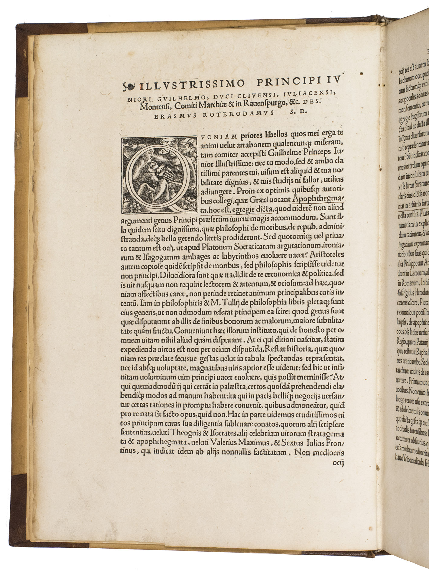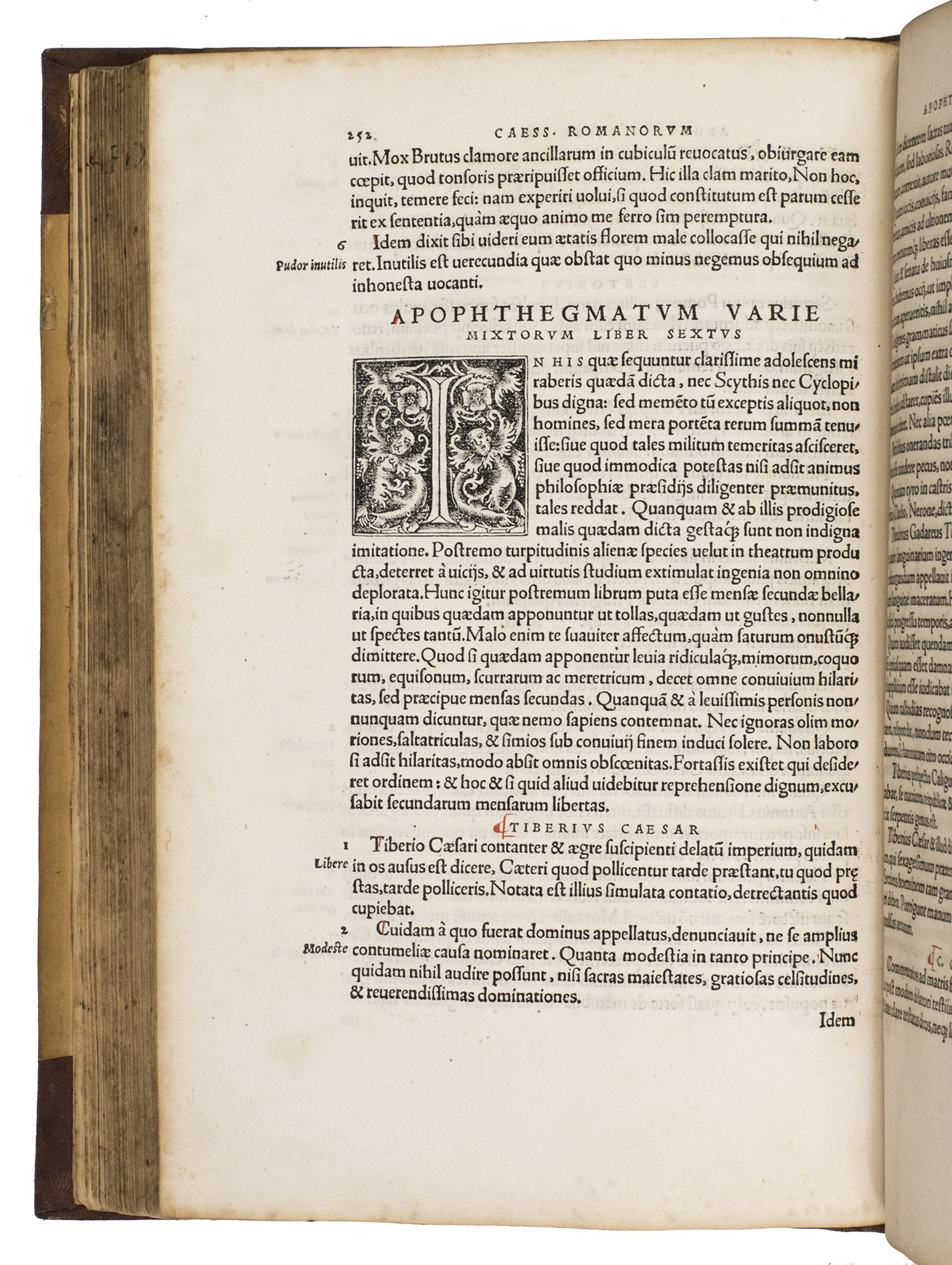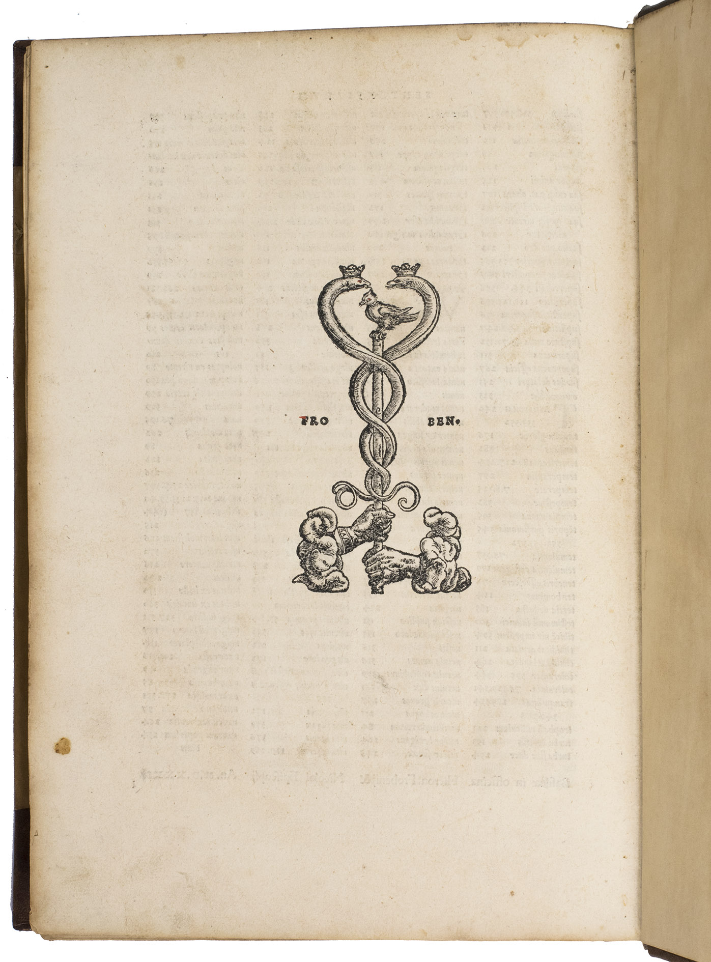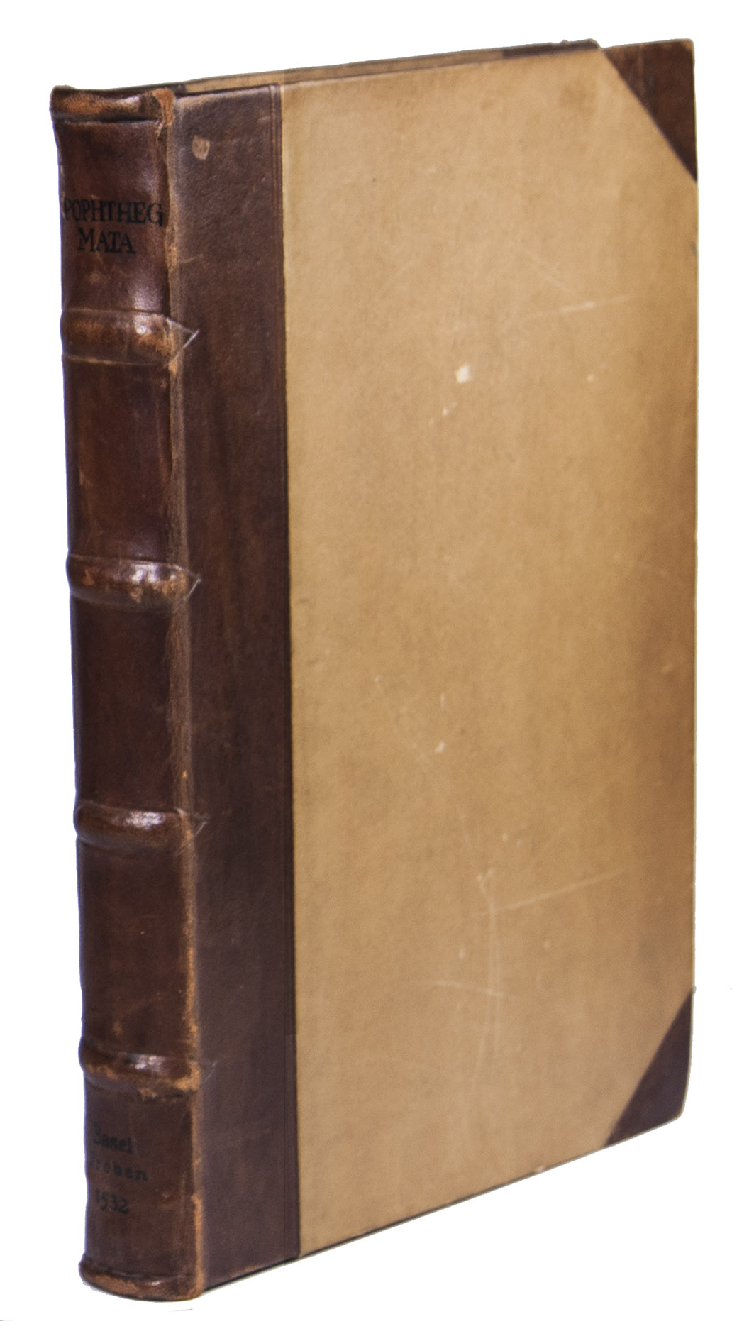 Basel, Froben Office (Hieronymus Froben & Nicolaus Episcopius), 1532, Small fol (20 x 30.9 cm). With 9 decorated metalcut initials, a decorated woodcut initial, and a woodcut printers device on the title page and final page. 19th-century blind-tooled brown half morocco. [8], 401, [1], [14] pp.